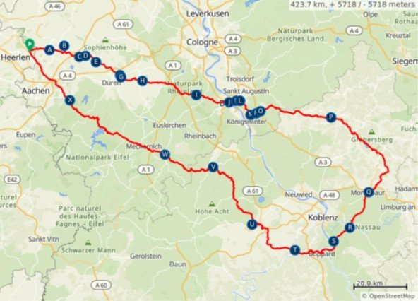 Om reizen per trein op de eerste fietsdag mogelijk te maken vertrekken we op zaterdag om 10:00! Deze keer vanaf Boerderijcamping De Limburgerhof in Landgraaf. Op zaterdag door het Rijnland via de dalen van Worms, Ruhr en Rijn naar een camping in het Siebengebirge. Op zondag door het Westerwald naar een camping aan de Lahn. Maandag maken we een uitstapje door de Taunus, fietsen een stukje langs de romantische Rijn, door de Hunsrück over de Moezel en via de Vulkaaneifel naar een camping in de buurt van de Ahr. Op dinsdag via de dalen van de Ruhr en de Worms weer terug naar Landgraaf.