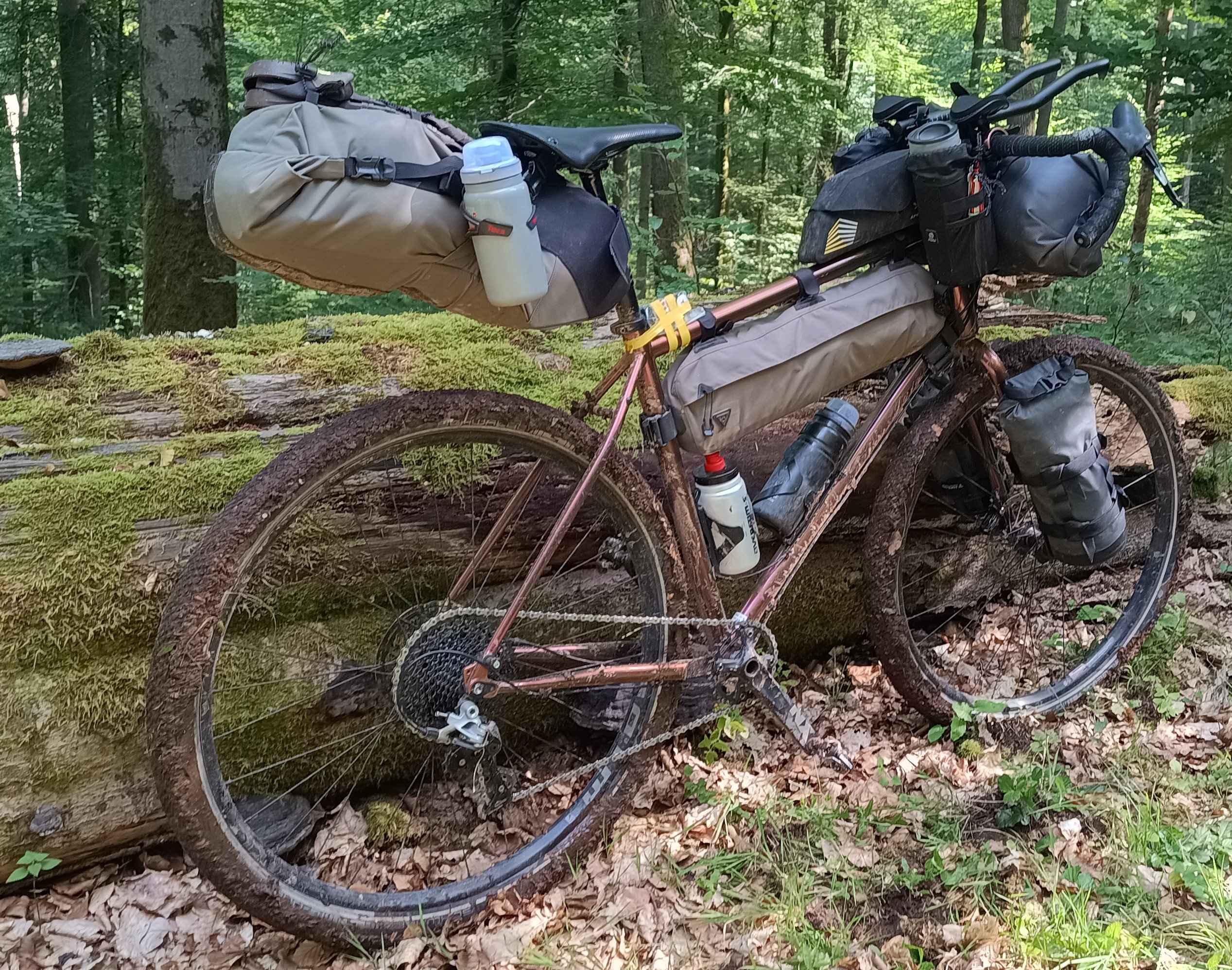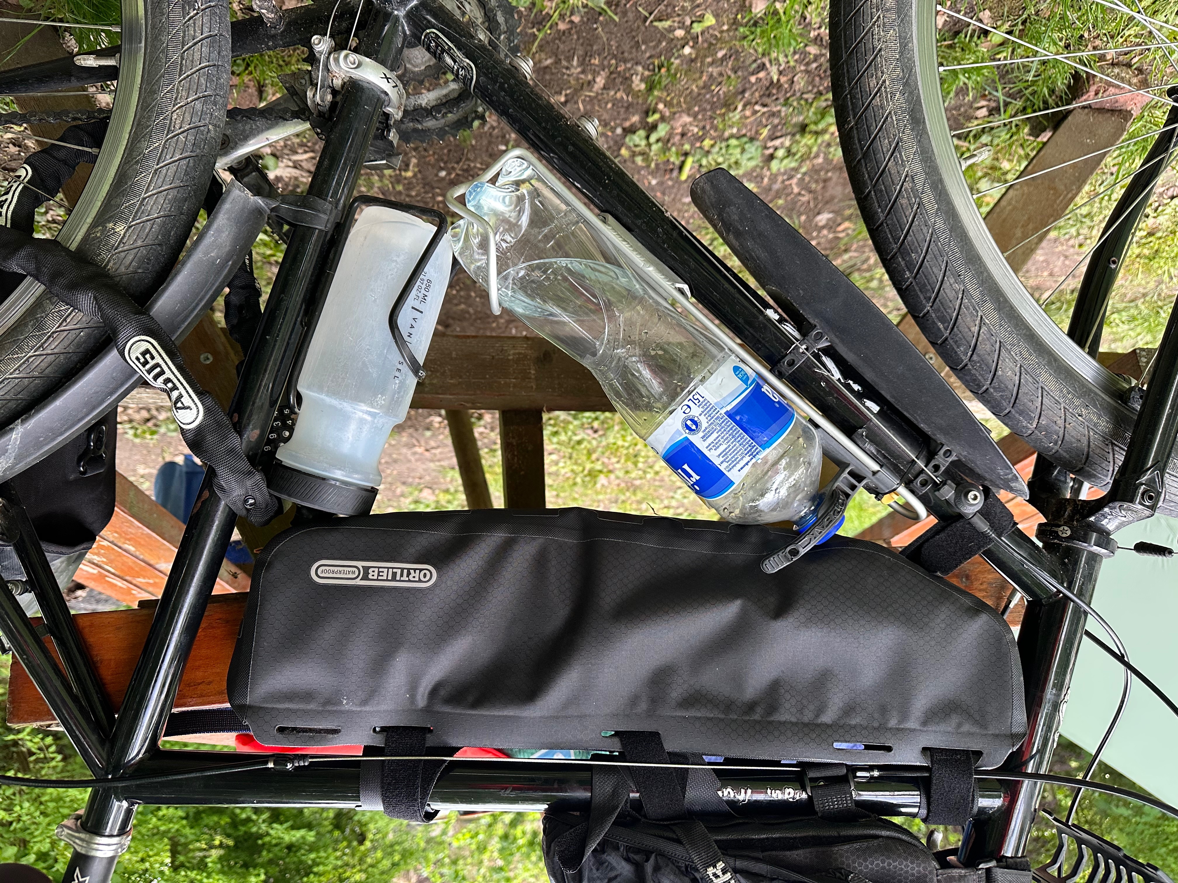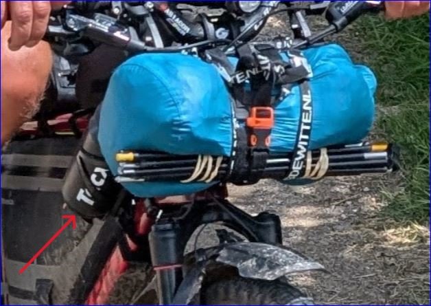 Maar dan neem je dus een frametas die je hele frame vult om er vervolgens water in te gaan stoppen. Echt zo’n voorbeeld van bikepacking dat zijn doel voorbij schiet. Ik geef de voorkeur aan hybride traditioneel en bikepacking opties maar dan moet het wel functioneel zijn. Dus in mijn geval een kleine frametas met genoeg ruimte voor water eronder. Erboven zie ik nu 😜