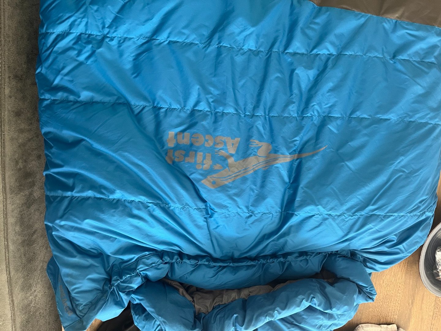 Te koop donzen slaapzak van het Zuid Afrikaanse outdoormerk First Ascent.