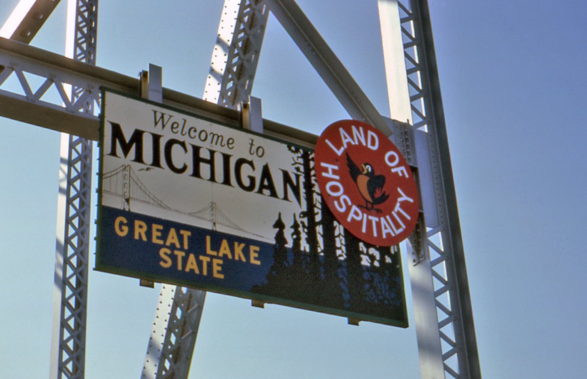 De brug is de Ambassador Bridge, over de Detroit River. De grens USA-Canada ligt in het midden van de rivier.
