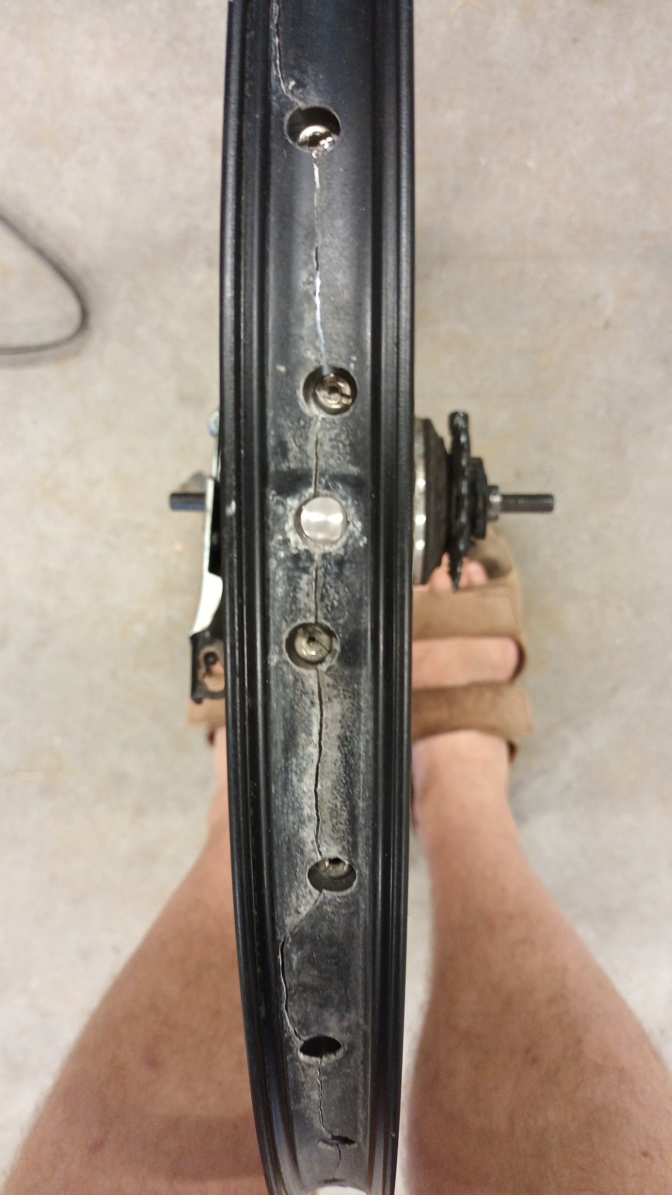 Eveneens bezig met een bakfiets, geheel rondom de velg deze scheurvorming. Dit is wel een vrij oude bakfiets.nl.