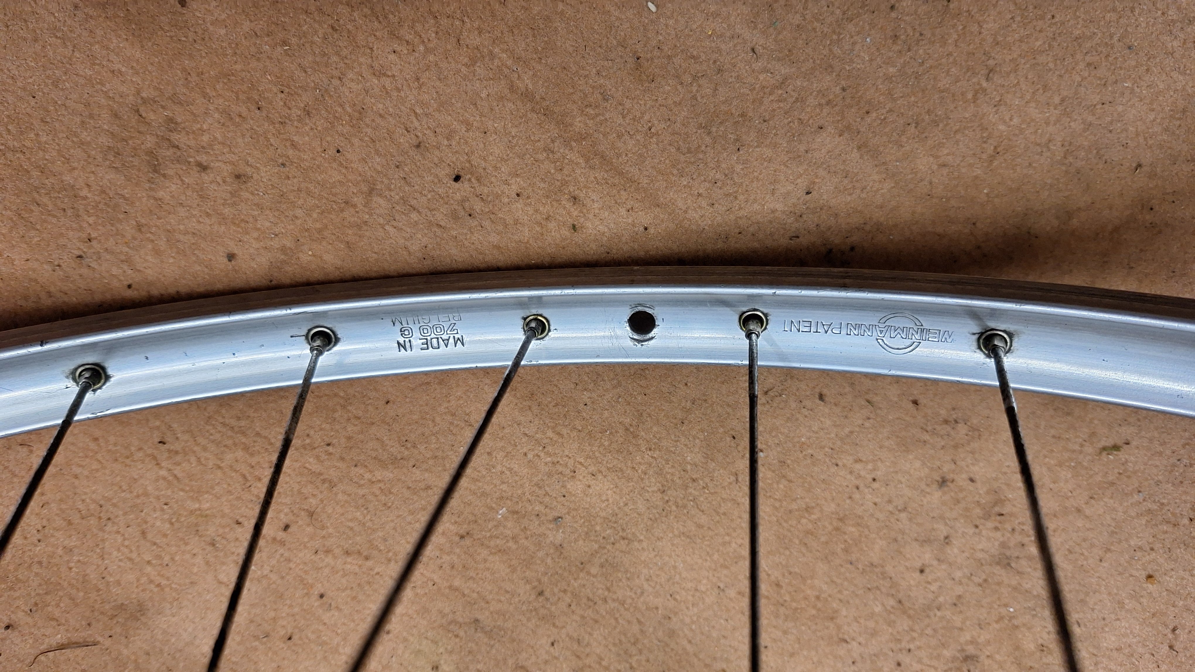 Je ziet een stukje reflectieband van de buitenband uitsteken. De velg is nog net zo recht/krom als pak en beet een jaar geleden. Mijn spaaksleutel past niet op deze nippels, ze zijn dikker dan 3,5.