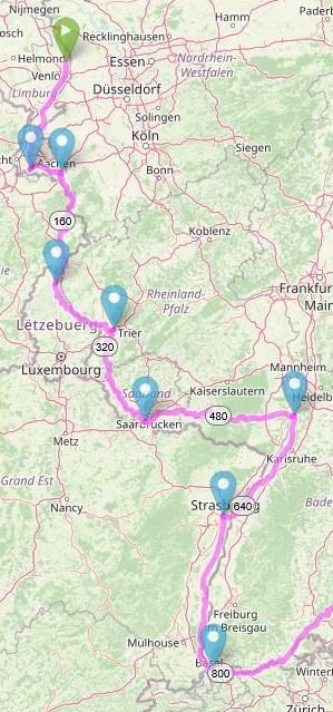 Bedankt voor de uitgebreidde omschrijving. Bij deze optie mis je wel Karlsruhe/Strasbourg en Saarbrucken als je de EV5 pakt of Trier > Koblenz > Mannheim als je de Moezel naar Koblenz pakt vanaf Trier en dan zuidwaards gaat.