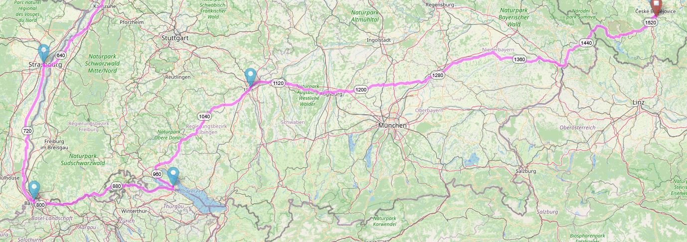 Ik denk dat je mogelijk in Karlsruhe genoeg hebt van het monotone landschap waar de Rijn verworden is tot een kanaal. Je zou dan het Zwarte Woud in kunnen duiken, en er dan bij de BodenSee of DonauEschingen de EV6 op kunnen pakken. In het Zwarte Woud kun je het jezelf moeilijk maken maar dat hoeft niet.