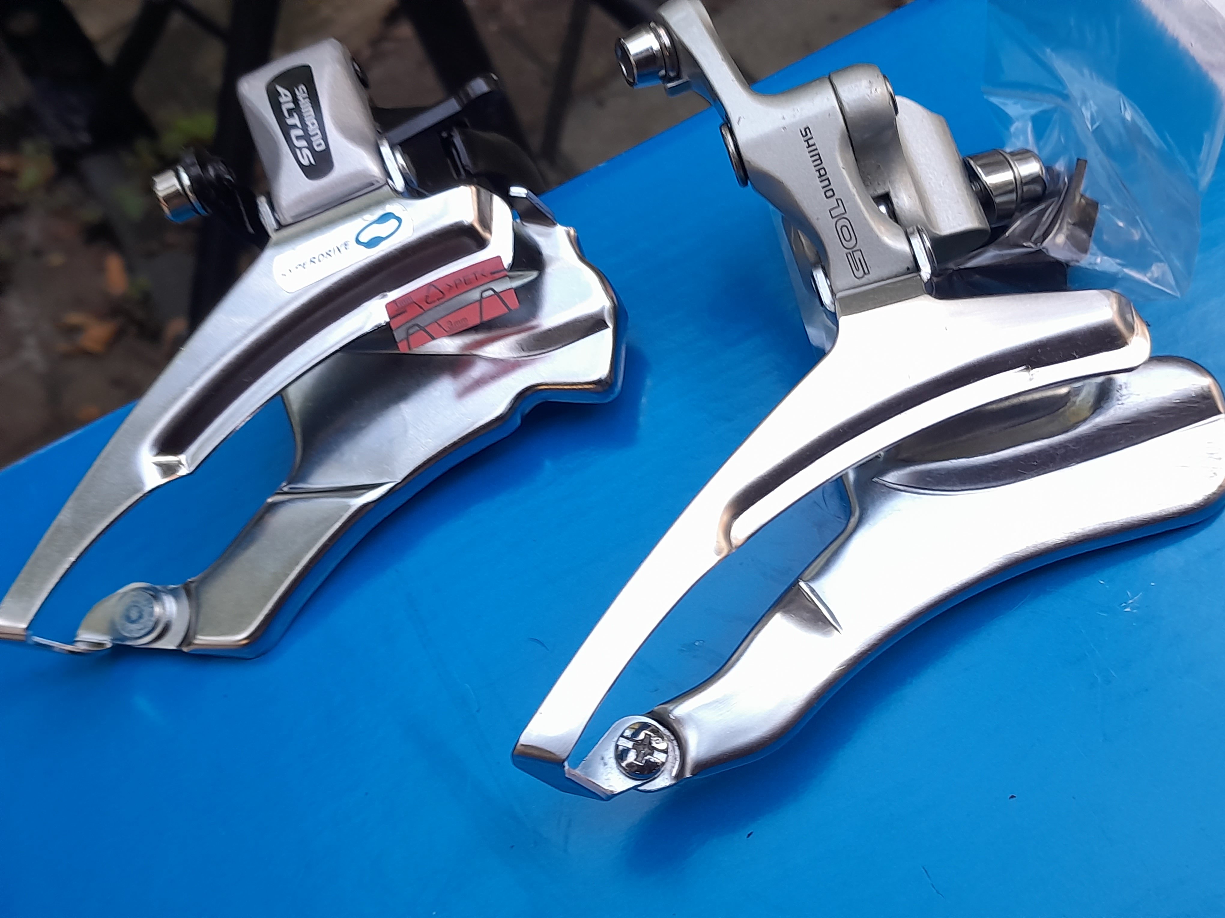 Op de foto liggen twee Shimano voorderailleurs: links het nieuw bestelde exemplaar en rechts van Pierre Noiret. Vreemd is dat de linker derailleur geklonken is en rechts heeft een schroefje. Helemaal geen zin om de kettingpons ter hand te nemen. Die van Pierre is daarom nu gemonteerd. Draait helemaal goed! Het linker exemplaar bewaar ik wel voor later. Gaat nu regenen, nog geen testritje gemaakt.