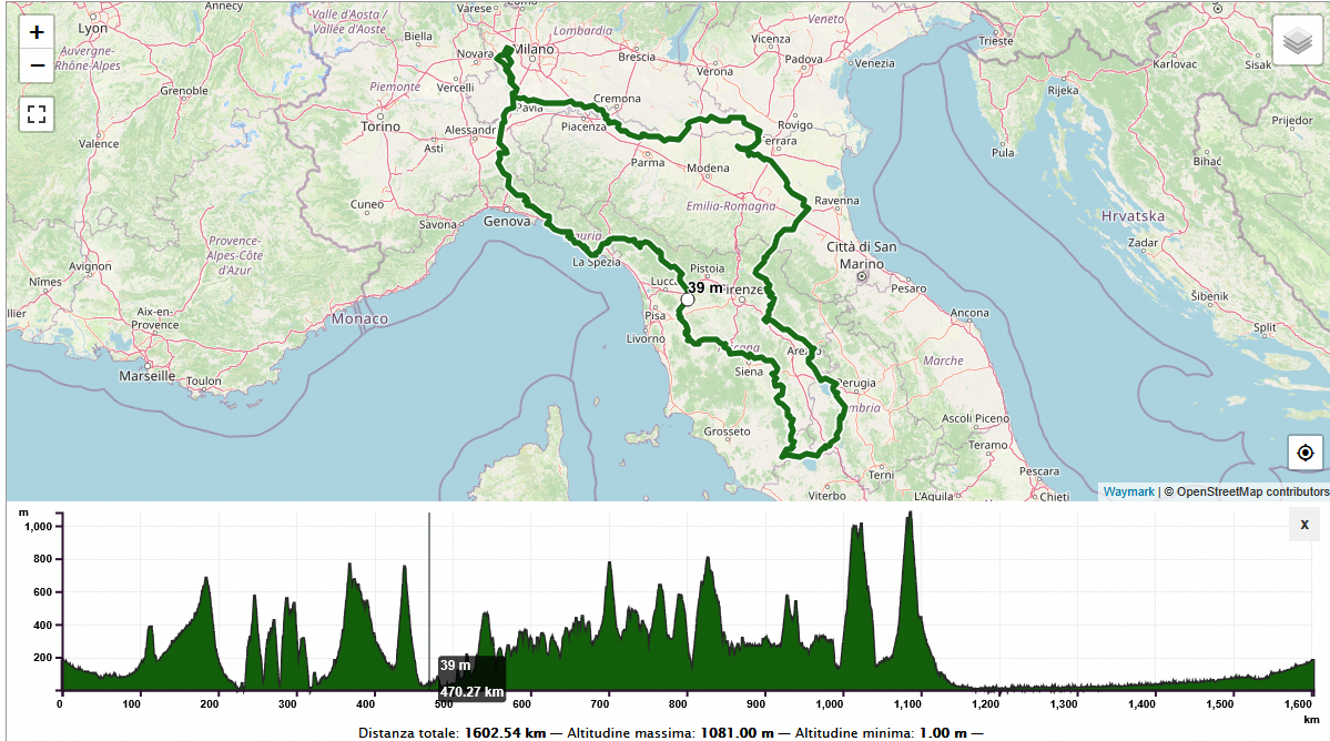 Nu kwam ik de volgende rondrit tegen wat eigenlijk een evenement is voor wielrenners: https://1001migliaitalia.it/