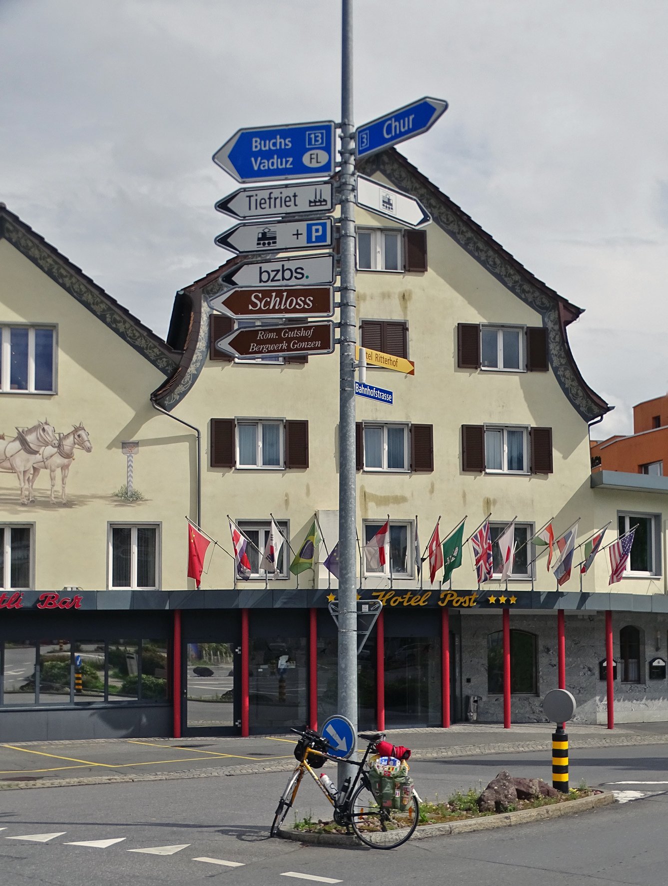 Jouw "rode druppel" staat 5 meter te ver voorbij van waar ik stond, maar keur ik helemaal goed. Inderdaad Sargans, ik fietste hierna naar een belangrijk kruispunt (foto) om dan de Rheinstrasse in te gaan en langs de gekanaliseerde Rijn verder naar Vaduz. Heerlijke fietstocht!