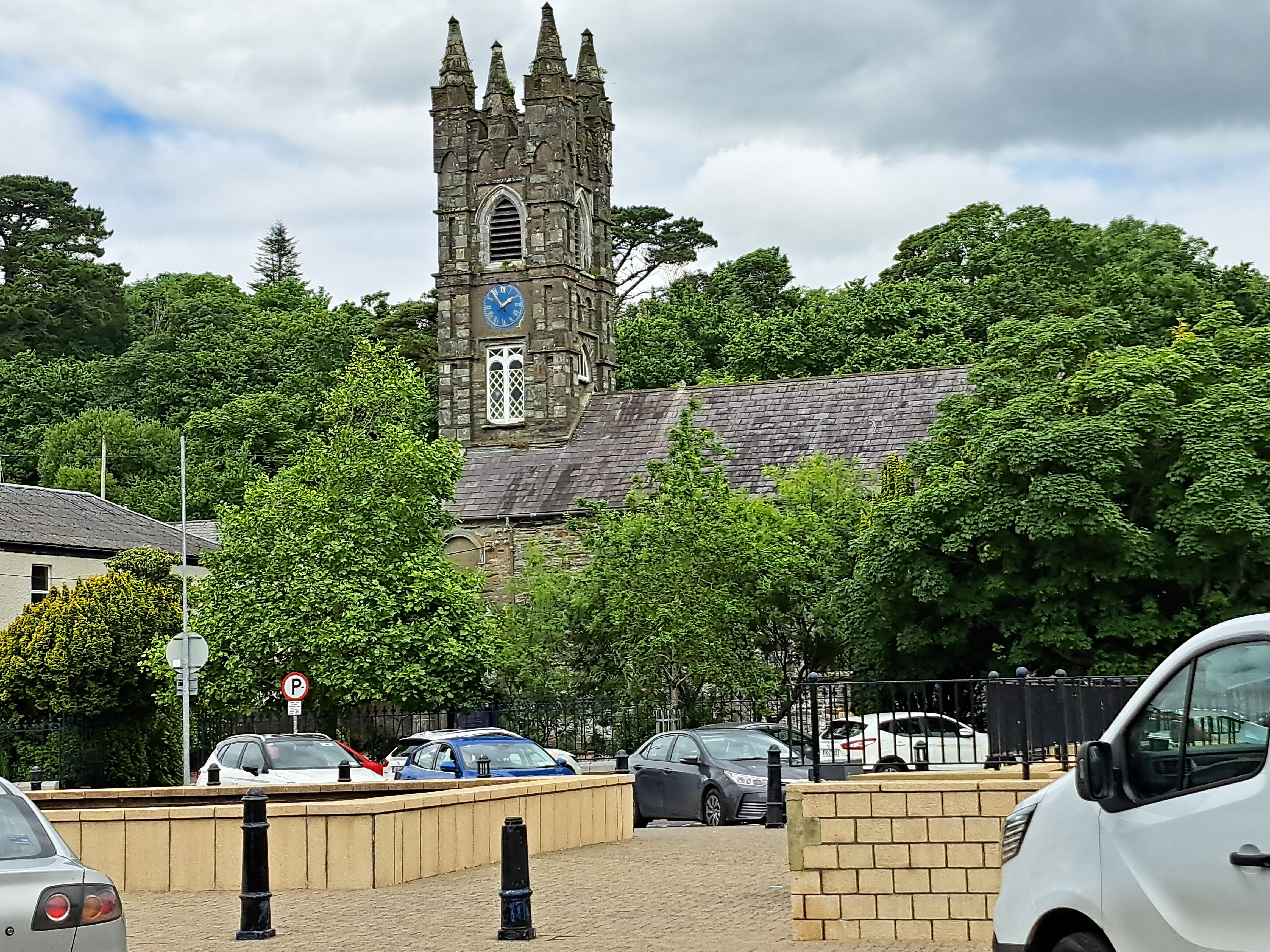 De auto's hebben het stuur rechts. Die witte Nissan heeft een witte nummerplaat, in Engeland zijn die geel aan de kont. Aan de heerlijk ruige bouw van de kerktoren te zien, kan het alleen maar Ierland zijn.