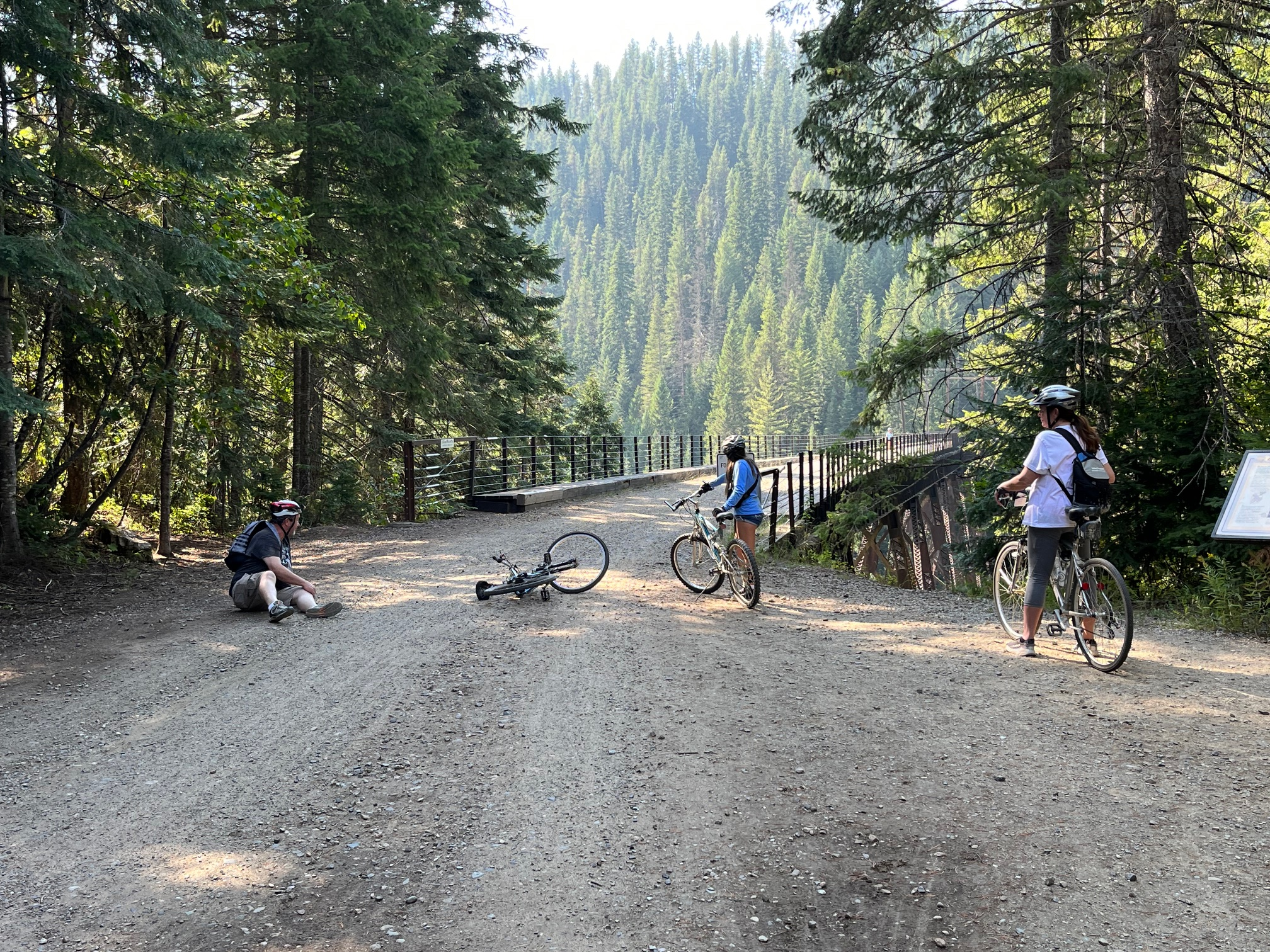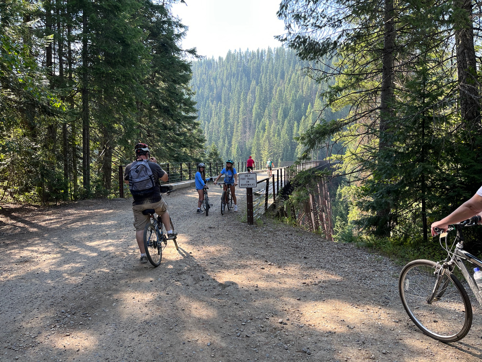 Je ziet veel stuntelende fietsers op de Hiawatha Trail. De meesten starten, veelal op huurfietsen, op het West Portal, 1270 m, en dalen moeiteloos af over het 'railroad grade' pad (1,6%) naar het Pearson Portal, 970 m, waar een shuttle bus klaar staat om ze terug te brengen naar het startpunt. Ik reed tegen de stroom in.