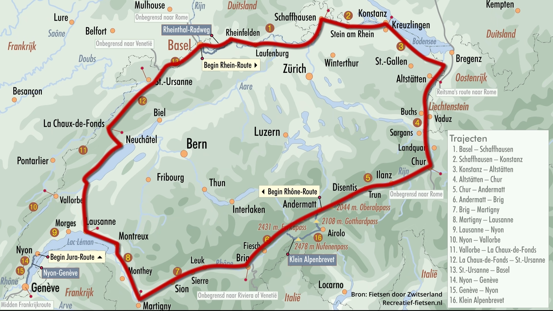 De route heb ik op het kaartje getekend. Het gaat hier om 950km en 9200hm van Bazel met de klok mee eindigend in Bazel in augustus 2025. Ik heb een impressie filmpje gemaakt van 3 minuten: