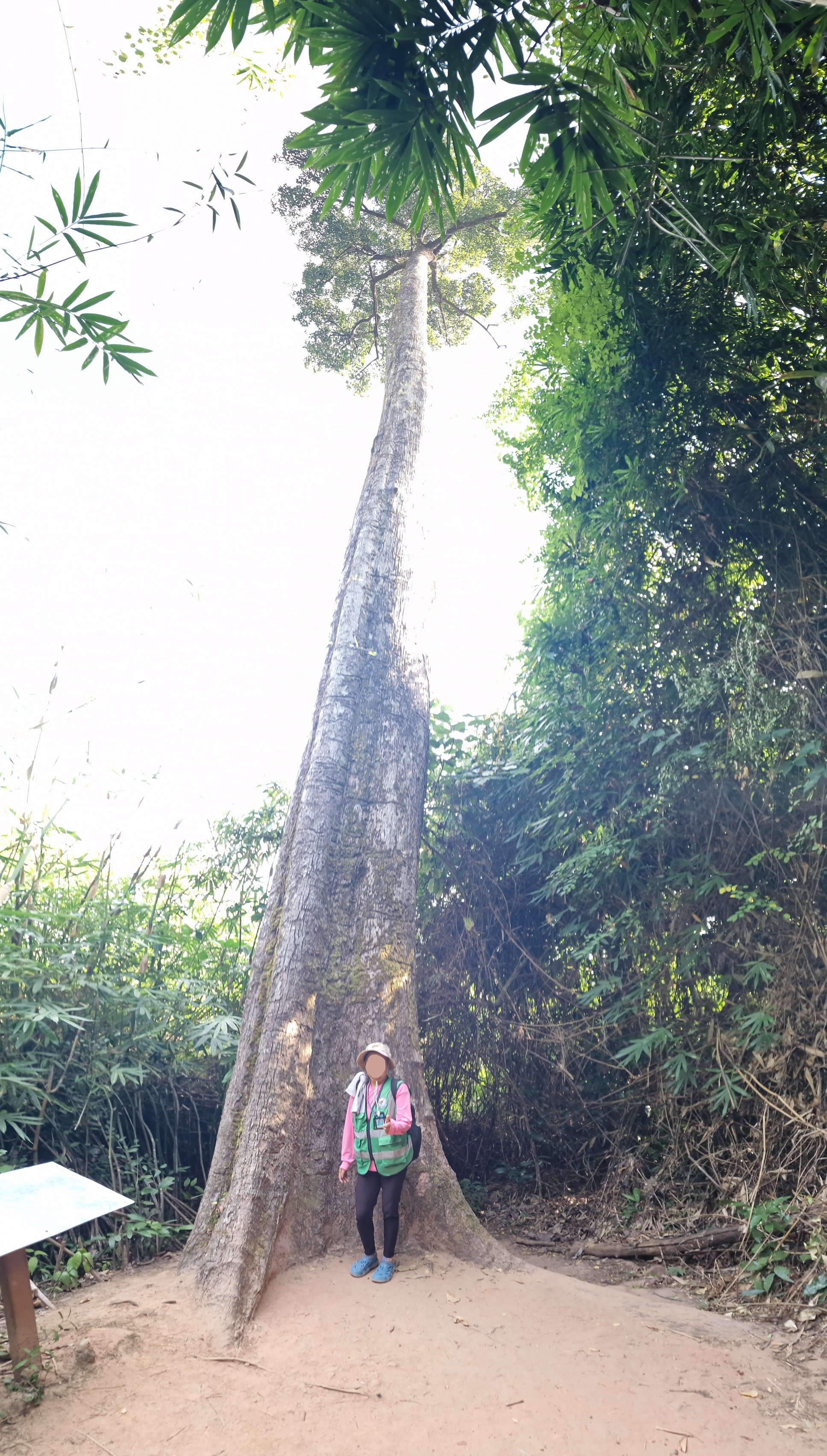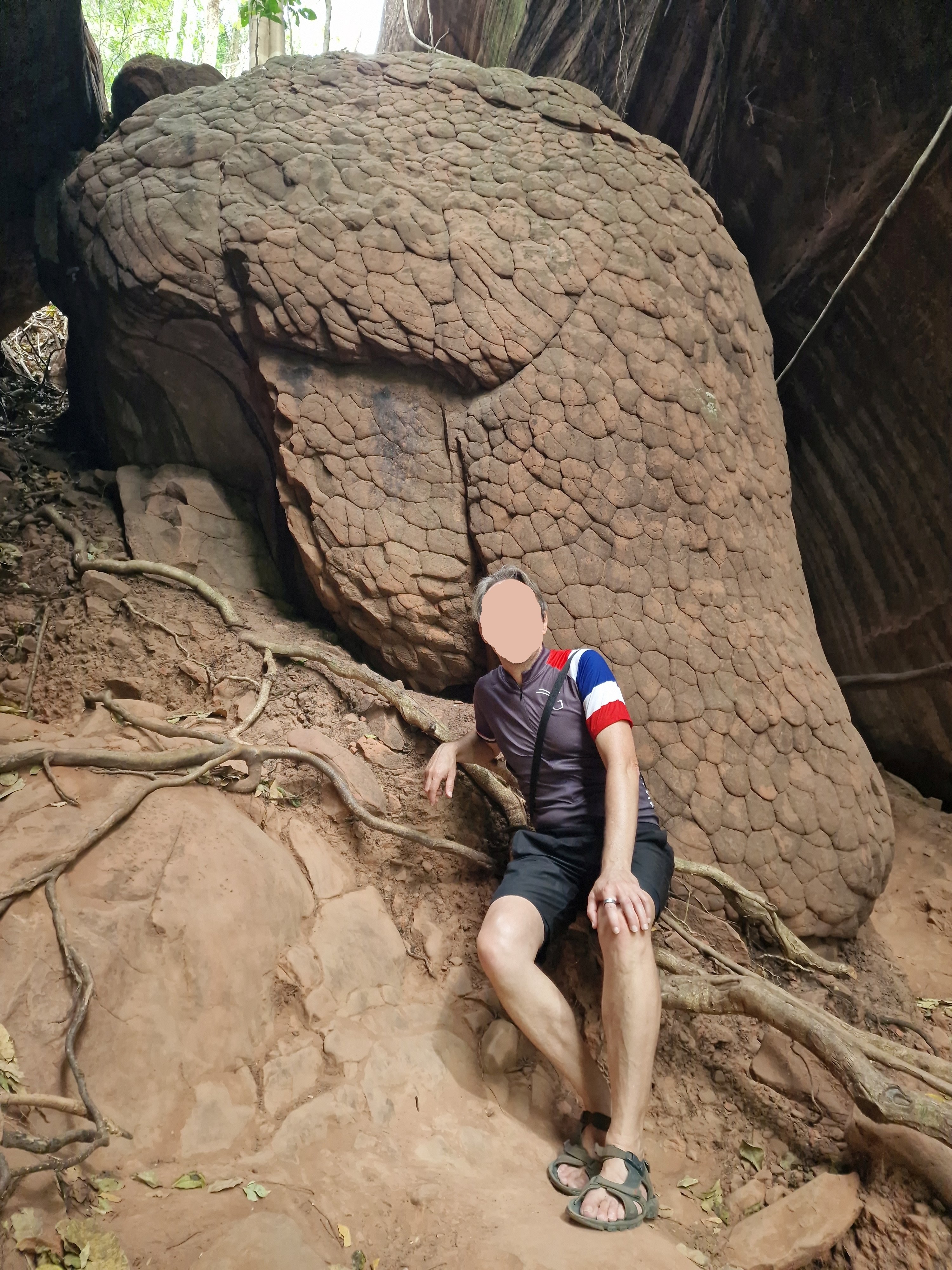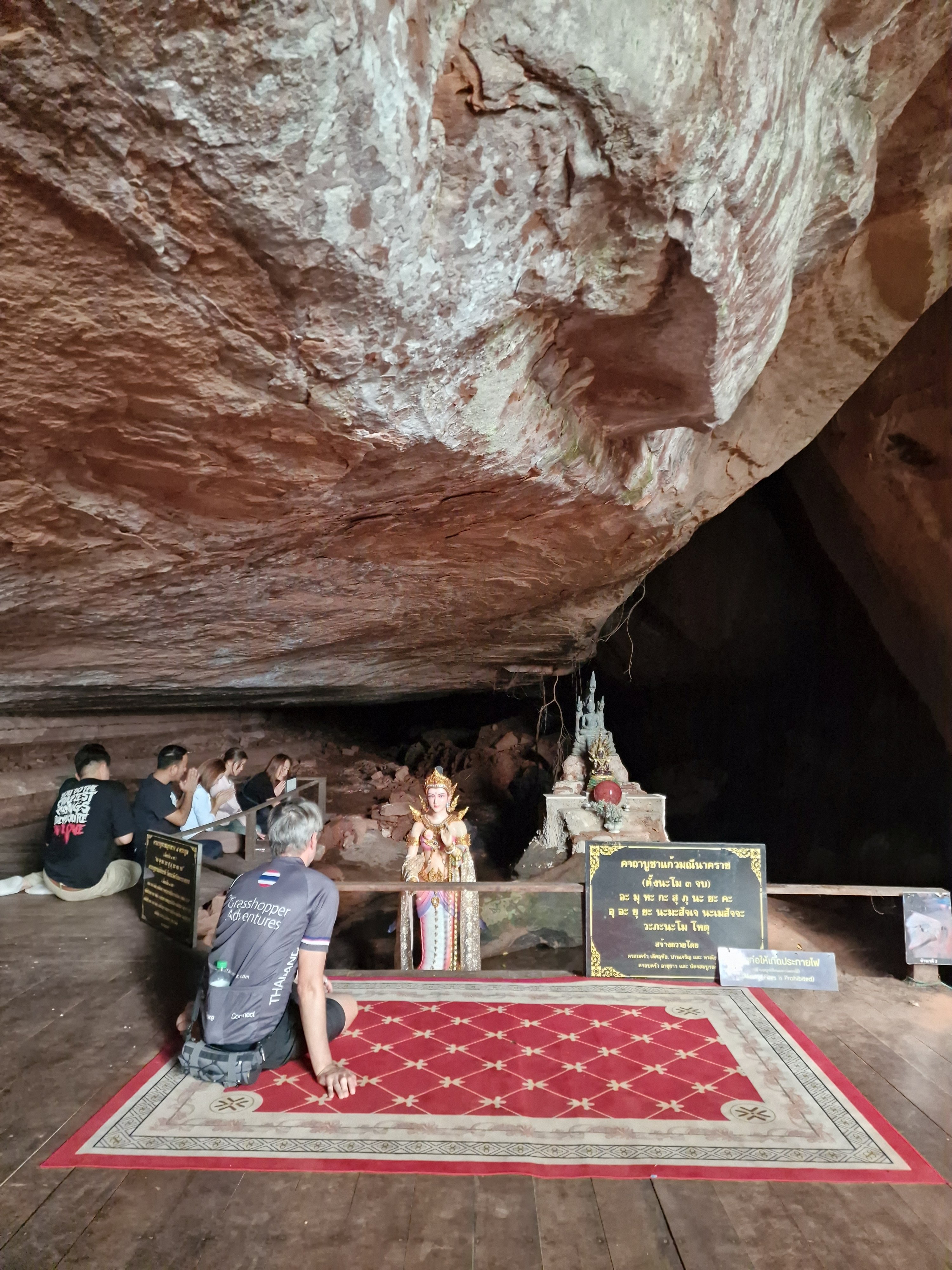 Vandaag plan ik een minder lange rit zodat er voldoende tijd is om Phu Langhka National Park te bezoeken, een steenworp (10 km) van mijn hotel. De belangrijkste attracties van dit park zijn de NaKee Cave en de verschillende merkwaardige rotsblokken die op geschubde slangenkoppen lijken. Een waterval en viewpoint maken het af. Ik parkeer mijn fiets nabij de welkomstgebouw waar ik ook mijn toegangsticket koop. Ik kijk wat vertwijfeld rond en vind dan toch de start van de wandeling naar Nakee Cave. Ik stap gezwind over een kronkelend asfaltpad dat me tussen bamboebossen leidt. Een parkwachter aan de kant van de weg spreekt me aan in het Thais en maakt een soort verbodsteken met zijn armen. Ik behelp me met mijn vertaal-app en kom te weten dat het verplicht is een gids te nemen aan de ingang van het park. Oh! Terug naar af. Aan de gidsenkiosk vraag ik of ik een gids kan krijgen, hoeveel dit kost, en hoe lang de geleide wandeling duurt. De dame zegt dat het drie uur duurt, 500 bath kost en ze wijst naar een schattig oud dametje met roze trui, groen veiliheidshesje, legging, pruisisch-blauwe crocs, rugzak en expeditiehoedje die de begeleiding op zich zou nemen. Ik ben behoorlijk ongevoelig voor mode, maar dit doet toch een beetje pijn aan de ogen. Zo’n bejaardentour is niet wat ik in gedachten had – ik zou dan pas terug op de fiets zitten tegen de middag, waarna ik nog een kleine 100 kilometer zou willen rijden. Vertaal-appsgewijs vertel ik dat drie uur wat lang is gezien mijn geplande fietsrit. Daarop volgt een geanimeerd gesprek tussen de receptiedame en het gidsje, met veel gelach, ‘oooh’s’ en ‘aaah’s’ en ik kan nog net ‘hundred kiloooo’ onderscheiden, gevolgd door een ‘ooooh’ van het gidsje. Die laatste knikt vastberaden in mijn richting en de receptiedame laat me weten dat mijn gids de klus kan klaren in 2 uur. OK, dat maakt me benieuwd – ik stem toe. Ik smelt ook wel een beetje van de gulle vriendelijke glimlach van mijn nieuwe gids.