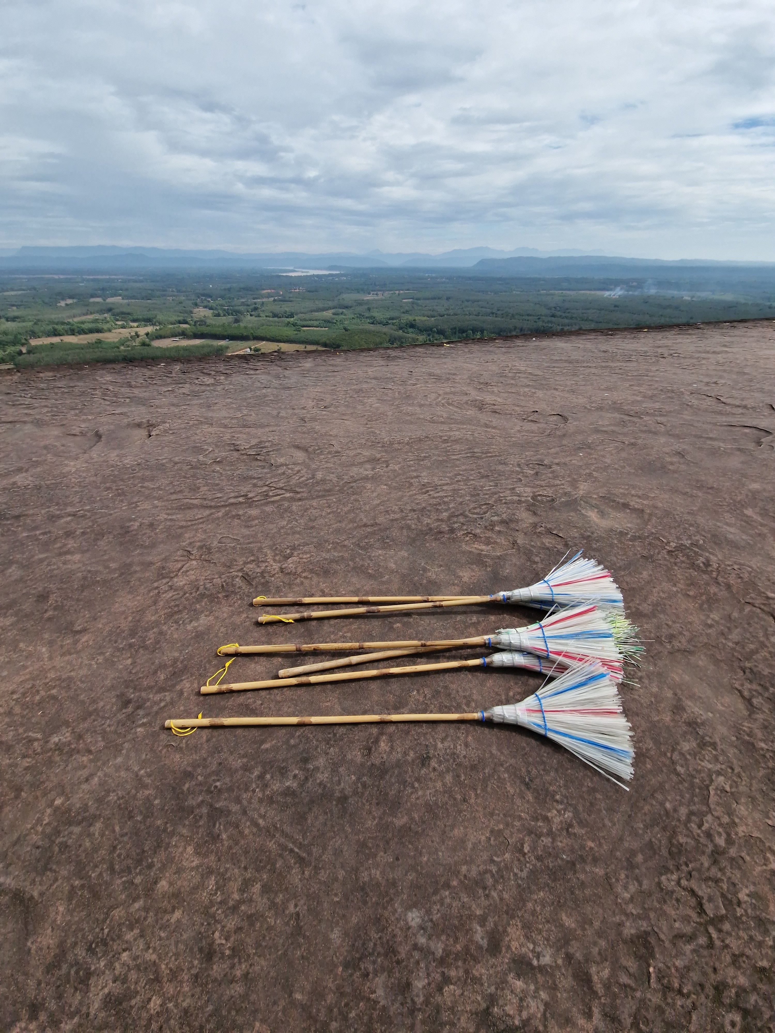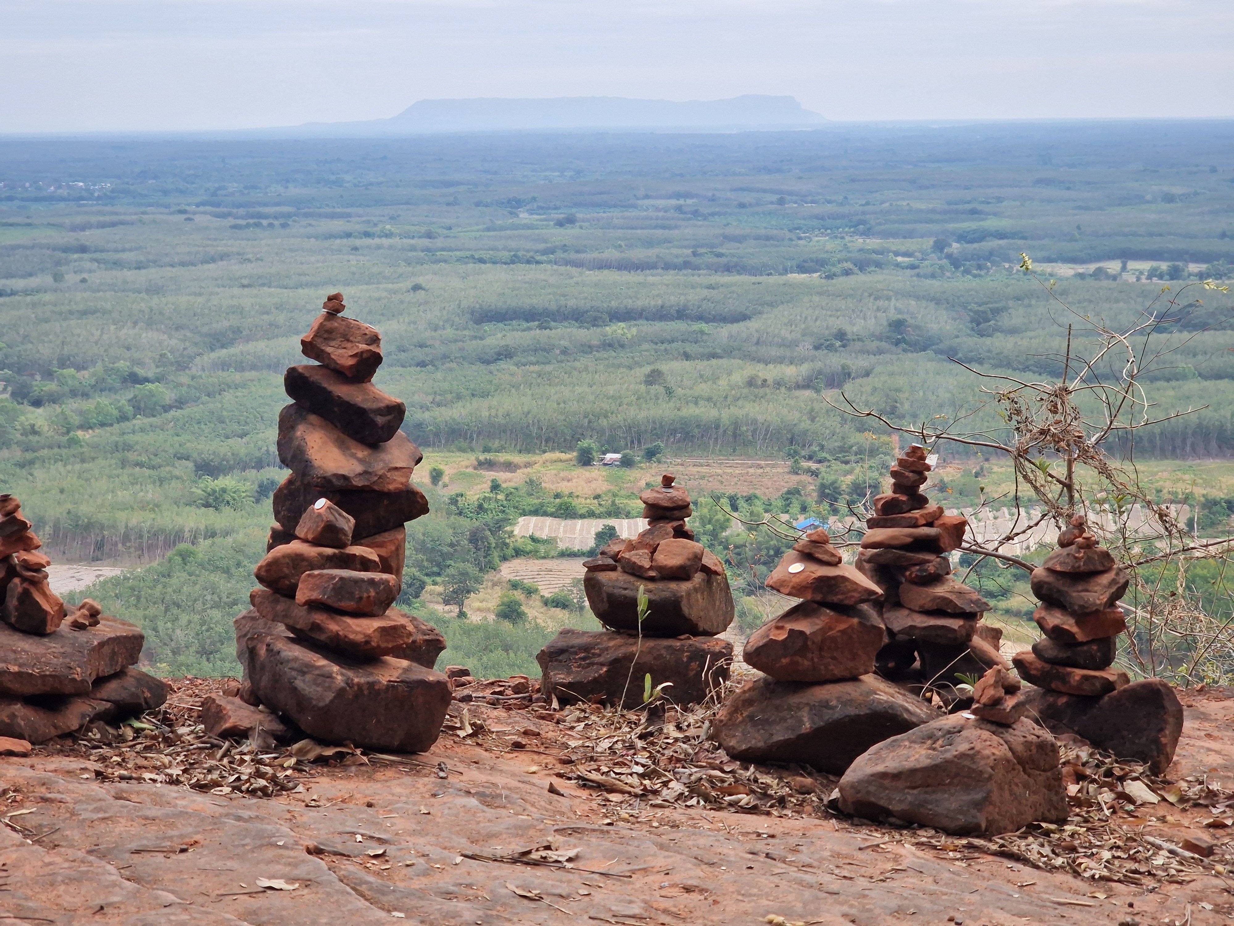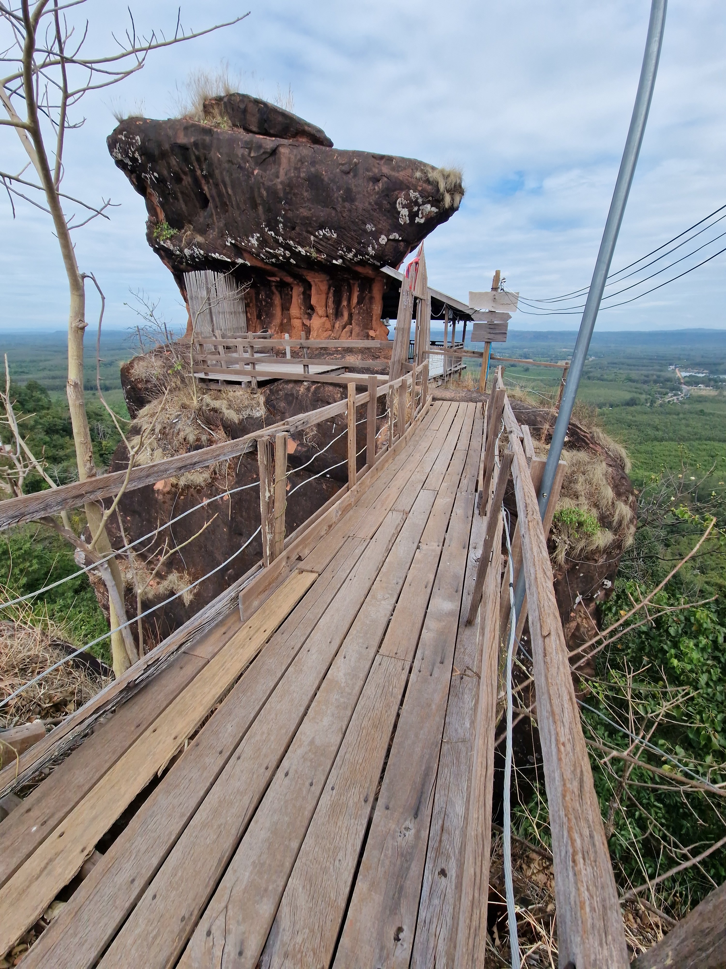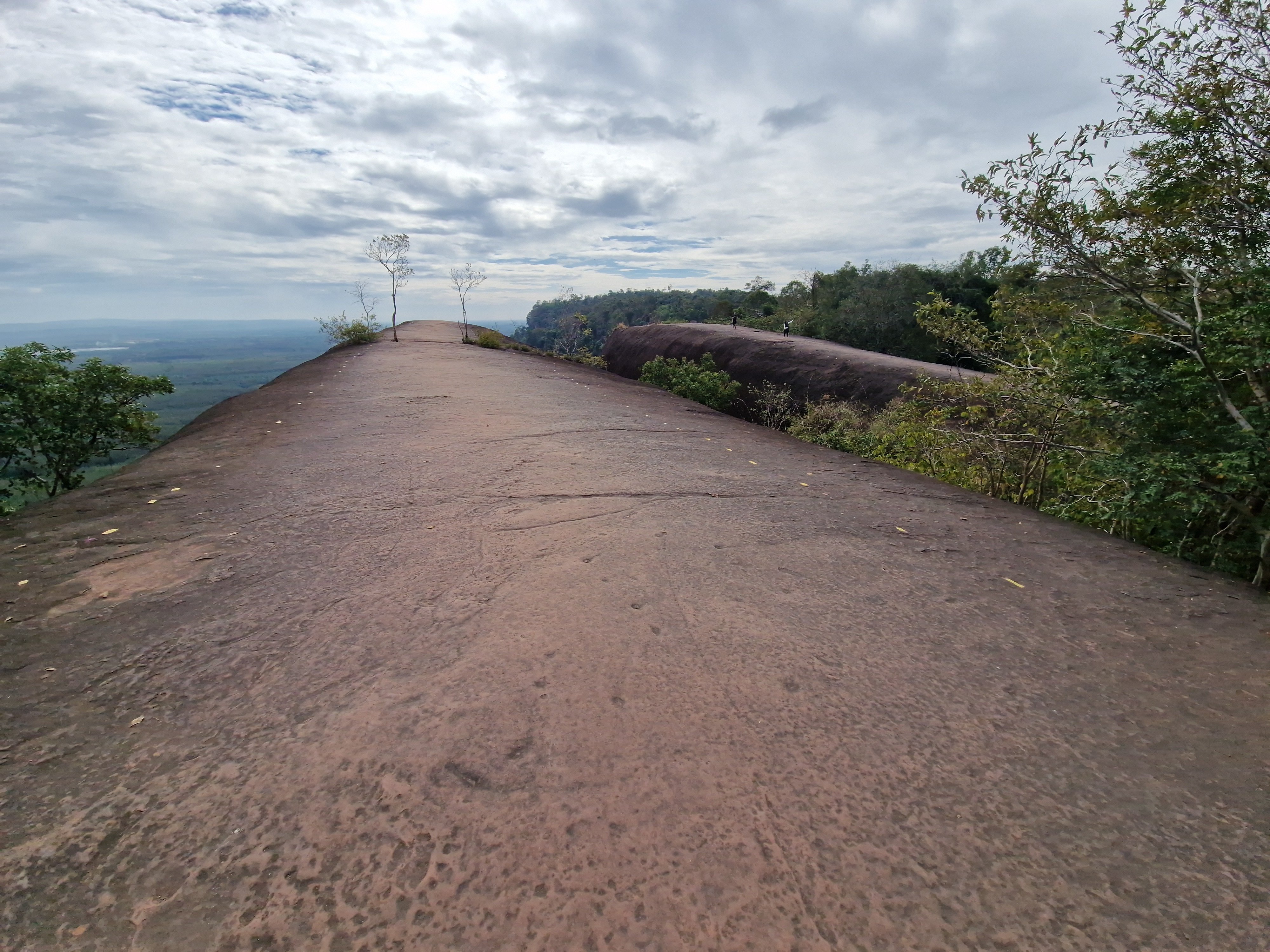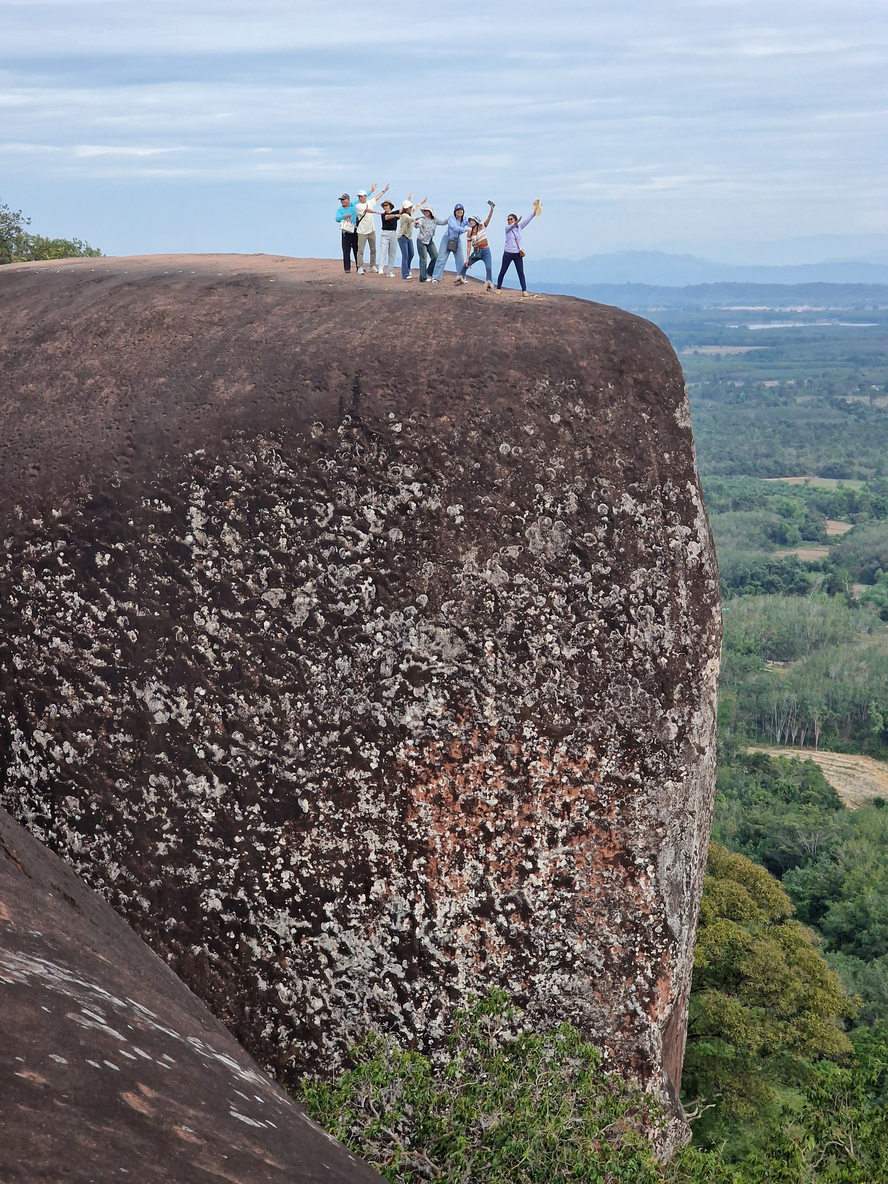 Mijn eerste stopplaats, three whale rock, ligt aan het noordelijke uiteinde van een 20-kilometer lange heuvelrug. Tot voor een paar jaar was deze plaats weinig bekend, maar door drone shots op social media is dit een hot spot geworden van lokaal toerisme. Aan de voet van de heuvel wordt in allerijl accommodatie bijgebouwd om bezoekers te ontvangen, ze worden vervolgens in pickup trucks geladen en naar boven gebracht om het moois te gaan bekijken. Ik onderga zonder tegenspartelen hetzelfde lot. Na een korte stop aan een niet zo indrukwekkend boeddhabeeld volgt het hoogtepunt: three whale rock. Het zijn drie langwerpige, parallele gladde rotspartijen die uit een verheven plateau zijn geërodeerd. Je hebt niet veel fantasie nodig om hier grote potvissen in te ontwaren. Ik loop op de kale kop van één van de twee toegankelijke potvissen en staar naar het weidse panorama. Er is geen balustrade die me van de tientallen vertikale meters van de klif beschermt, enkel een gele stippellijn die met korte stukjes plastic tape op de rots is aangebracht. Ondanks de recente populariteit van deze plaats ben ik er bijna alleen. Het is een schitterend moment. Ik zie een groep blije Thais op de kop van de andere potvis aankomen, enkele tientallen meter naast me. Ze lachen luid en zwaaien naar de drone die hen filmt. Voor de eerste keer in mijn leven voel ik het gemis van een drone. Een selfie met maximaal gestrekte arm dan maar.