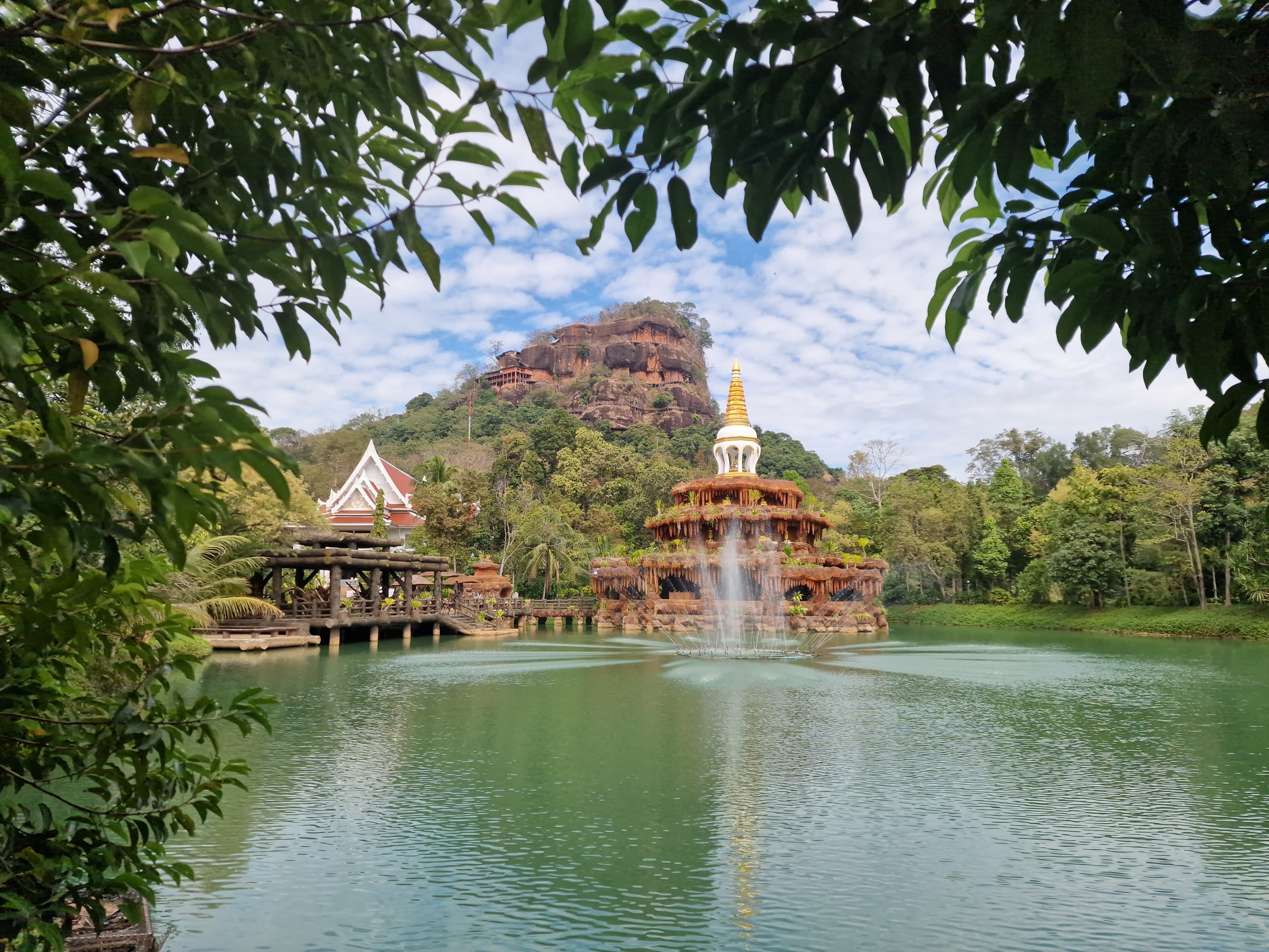 Brug naar een losstaande rots met kleine tempel.