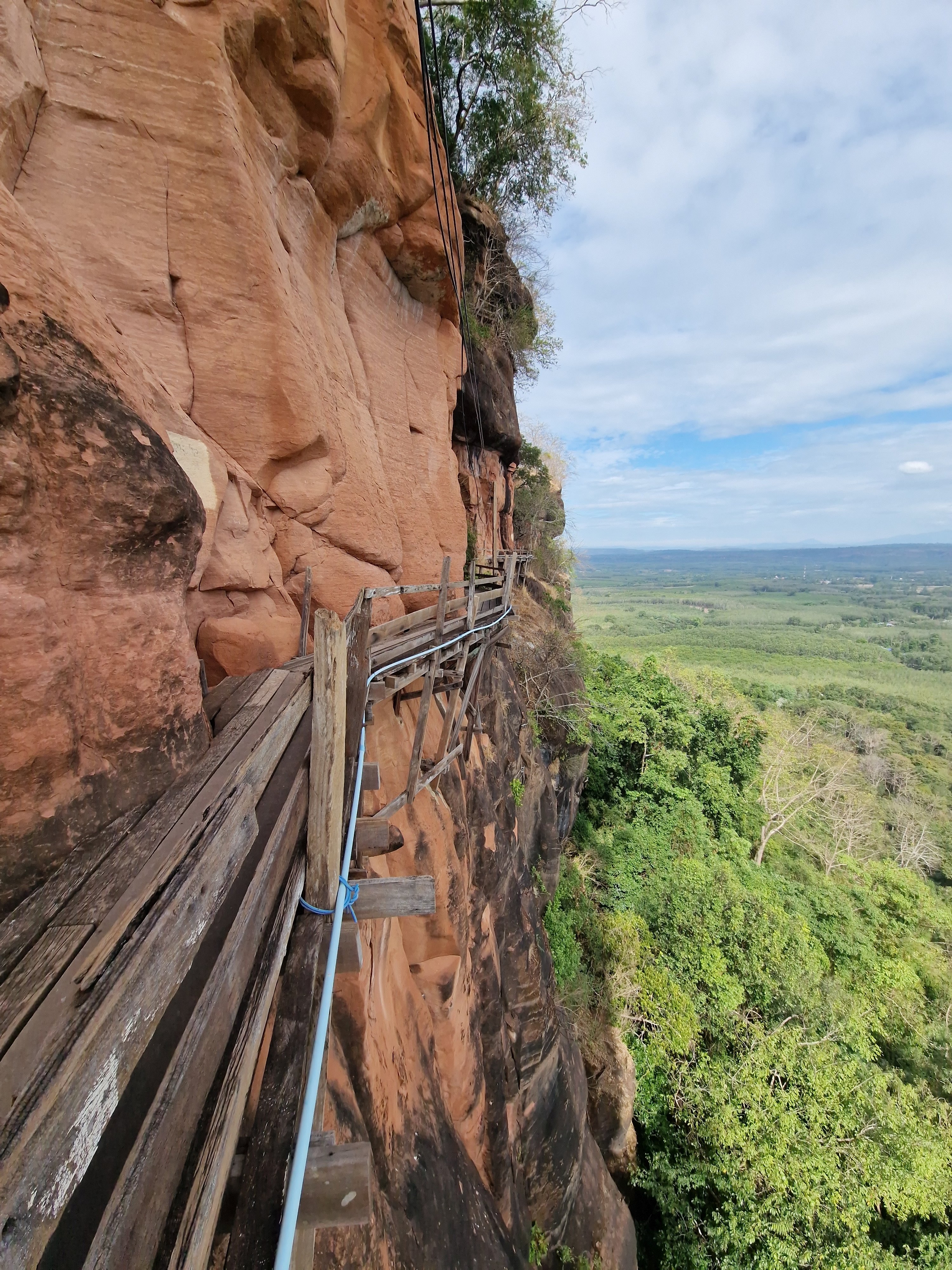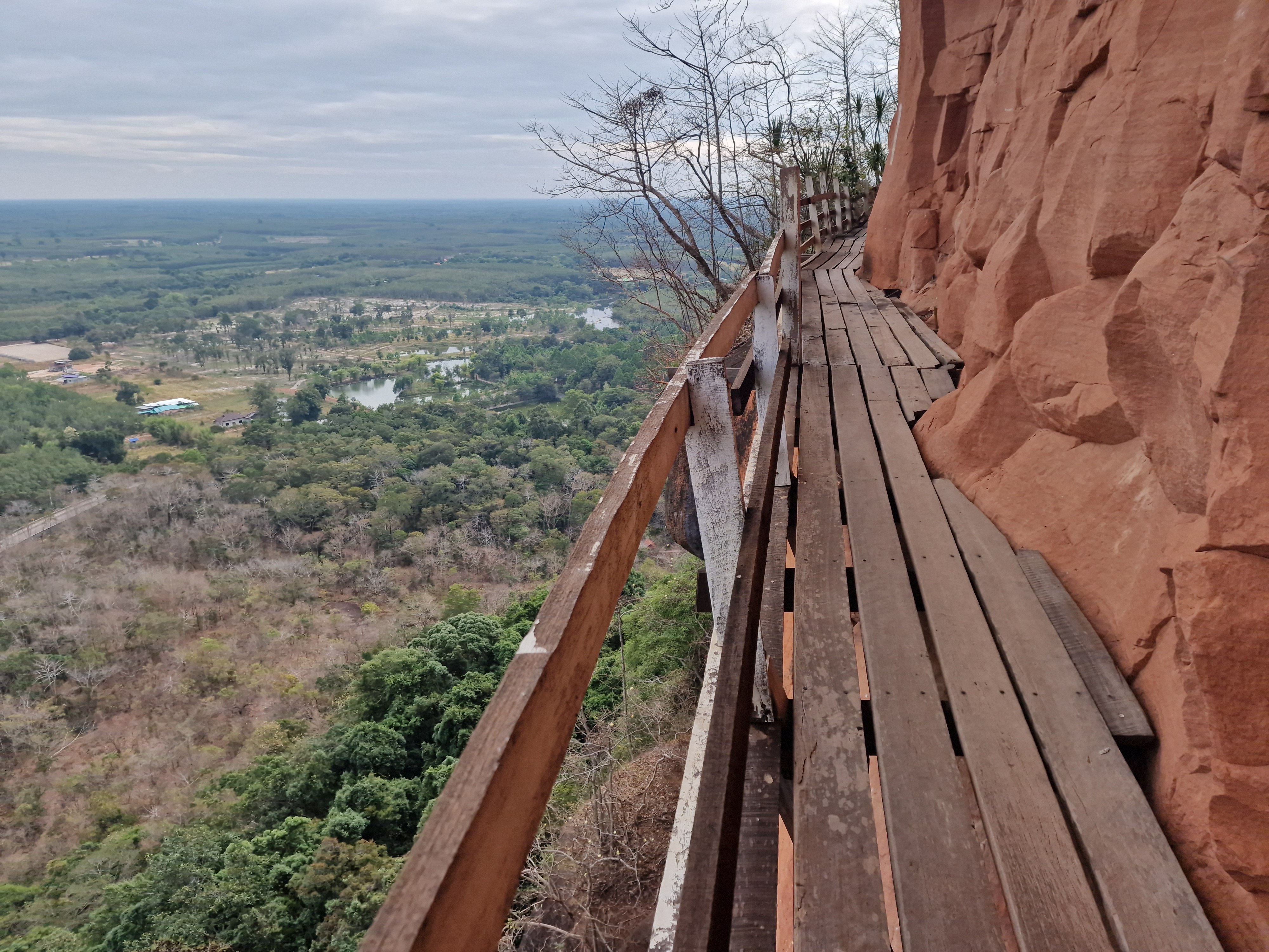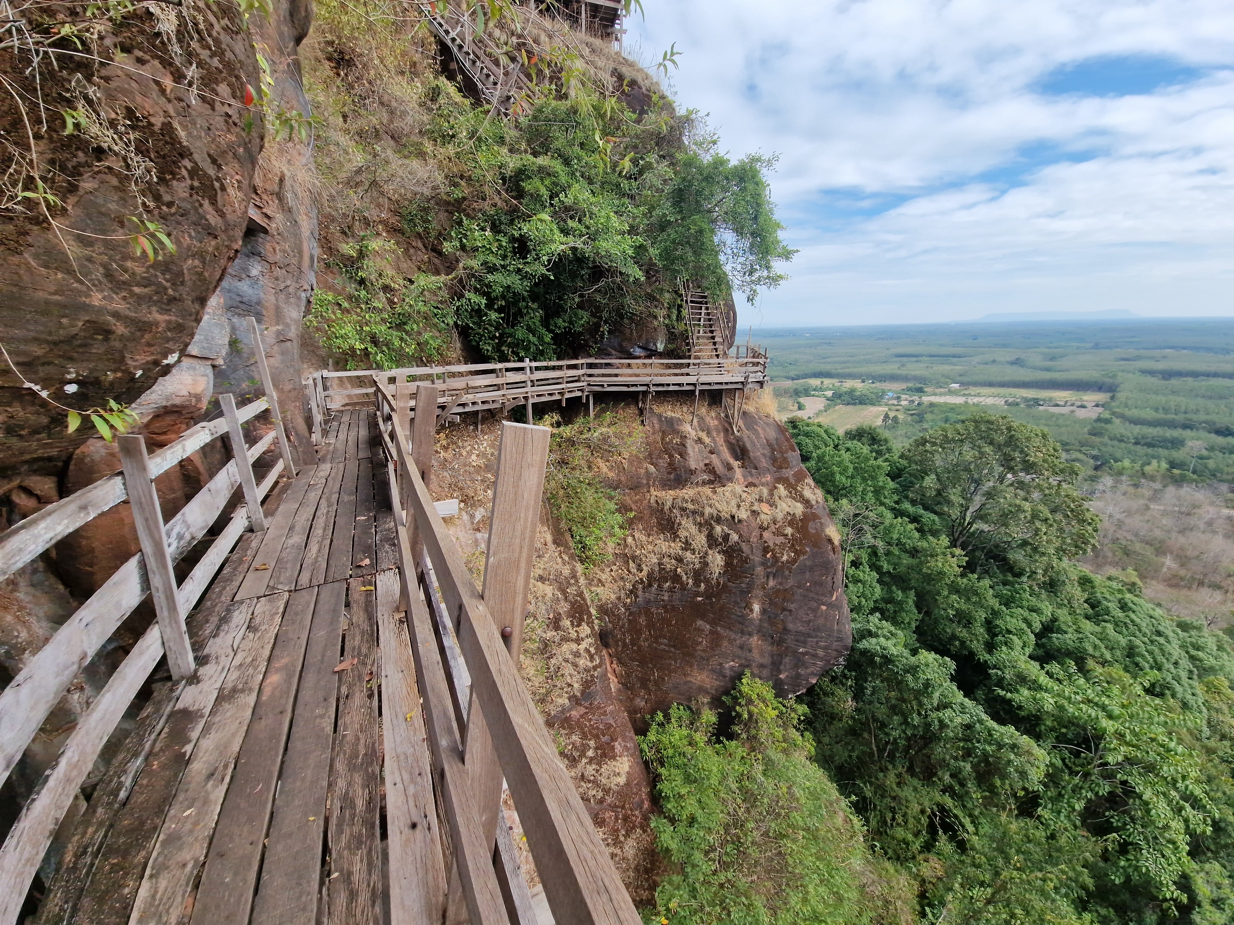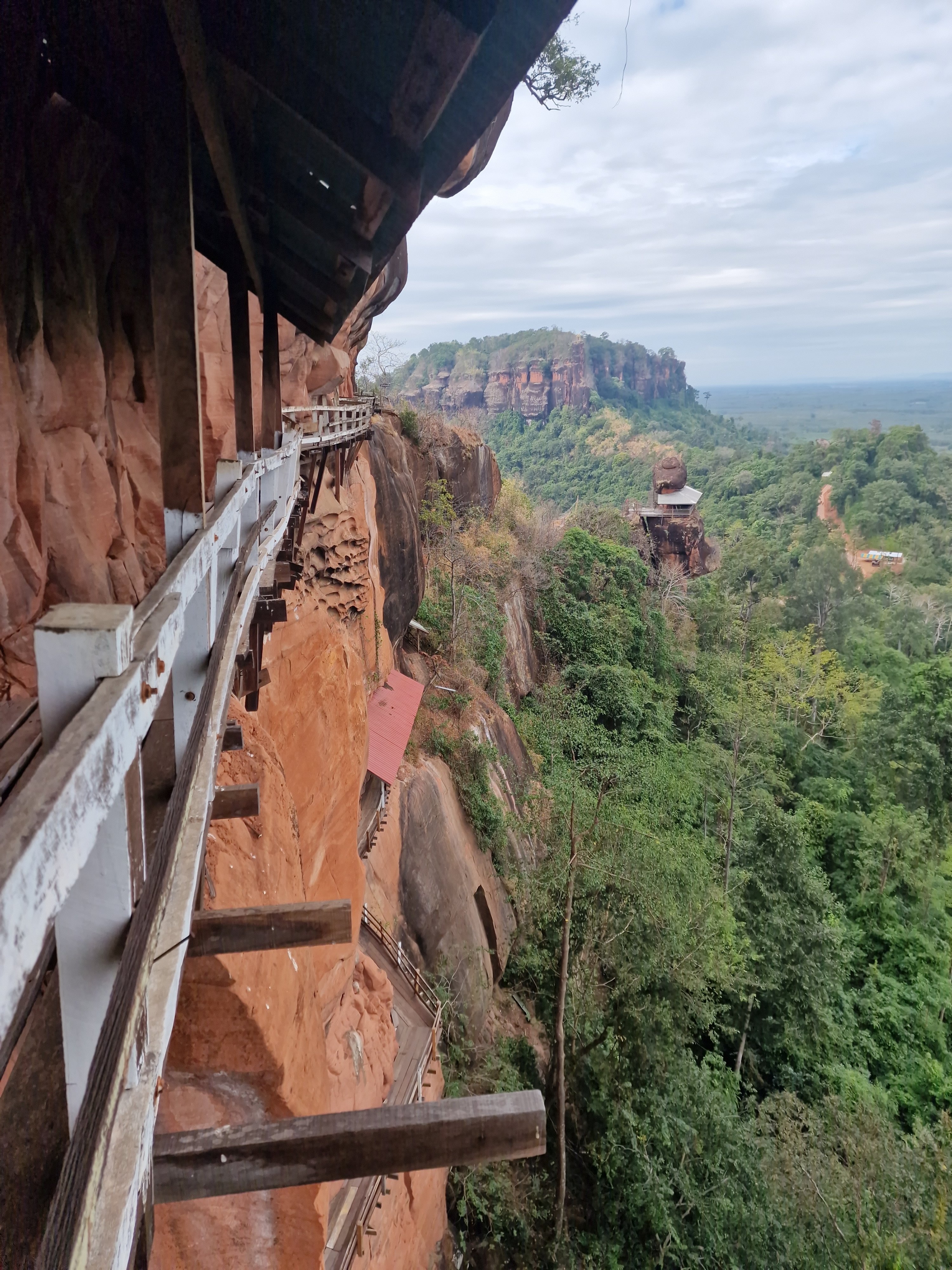 Met blij gemoed verlaat ik het park en fiets verder richting Wat Phu Tok, die helemaal aan het zuidelijke uiteinde van de lange heuvelrug gelegen is. Het zou één van de spannendste tempels van Thailand zijn. Hij is gebouwd tegen de wanden van een alleenstaande rots van ongeveer driehonderd meter hoog. Boeddhistische monniken hebben hierin, op zeven niveau’s (de zeven stadia naar de verliching), gaanderijen uitgehouwen en smalle houten paden aangelegd tegen de vertikale rotswand. De verschillende niveau’s zijn onderling verbonden met steile houten trappen. Het ziet er allemaal wankel en amateuristisch geknutsel uit, de nagels zijn verroest en het hout lijkt op sommige plaatsen vermolmd en vlug hersteld. Tussen de houten planken zitten kieren die uitzicht geven op de bomen enkele honderden meter dieper. Bij hoogtevrees: gelieve zich te onthouden. Op één van de bordjes onderaan de rotstempel staat geschreven: “denk na over je leven bij elke stap die je zet”. “Want elke stap kan hier de laatste zijn”, vul ik deze wijsheid schamper aan in mijn gedachten. Ik moet toegeven dat deze setting wel iets doet met een mens. En ik mijmer en sta bij mijn leven stil bij het beklimmen van de tempel. Dat maakt zo’n bezoek zo mooi. Los van de adrenaline die vrijkomt bij het kraken van de planken en het zicht van de afgrond.
