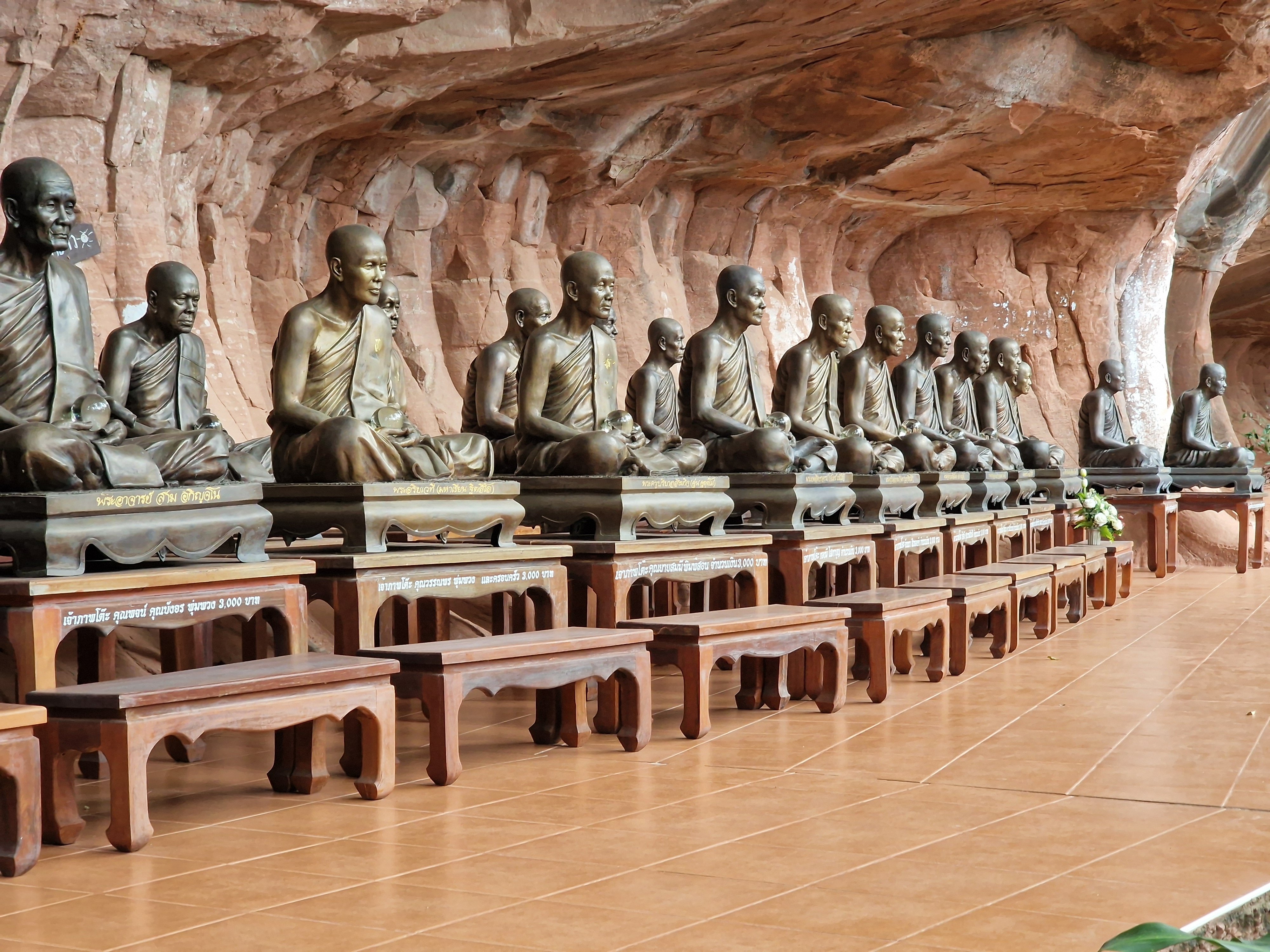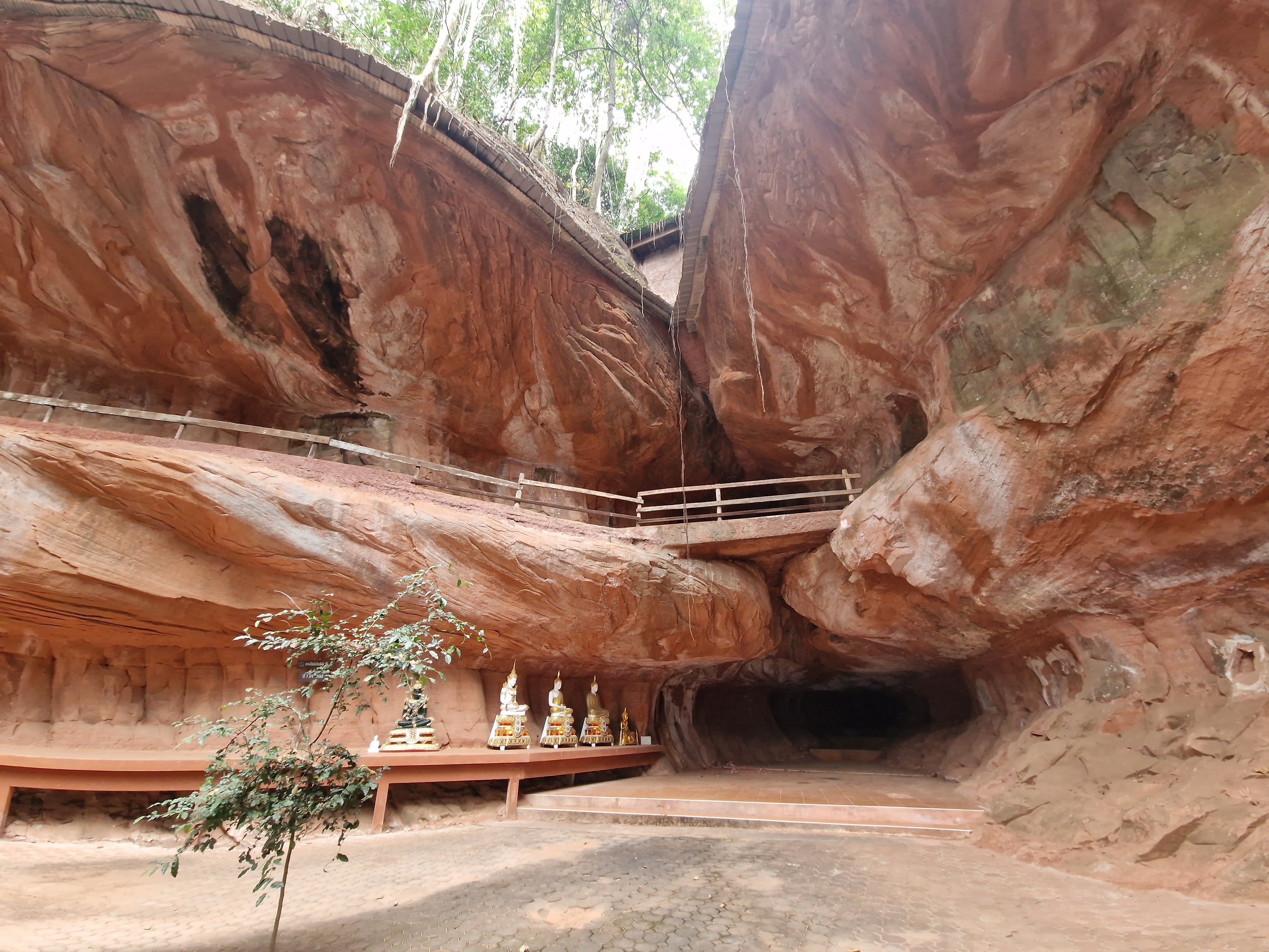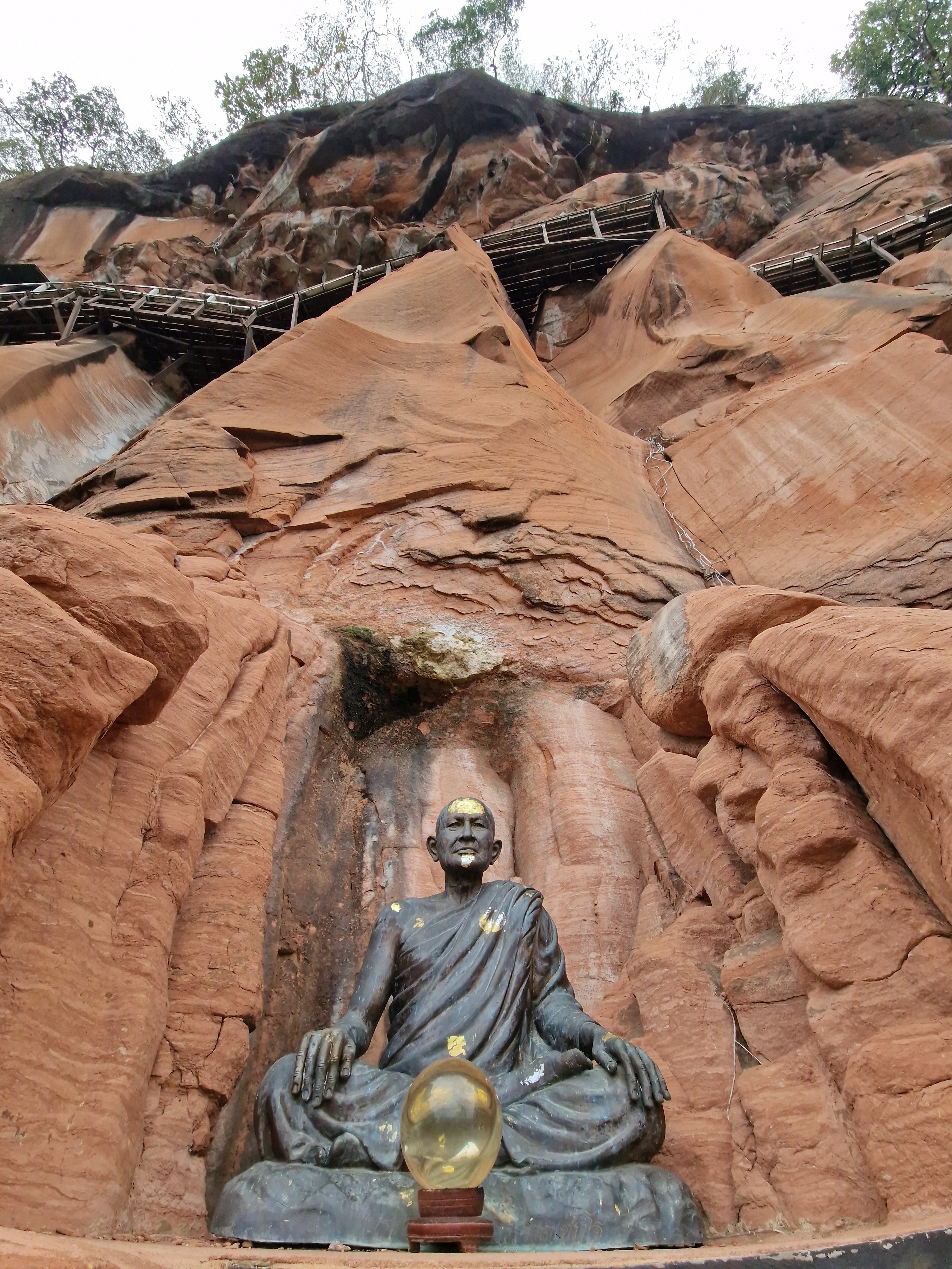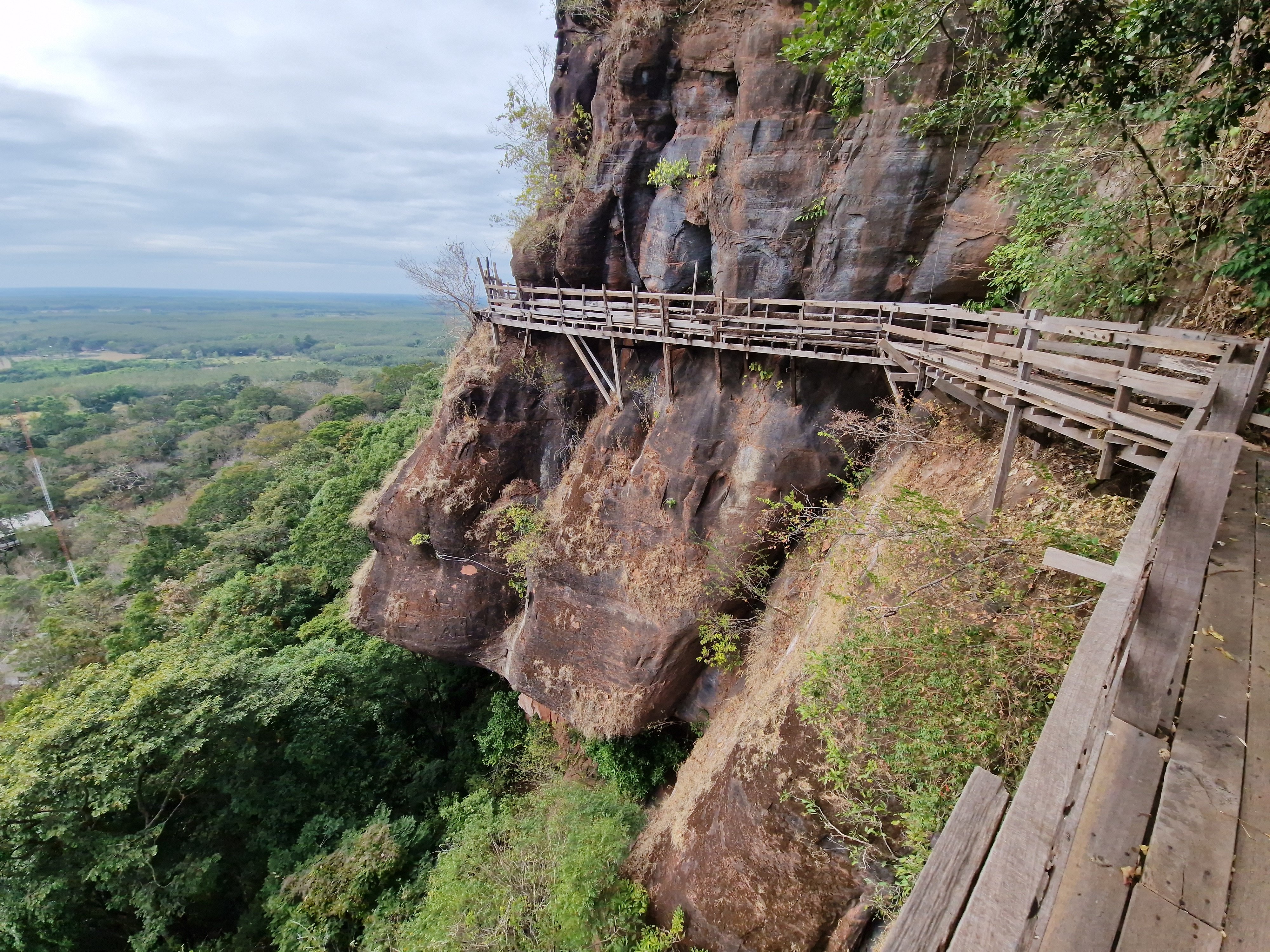 Met blij gemoed verlaat ik het park en fiets verder richting Wat Phu Tok, die helemaal aan het zuidelijke uiteinde van de lange heuvelrug gelegen is. Het zou één van de spannendste tempels van Thailand zijn. Hij is gebouwd tegen de wanden van een alleenstaande rots van ongeveer driehonderd meter hoog. Boeddhistische monniken hebben hierin, op zeven niveau’s (de zeven stadia naar de verliching), gaanderijen uitgehouwen en smalle houten paden aangelegd tegen de vertikale rotswand. De verschillende niveau’s zijn onderling verbonden met steile houten trappen. Het ziet er allemaal wankel en amateuristisch geknutsel uit, de nagels zijn verroest en het hout lijkt op sommige plaatsen vermolmd en vlug hersteld. Tussen de houten planken zitten kieren die uitzicht geven op de bomen enkele honderden meter dieper. Bij hoogtevrees: gelieve zich te onthouden. Op één van de bordjes onderaan de rotstempel staat geschreven: “denk na over je leven bij elke stap die je zet”. “Want elke stap kan hier de laatste zijn”, vul ik deze wijsheid schamper aan in mijn gedachten. Ik moet toegeven dat deze setting wel iets doet met een mens. En ik mijmer en sta bij mijn leven stil bij het beklimmen van de tempel. Dat maakt zo’n bezoek zo mooi. Los van de adrenaline die vrijkomt bij het kraken van de planken en het zicht van de afgrond.