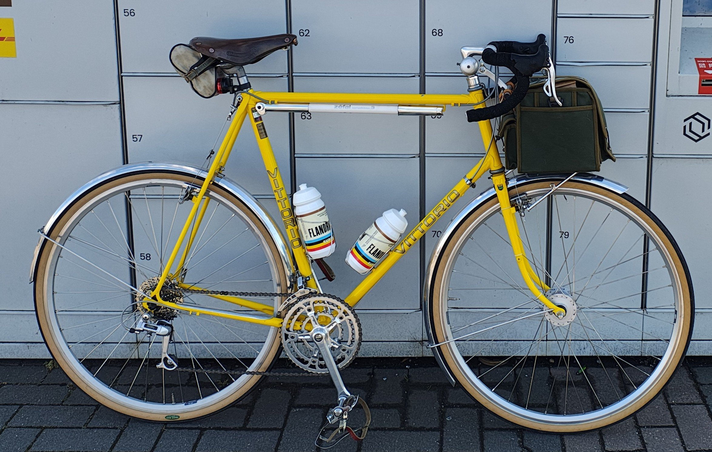 Deze fiets heb ik vrij recent opgebouwd, en behalve de banden, de naafdynamo en het stuur is het allemaal techniek van minstens dertig jaar geleden. Het ontwerp van de pedalen, de Lyotard model 23 "Marcel Berthet", is bijna honderd jaar oud, en nog steeds prima geschikt. Idem dito voor de Brooks B17. Ik heb verschillende fietsen uitgerust met Brooks en Lyotard omdat ik modernere vervangingen simpelweg niet beter vind.