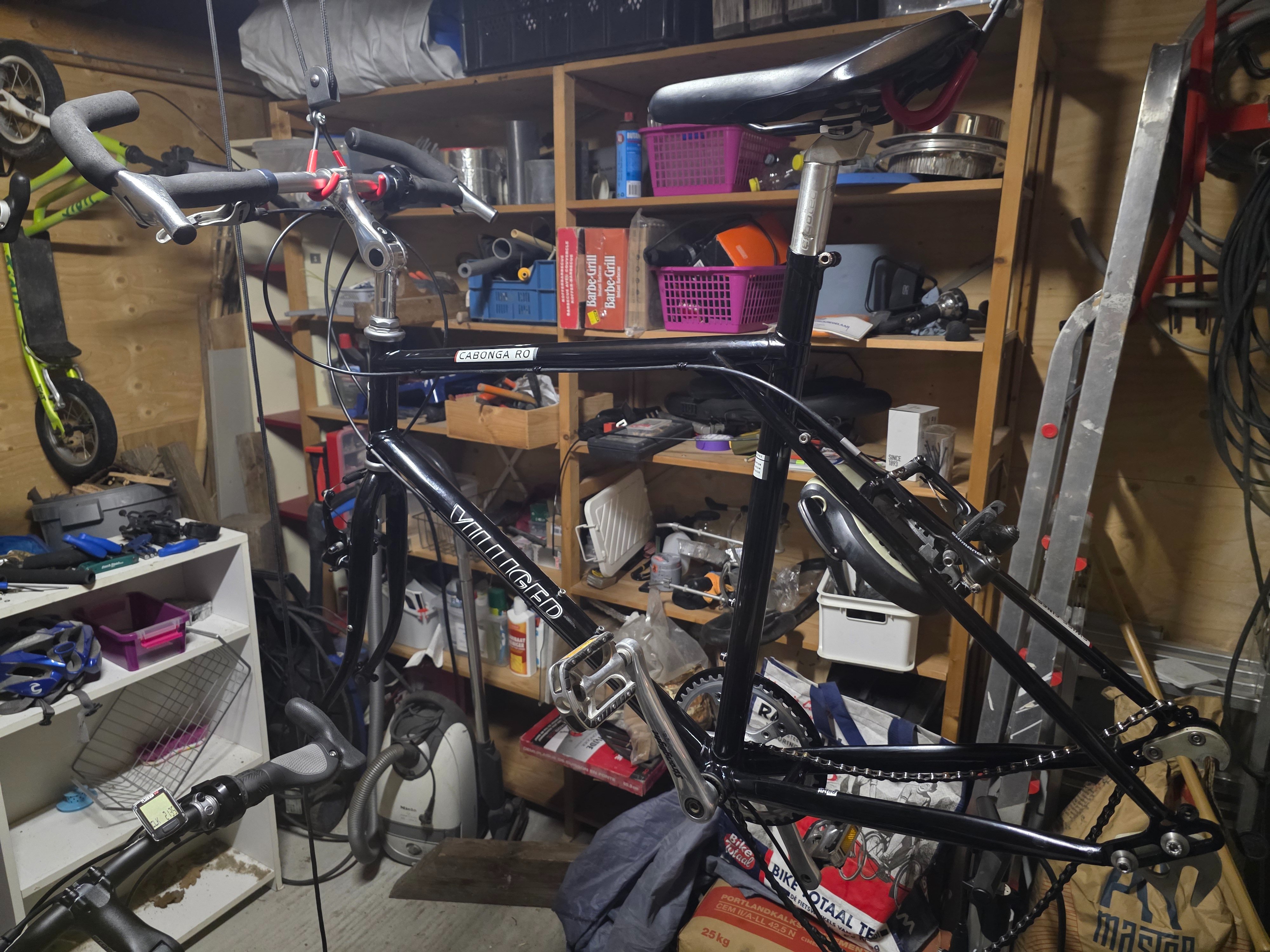 Zwart Villiger Cabonga RO stalen frame 57cm (in goede staat) met Shimano Deore Lx V-brakes. Zonder wielen, zonder bagagedrager, met stuur en handvaten. Losse nog in te bouwen Rohloff naaf (externe schakelbox en handgreep).