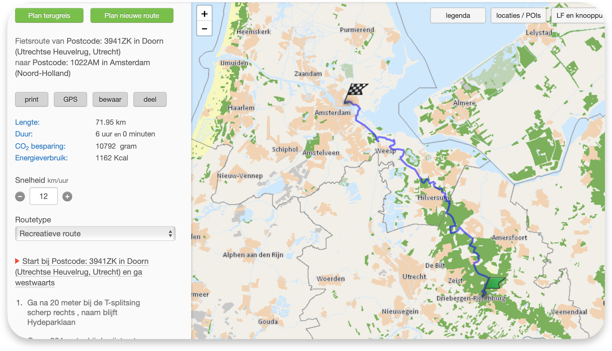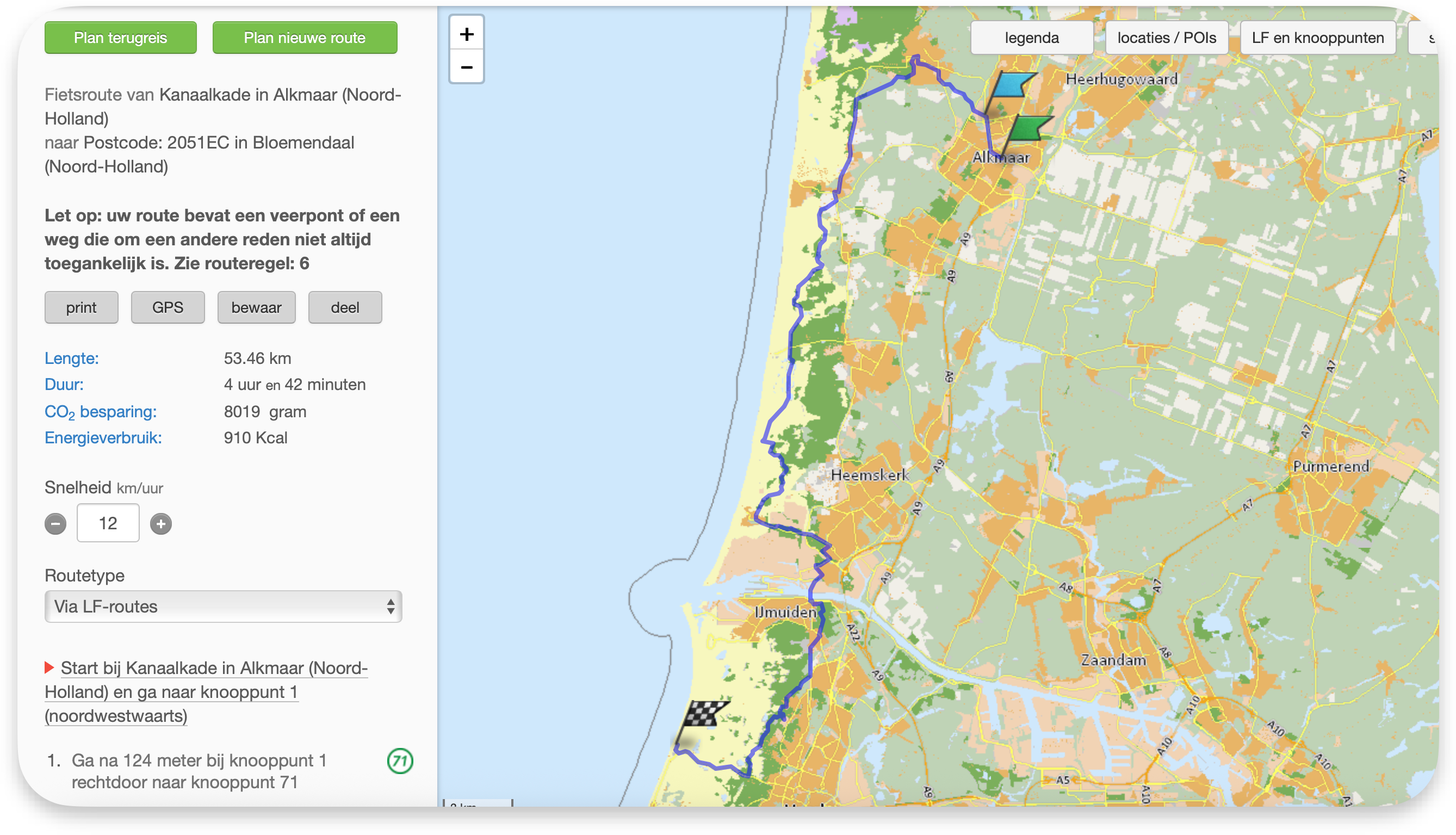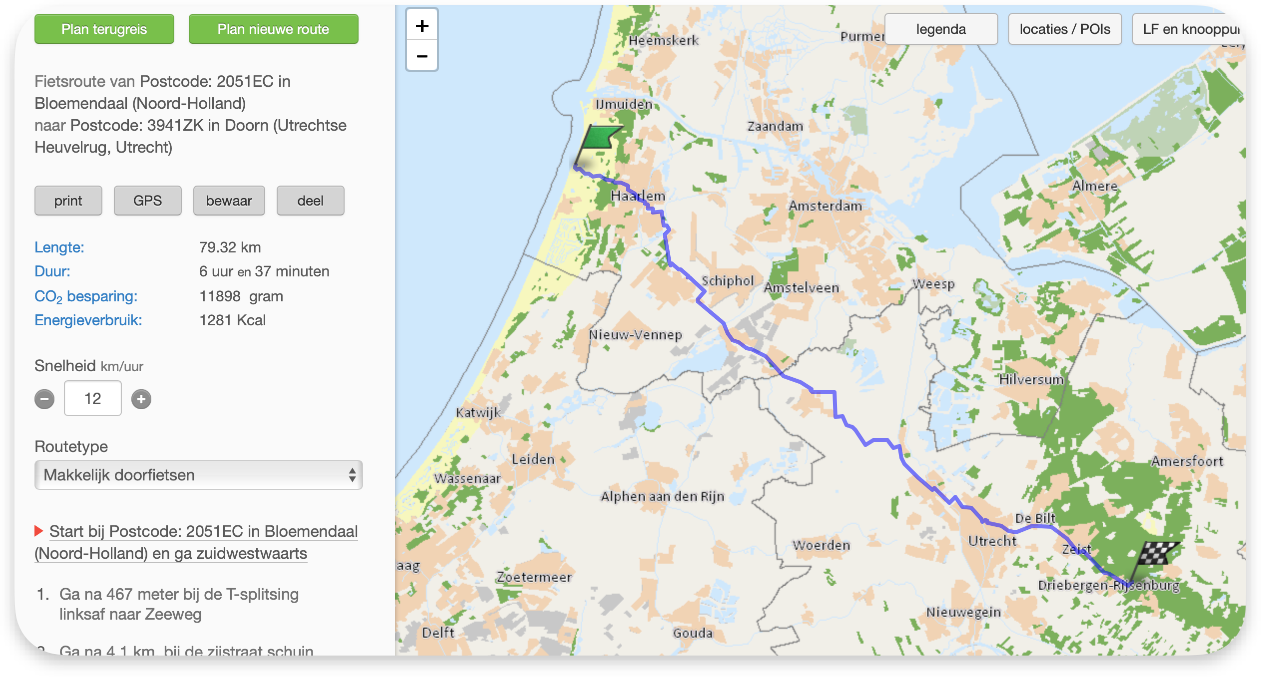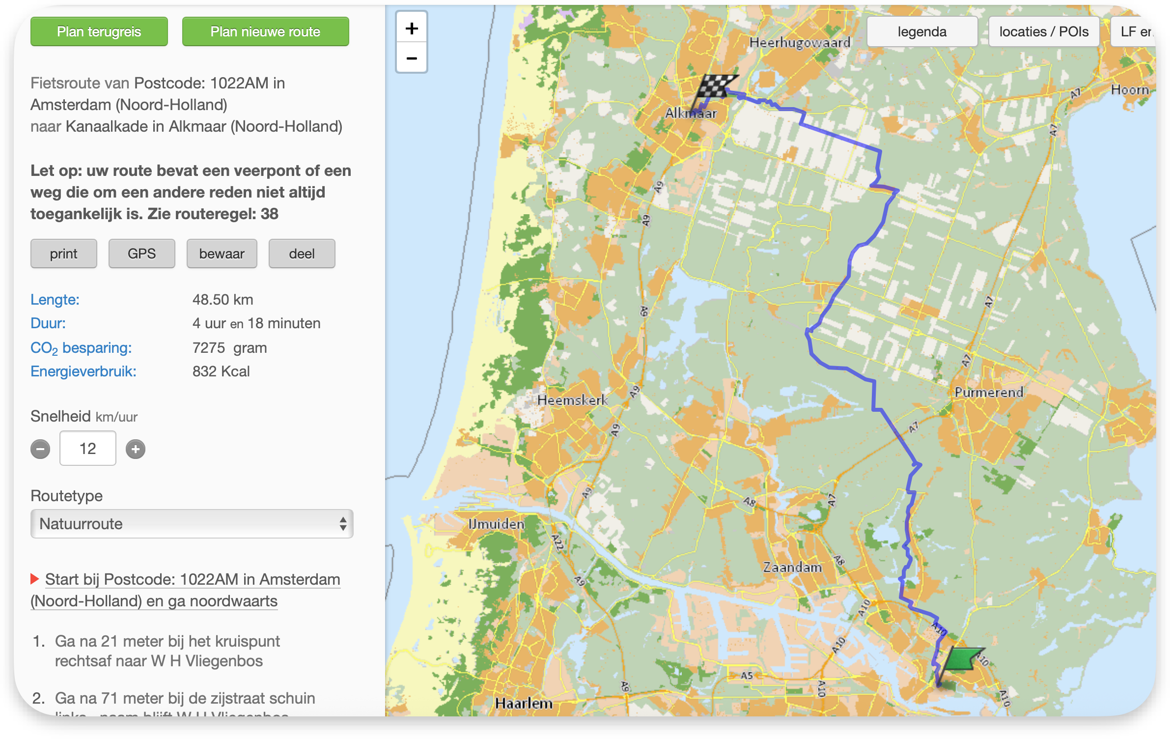 Op basis van campings die ik heb gevonden, heb ik de volgende route gepland: Alkmaar – Bloemendaal – Doorn – Amsterdam-Noord – Alkmaar. Over het traject Bloemendaal – Doorn heb ik mijn twijfels. Ik vraag me af of dit een interessante route is, en of het niet een erg lange dag in het zadel wordt als het eentonig is (ook omdat deze gepland is met de optie "Makkelijk doorfietsen").