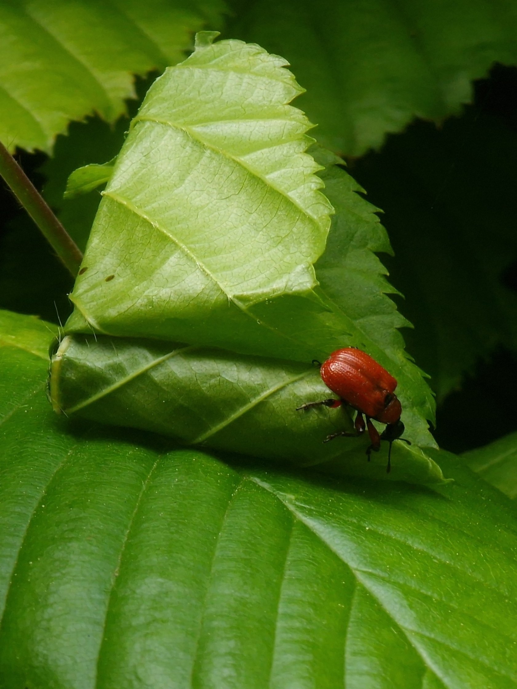 Niet op een pluizenbol, maar gewoon een bonus omdat ik hem zo leuk vind: de hazelbladroller bezig met wiskundig perfect knip- en plakwerk.