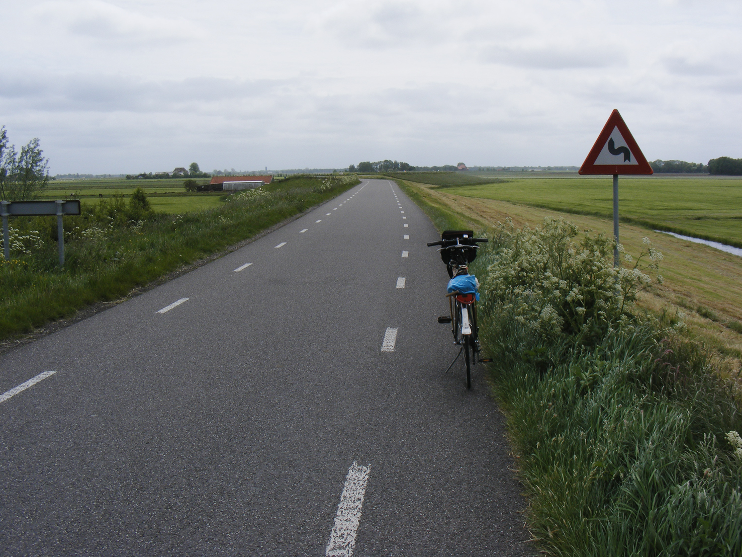 Hier is de nieuwe raadselfoto. Wat ik wel kwijt kan is dat er rechts buiten beeld een provinciegrens loopt. Recht boven mijn stuurtas een bijzonder gebouw.
