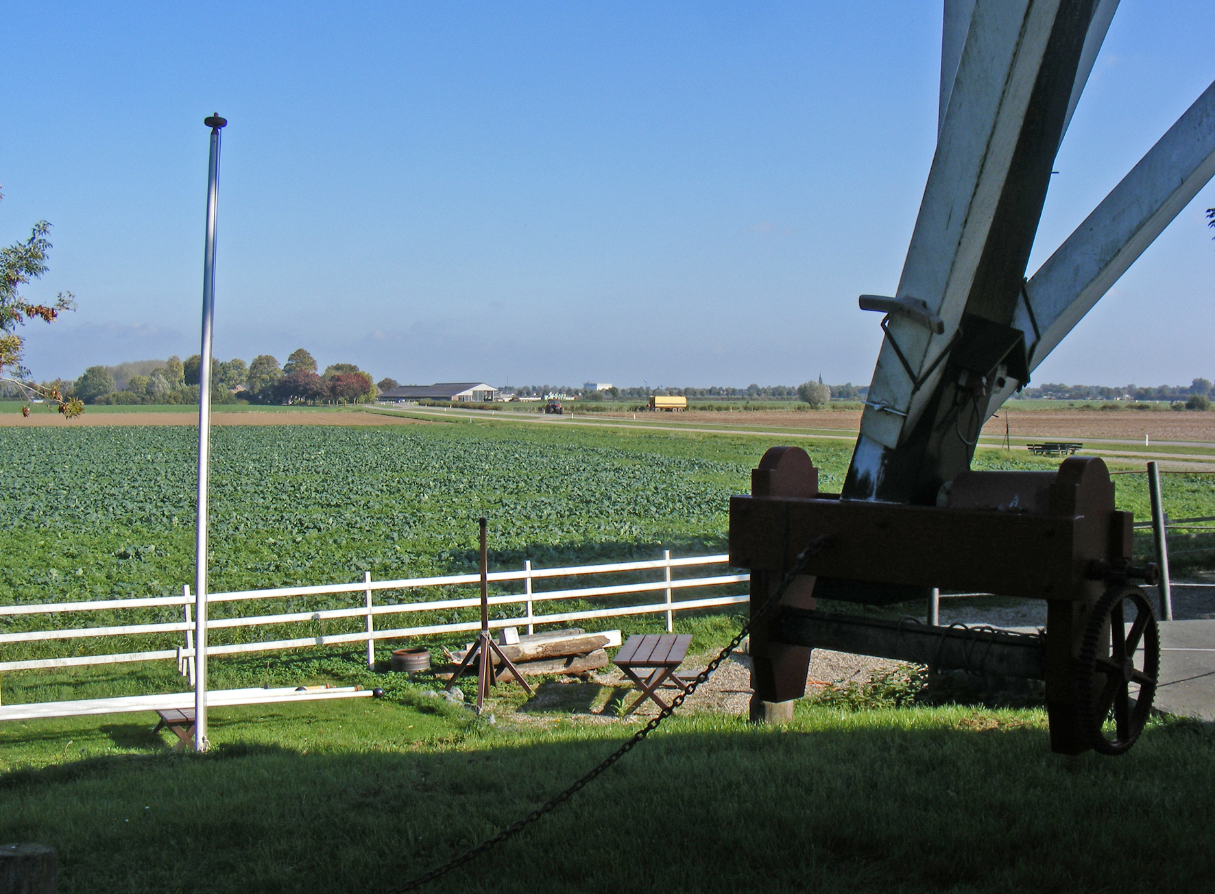 Dat horizontale ding met daarin het mechanisme om de molen op de wind te kruien heet een kruibok en is alleen beneden of ten oosten van de grote rivieren te vinden. Hier kijk ik naar de ONO-richting. De molen is ook geen grondzeiler.