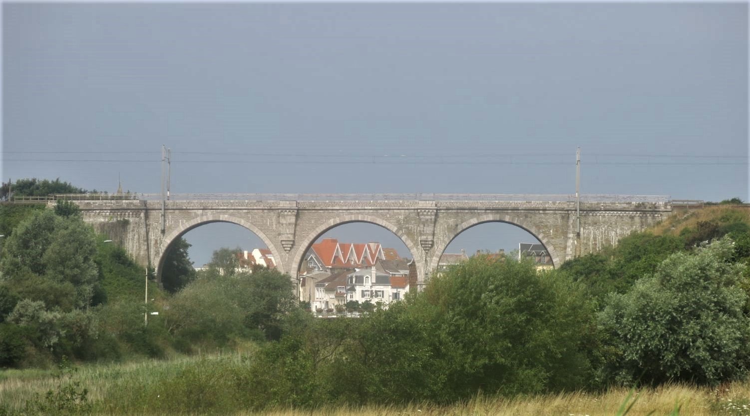 Een spoorviaduct met drie bogen, sierlijke uitstulpingen boven de pijlers. Linksboven misschien een kerktoren. Ik heb een hele lijst van Belgische spoorviaducten nageplozen, maar niks gevonden. De langwerpige dakkapellen op het huis rechts doen me naar Noord-Frankrijk neigen. Met deze https://www.google.nl/search?q=viaduc+f ... 1&biw=1067 ook geen succes.