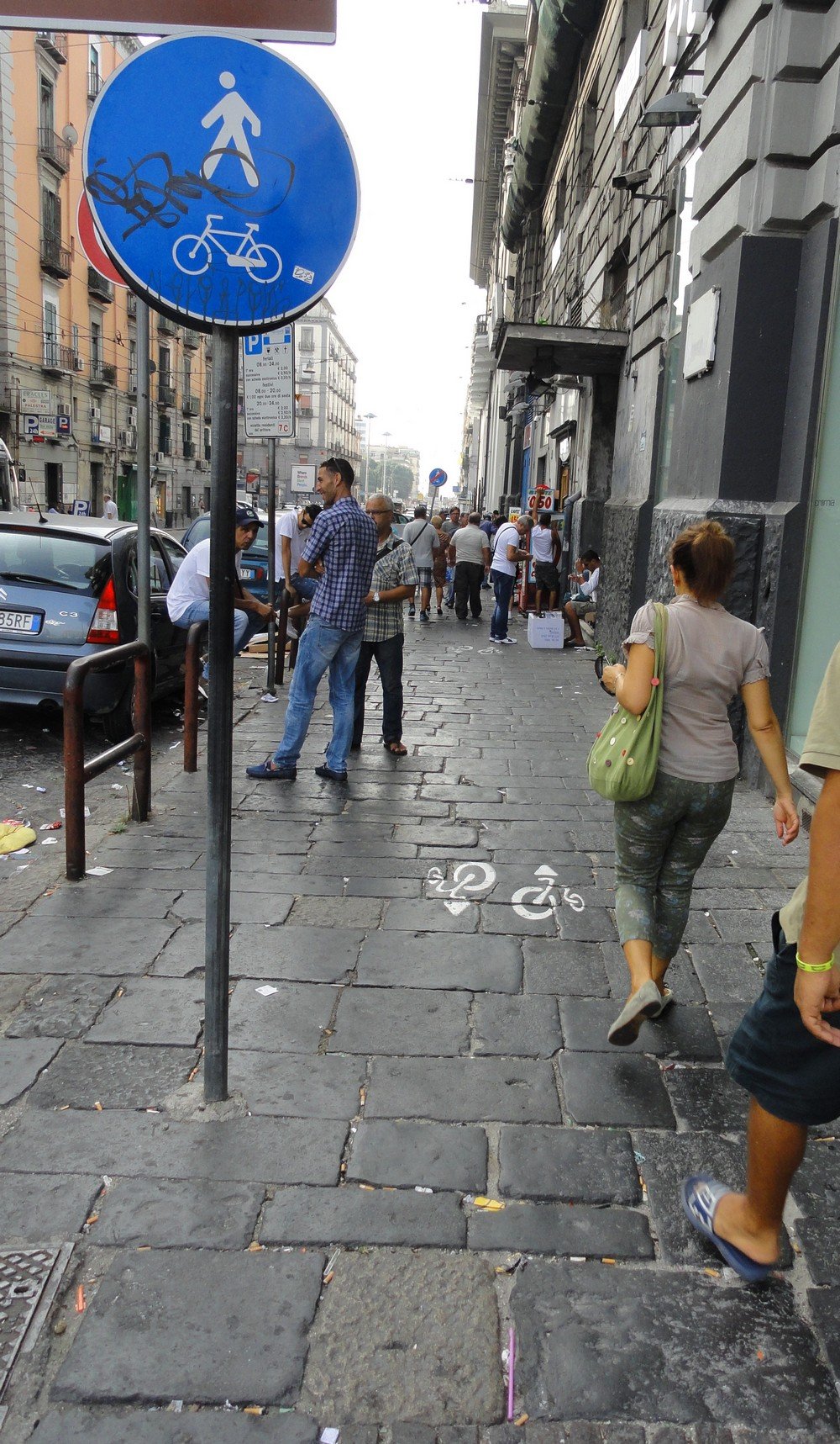 's Ochtends pakken we de trein/metrolijn naar Napels. Bij het centraal station aangekomen valt de verkeersdrukte ons reuze mee, maar het is dan ook zondagochtend. We lopen eerst langs een aantal hotels die we van tevoren op internet hebben geselecteerd. Uiteindelijk boeken we voor de laatste nacht van maandag op dinsdag a.s. een kamer voor €60 bij hotel Orso Maggiore aan de Corso Umberto I. De fietsen kunnen we voor €5 in de parkeergarage stallen. We wandelen verder door Napels. Er zijn zelfs fietspaden, maar die moeten gedeeld worden met voetgangers, m.a.w. gewoon fietsen op het trottoir, maar daar loopt teveel volk dus je kan beter op de rijbaan fietsen