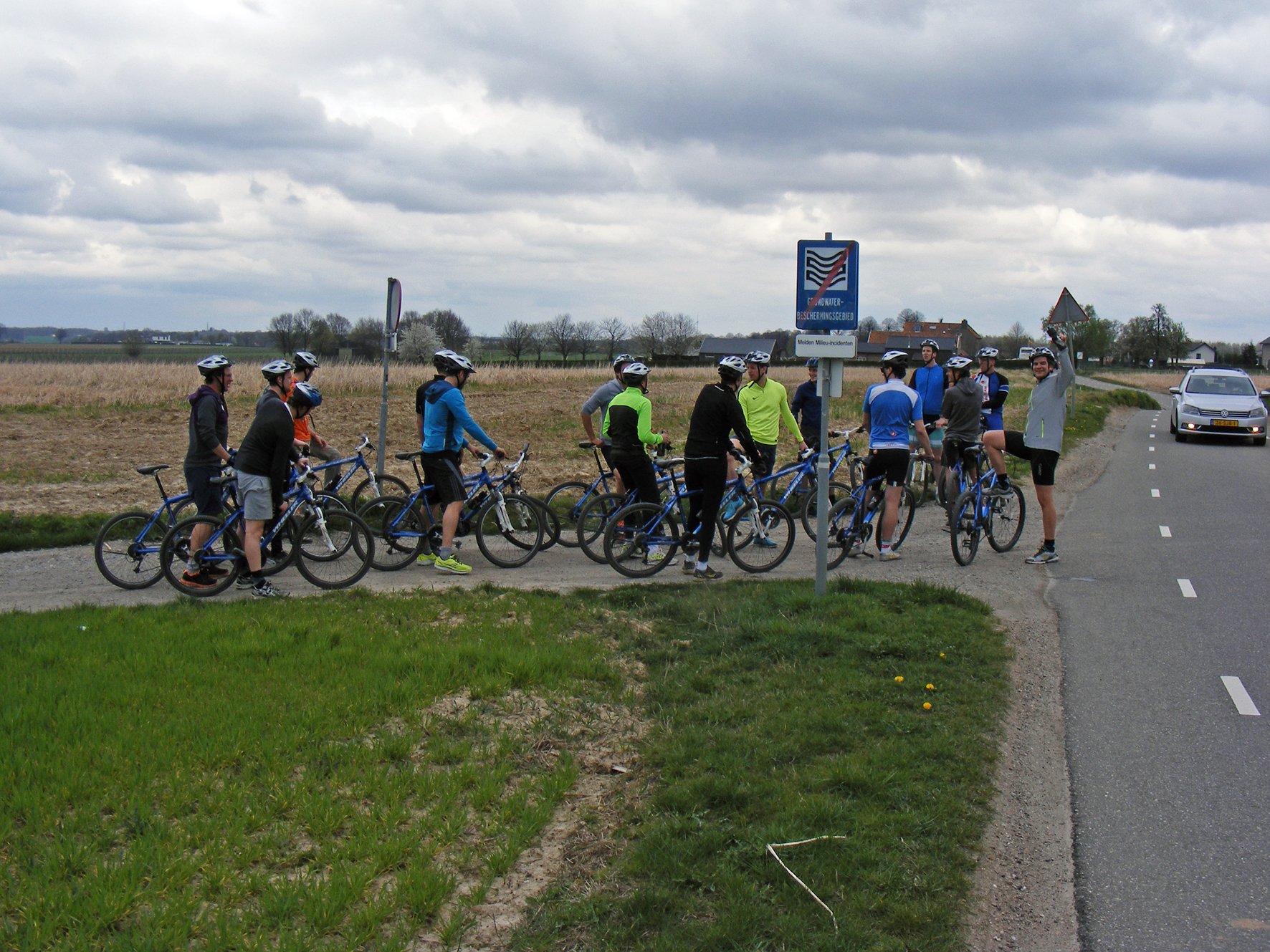 Hier is dan een nieuw raad plaatje. Ik kwam een groepje mountainbikers tegen, ik stopte en draaide me om voor een foto. Het verkeersbord naast de witte auto staat er nu niet meer....