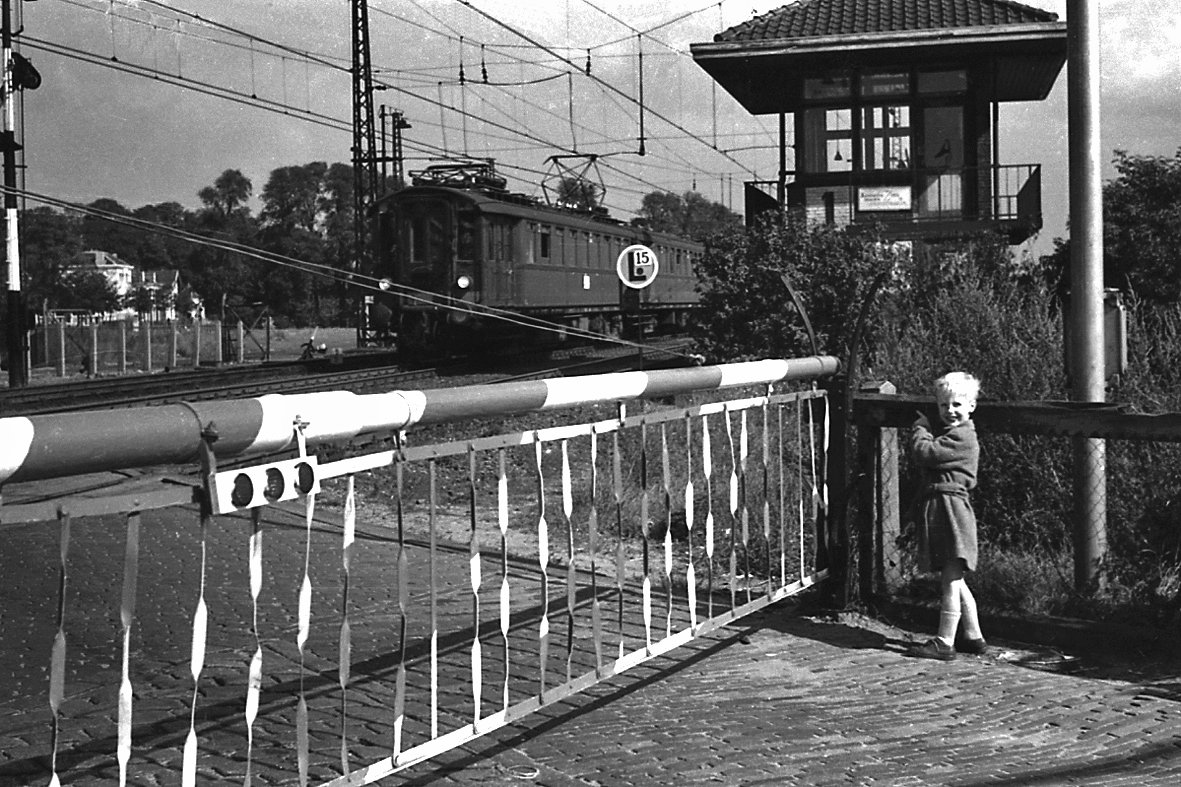 Dat ben ik zelf, op 17 september 1955. Het houten station van Beverwijk bevond zich achter het seinhuis en de huizen links bestaan nog. Deze Blokkendoos-trein reed naar Haarlem via de grote spoor-draaibrug van IJmuiden.
