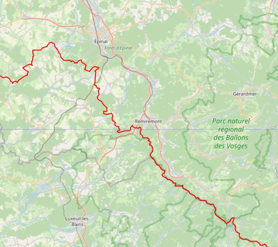 Het moet dus in een straal van 30 km rondom Remiremont zijn. Ik denk meer naar het oosten toe, want ik vermoed daar een soort van heuveltoppen met daarop de waterscheiding. Is op jouw foto het een doorgaande weg of een van de ontelbare straatjes in de dorpen? De foto lijkt in de ochtend te zijn genomen.