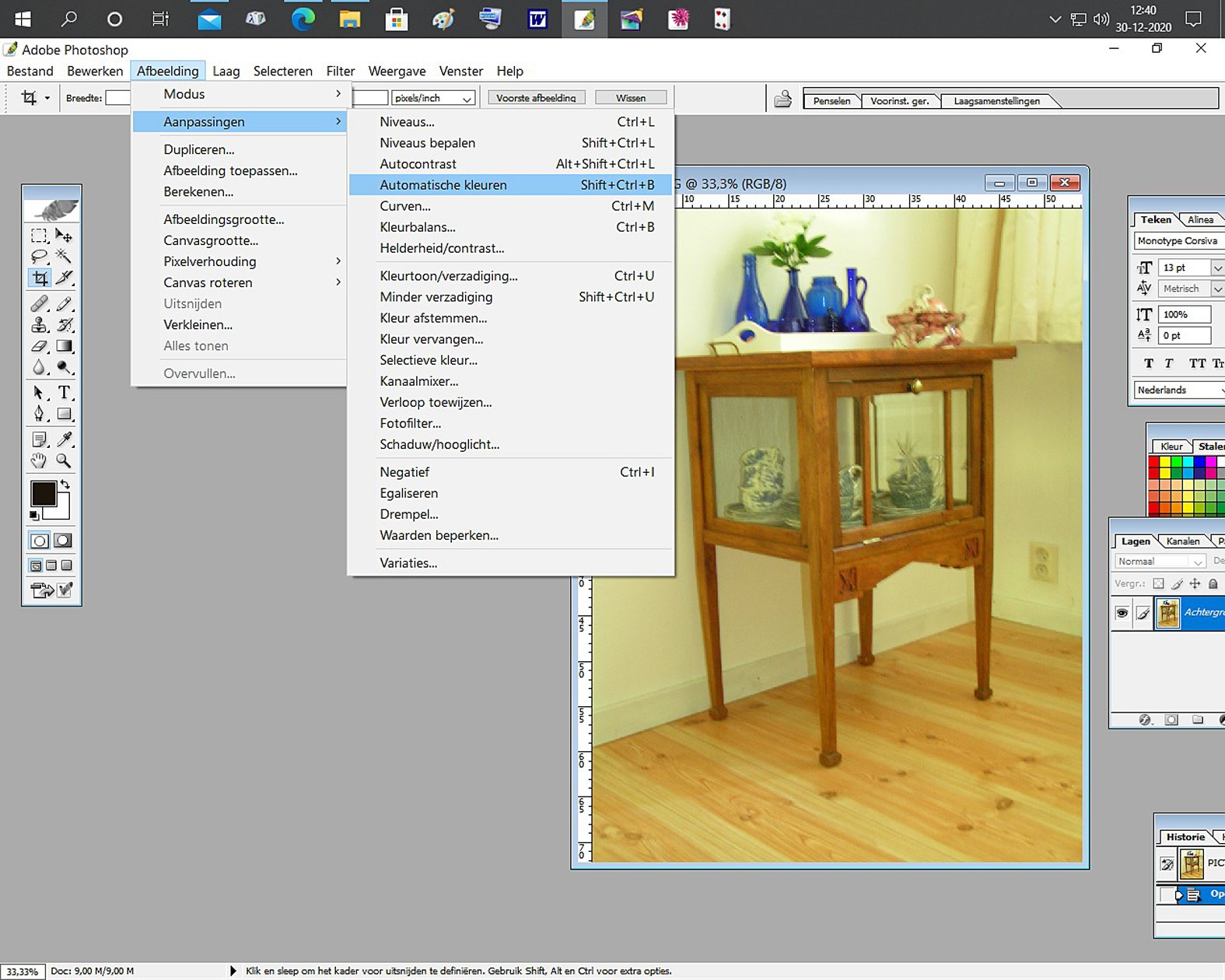 Met "automatische kleuren" op Adobe Photoshop kan je de negatieven hun oorspronkelijke kleuren weer teruggeven. Ook oude vergeelde foto's (familiefoto's van rond 1900 of daaromtrent, oude ansichtkaarten, enz) zelfde resultaten. Neem nou hieronder een theekastje als voorbeeld. Niet erg scherp dat wel. De scheefstand ook wat recht gezet. Geen enkel foto gaat zonder Adobe Photoshop naar de externe harddisk.