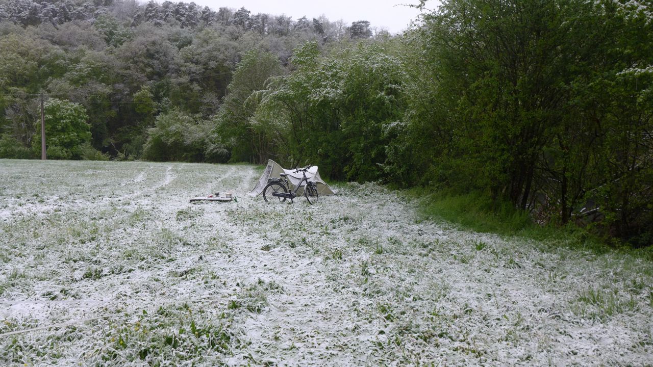 Dit waren mijn fiets en tent op diezelfde 4 mei j.l. Heerlijk geslapen trouwens, totdat het koude tentdoek in mijn gezicht kwam. Nadat ik mij gerealiseerd had wat er buiten gaande moest zijn, en ik wat tegen het doek geslagen had heb ik weer heerlijk warm verder geslapen. Het ergste was dat ik mijn binnenband moest vervangen in de sneeuw en later die dag had ik weer een lekke band en moest ik toch echt gaan plakken tussen de hagelbuien door.