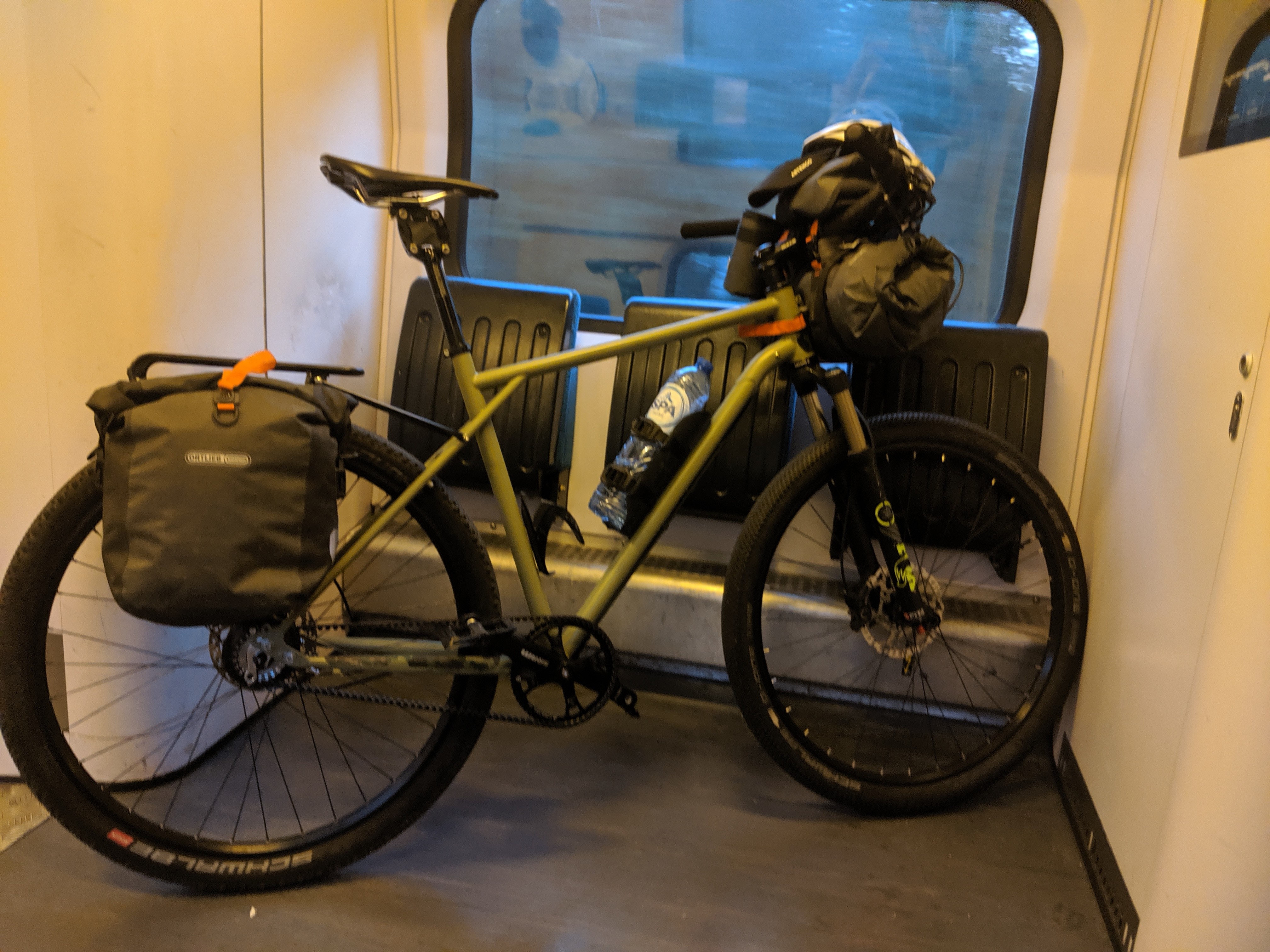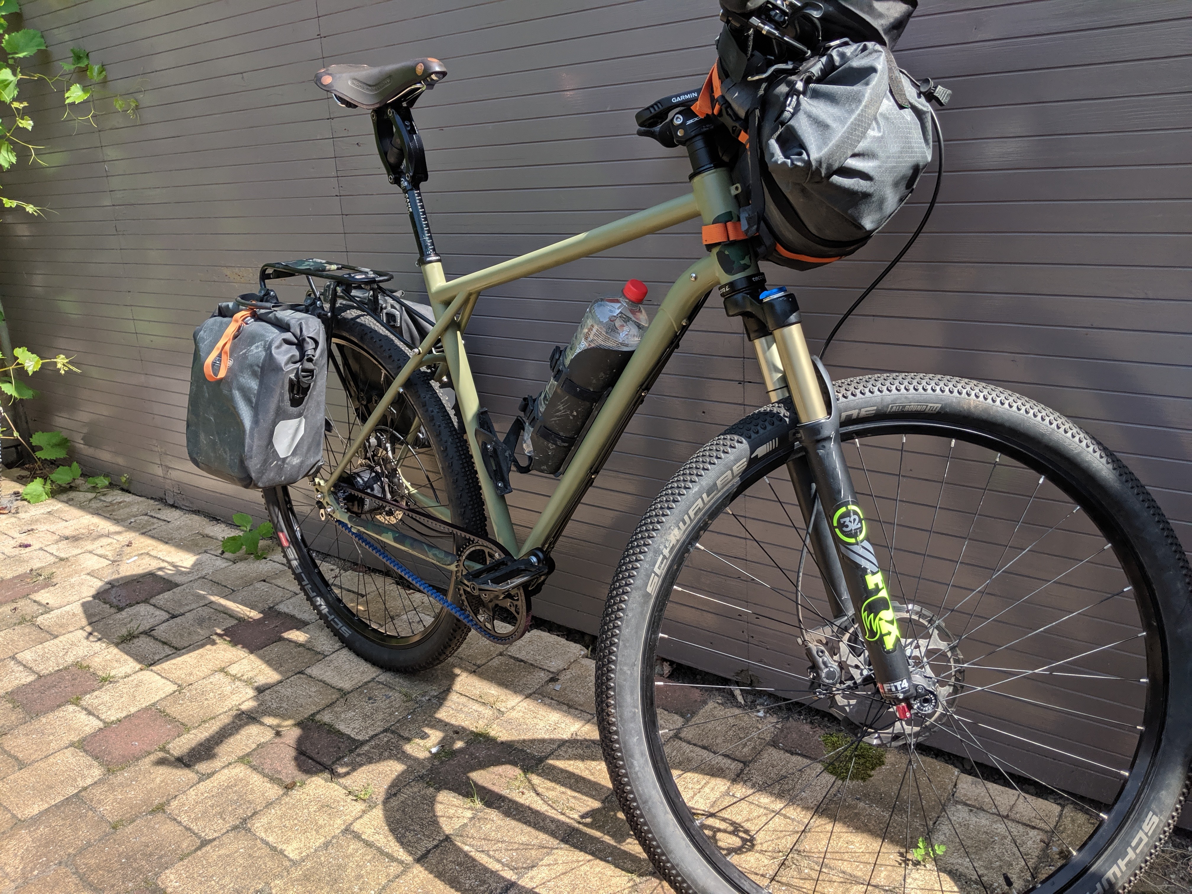 Sinds 2 jaar van 37 naar 50 mm banden (Big Apple), dat was de max. qua breedte in het frame. Hiervoor wel nieuwe SKS spatborden gemonteerd.
