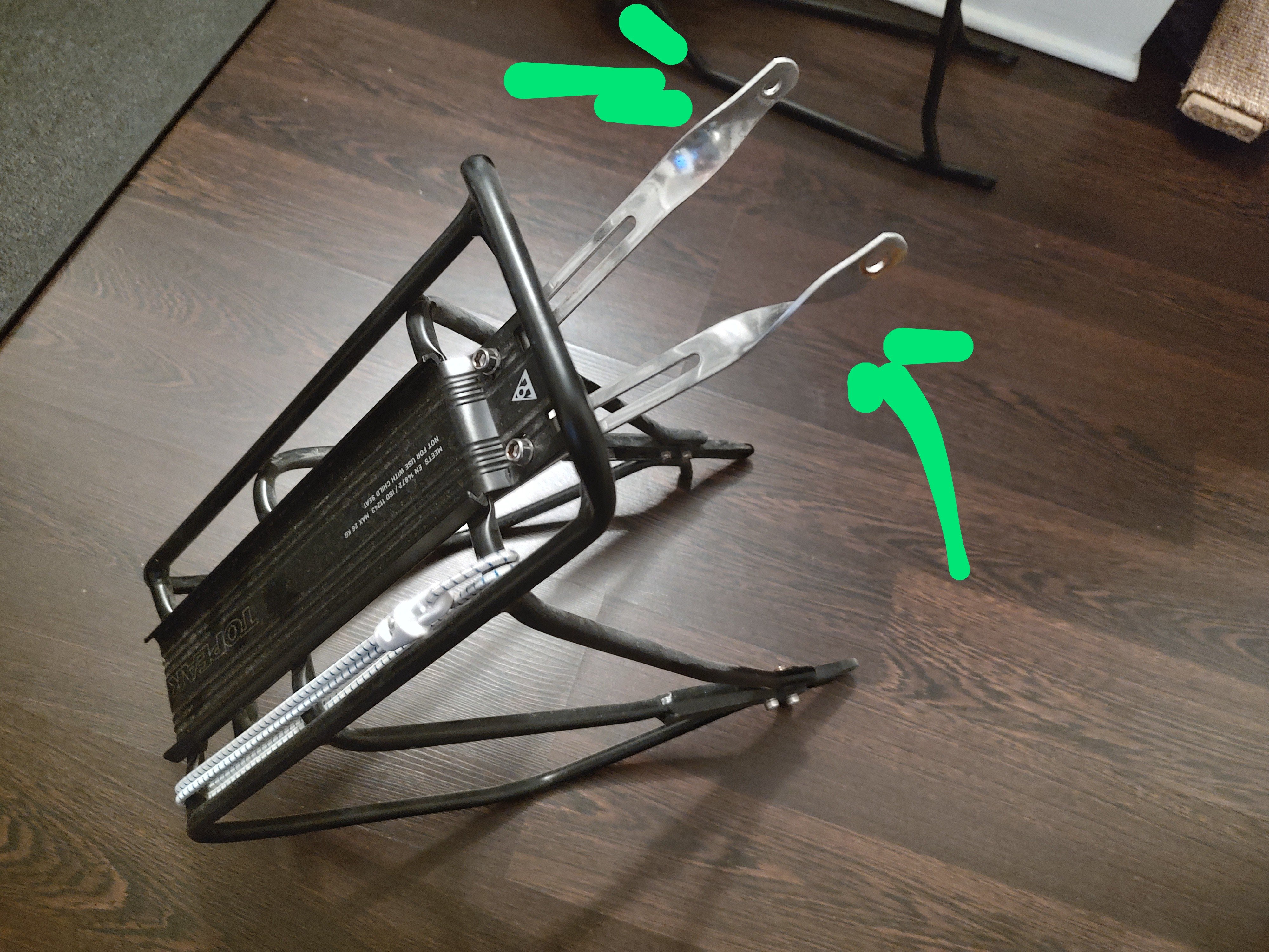 Op mijn Nuroad Race (niet de FE) zitten ook aan de zijkant van de vork bevestigspunten (groene pijltjes). Ik heb de Topeak Super Tourist.