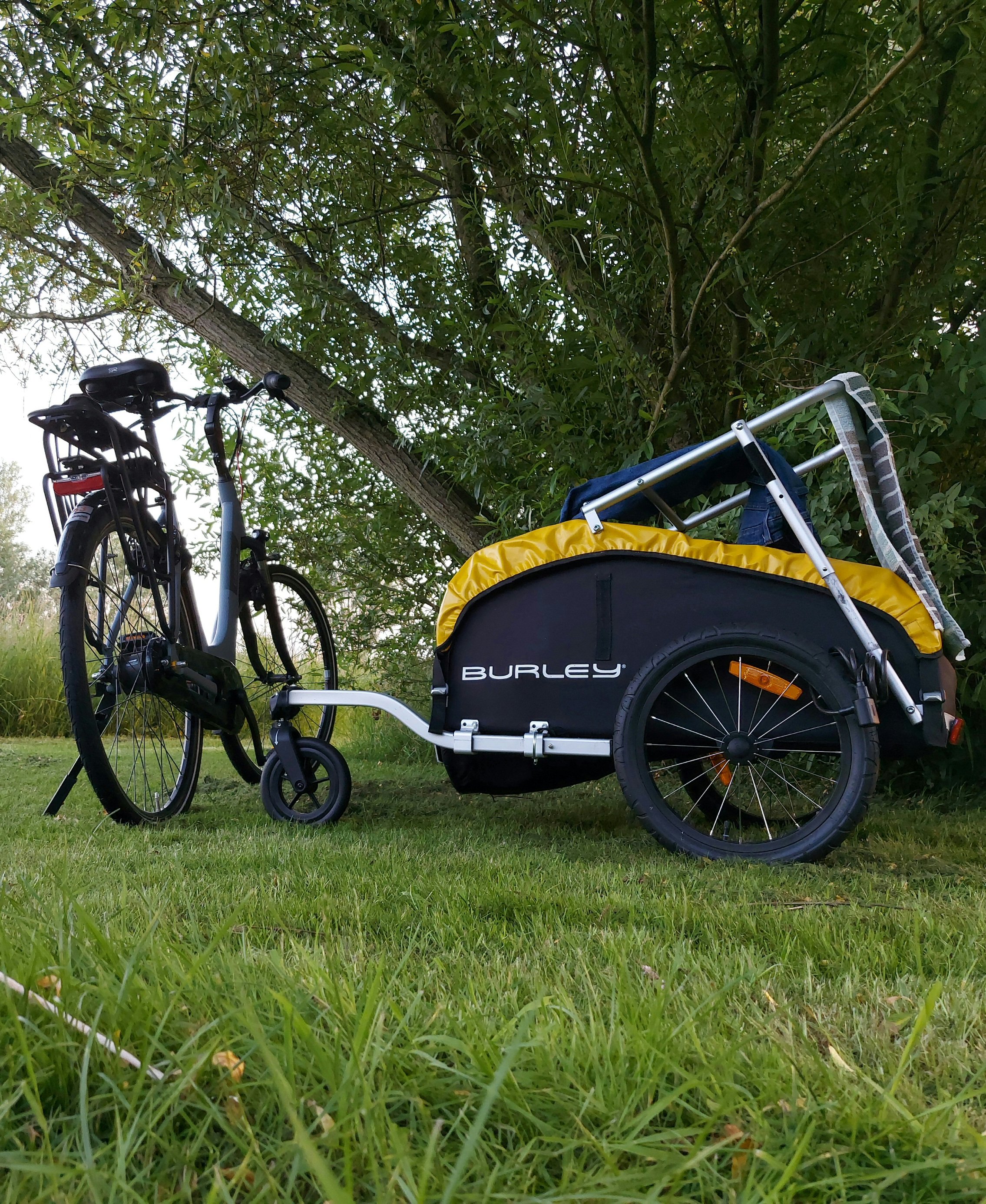 De Burley is niet echt een tas formaat. Je kan het een beetje inklappen en de stang en wielen zijn wel makkelijk te ontkoppelen. Maar een gewicht van 30 tot 45 kilo lijkt me pittig om op te tillen in de bagage rekken en volgeladen denk ik niet dat het daarin past. Het neemt een volledige zitplaats in op zijn minst, denk ik. Het heeft geen rem zoals een D'lite of Bee. Wel mogelijk te monteren met een beetje doe-het-zelven, denk ik. Het wordt wel wat uitdagender met de trein, besef ik me nu, niet onmogelijk, maar uitdagender. Heb een keer de kar moeten optillen over een smal loop/fietsbruggetje in de Nederlandse natuur. Het had trappen en maar een eenspoorsfietsrail. Was even pittig. Maar met wat spierkracht en creativiteit lukte het wel.