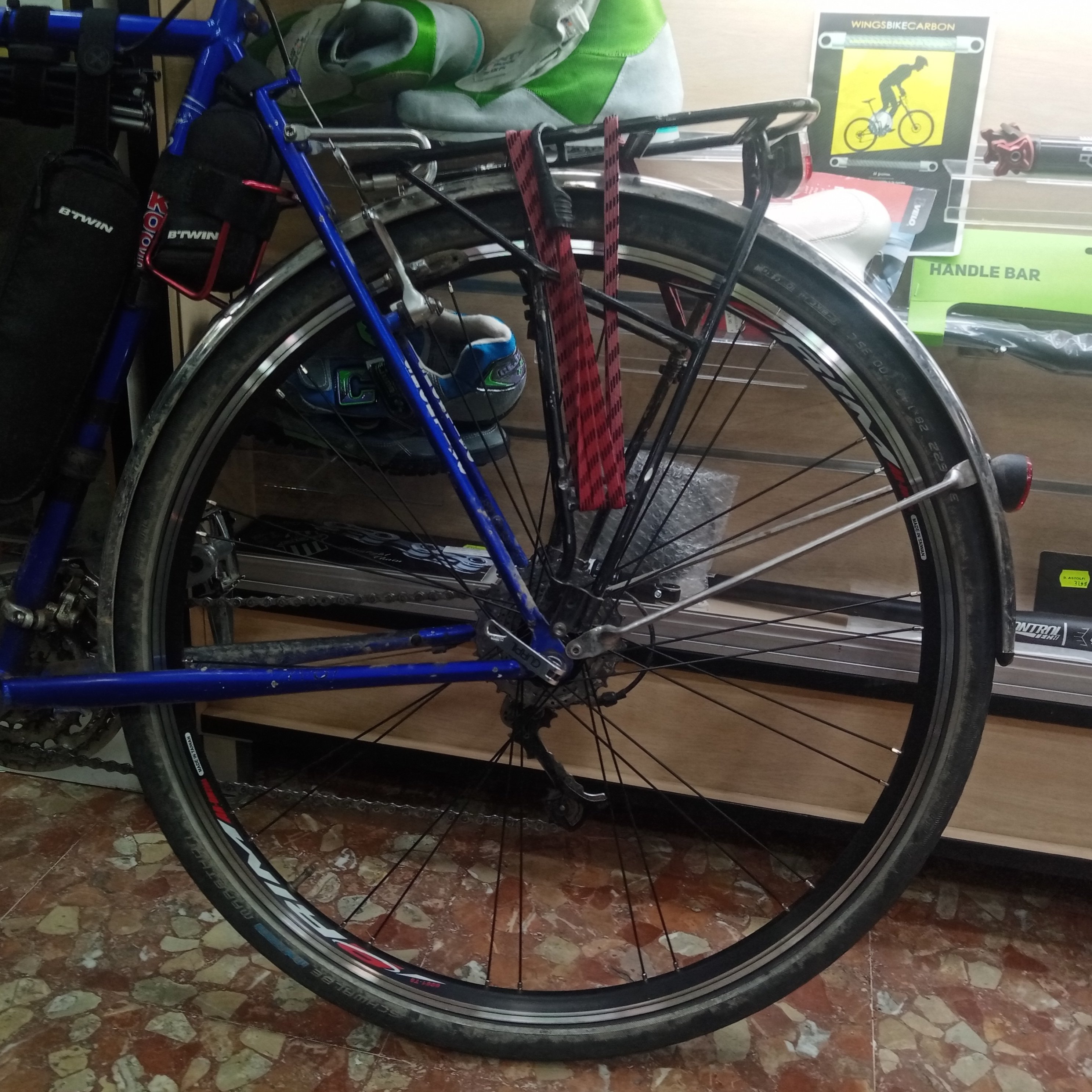 Dan weer in een andere fietswinkel toch iets aanvaardbaars gevonden, wat weinig spaken maar was al laat genoeg ondertussen.....