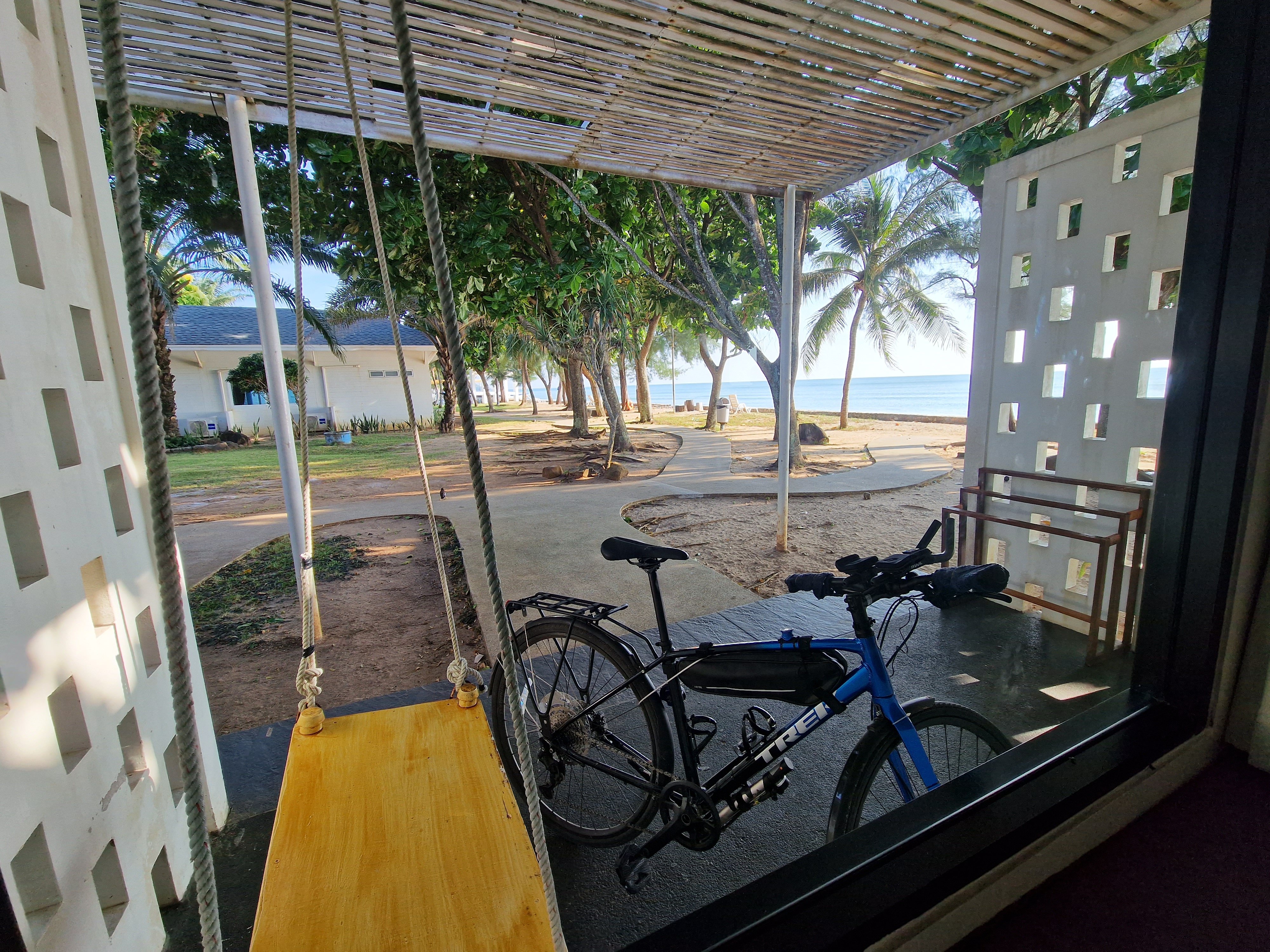 Tijdens een kleine pauze in een houten busprieeltje (je kan dit onmogelijk bushokjes noemen) eet ik nog een van de drie zelfgemaakte energy bars die So me had meegegeven uit bezorgdheid. Ondertussen tuur ik naar Google Maps om mijn eindpunt van de dag te bepalen en daar een hotelltje te boeken. Het wordt een strandresort aan Chao Lao beach. Daar boek ik weer een kleine bungalow – altijd makkelijk met de fiets: geen trappen, geen lift, fiets kan makkelijk mee op de kamer.
