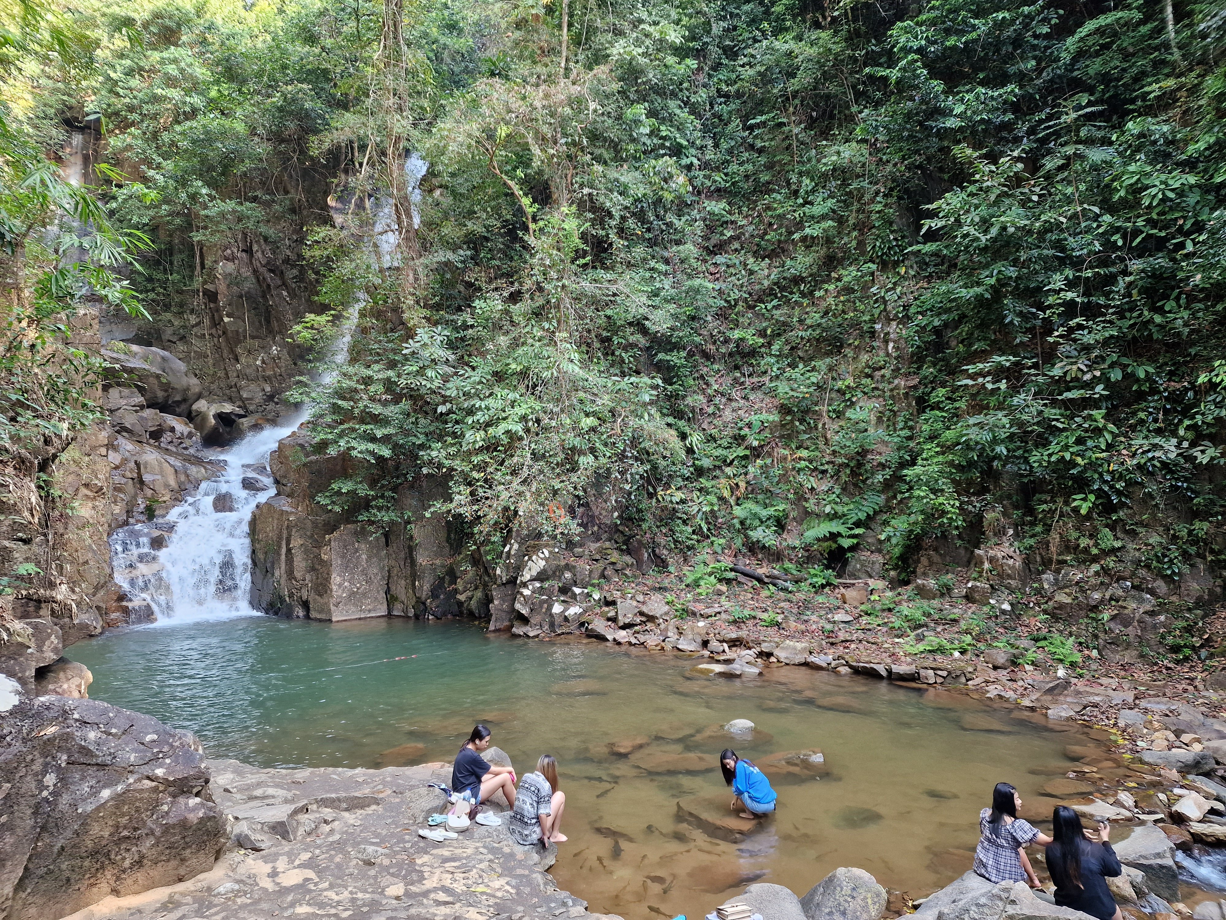 Namtok Trok Nong even verderop is mijn eerste stop voor vandaag. Op wat parkwachters na is er helemaal niemand. Opnieuw word ik verwezen naar een junglepad. Langs een helder kabbelend riviertje wandel ik de waterval tegemoet. Het pad is breed, maar het is duidelijk dat hier bijna niemand komt. Overal liggen onaangeroerde afgevallen takken. Het eindigt in een houten brugje dat zijn beste tijd heeft gehad. Het zil vol gaten en verschillende dwarsbalken lijken gebroken. Enkele dwarse bamboetakken voor het brugje lijken informeel te zeggen “do not cross”. Ik denk even na, schat het risico in en besluit er toch voorzichtig over te wandelen – ik ben niet van de zwaarste en het brugje is al bij al niet zo hoog. Ik bereik veilig de overkant. Wat verder staat een pijltje dat de waterval aanduidt, maar de weg ernaartoe is helemaal geblokkeerd met een dichte bos takken – een duidelijk signaal dat het pad gesloten is. Enigszins ontgoocheld wandel ik naar de rivieroever en rust ik uit op een groot rotsblok in de ochtendzon. De rotsen lijken een verzamelplaats voor heel wat kleurrijke vlinders. Dit maakt alles goed – wat een kleurenpracht! Daarbovenop wordt ik nog eens getrakteerd op grote scholen zwarte vissen in het heldere water. Wat een idyllische plaatje! Dat spoelt het zure gevoel van daarnet helemaal door.