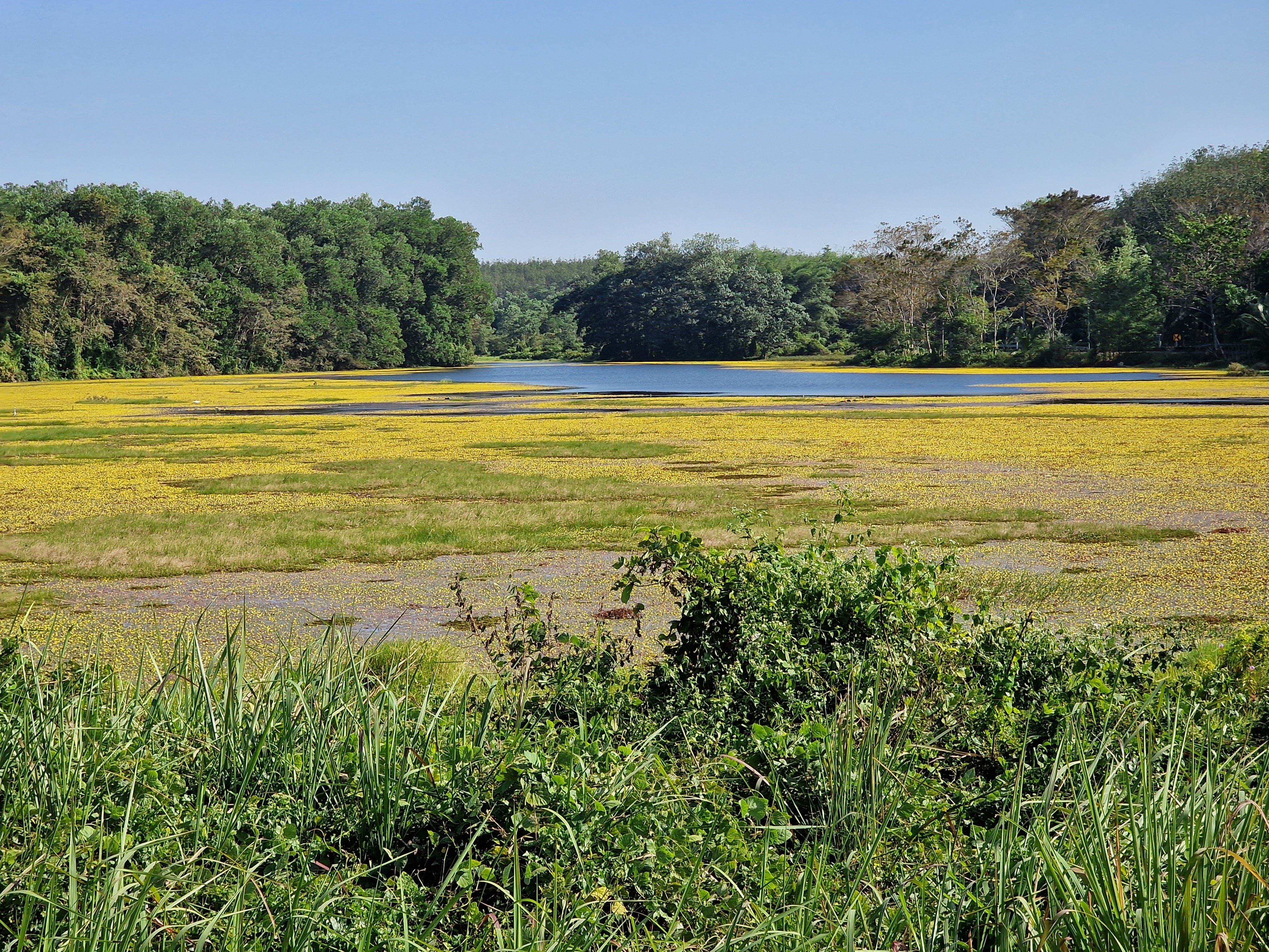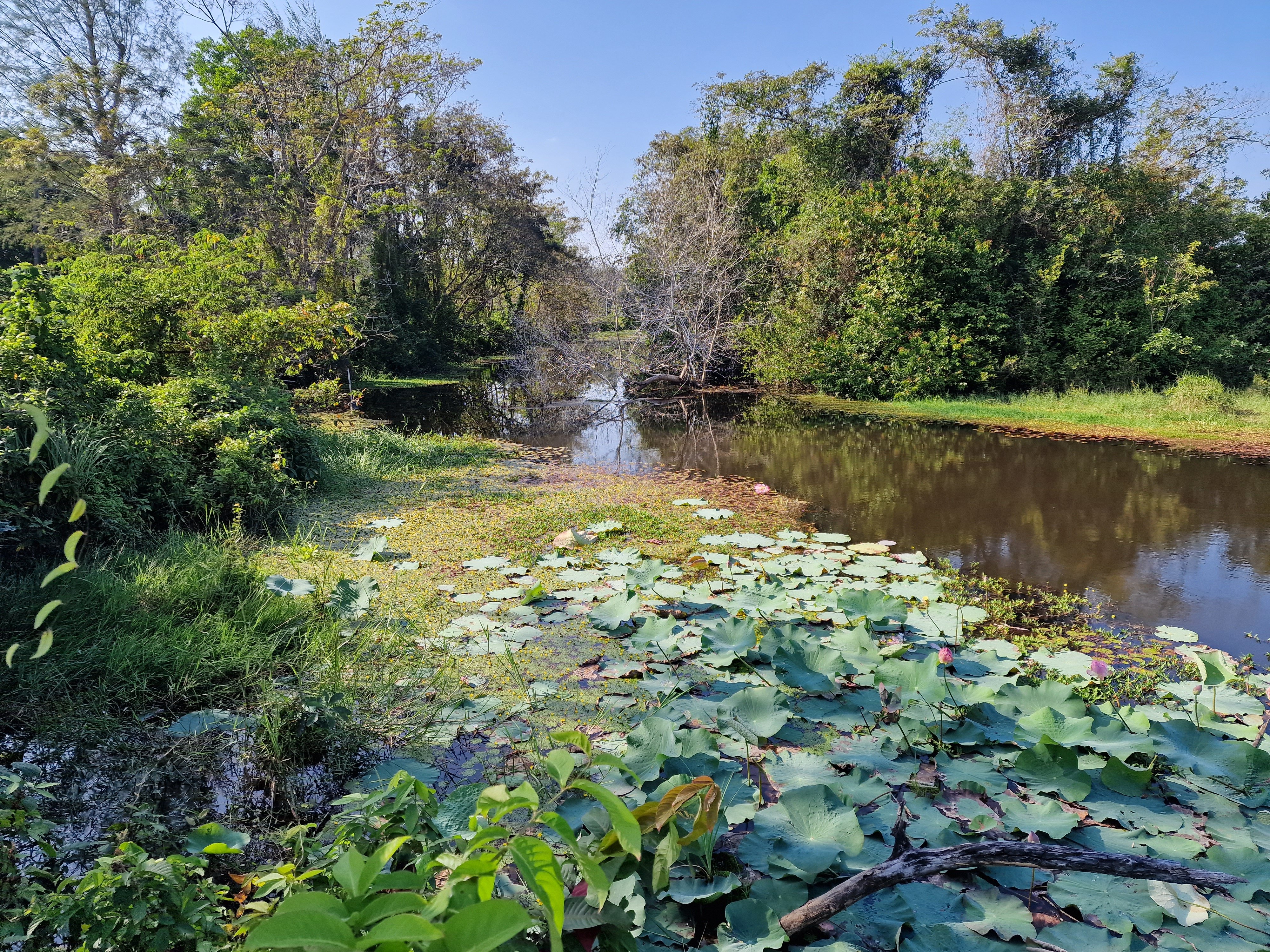 Al gauw bereik ik de westoever van Lake Sa Sisiat. Het stadje Trat ligt aan de oostzijde. Het leuke van dit stuwmeertje is dat het volledig omringd is door een vrijliggend fietspad dat afwisselend over het land en over het water loopt. Ik besluit het rondje van 10 kilometer nog mee te nemen vandaag. Ik kies de kloksgewijze rijrichting en vetrek. Ik ben een beetje overweldigd van de eenvoudige schoonheid van het landschap. Het stuwmeer heeft een grote diversiteit van ecosystemen, varierend van open water met talrijke watervogels, tot kalme zijtakken in de jungle en lokale ondiepe moerassen waarin gele zeeën van bloempjes drijven. Ik hoor mezelf luidop “wow, dit is f*cking mooi” zeggen. En dat is het. Ik geniet met volle teugen. Halfweg kom ik een tegenligger tegen – een westerling op een onbeladen racefiets. Hij maakt me duidelijk dat dit een éénrichtingspad is. Omdat er zo goed als niemand is besluit ik toch tegendraads te blijven rijden. Op drie vierden van de rit passeer ik het hotelletje dat ik voor deze nacht heb geboekt. Ik fiets er voorbij want ik wil het mooie rondje volledig afwerken en verder genieten. Wat is het hier mooi. Wanneer ik aan mijn beginpunt aankom maak ik rechtsomkeer en rij ik – eindelijk in de juiste rijrichting – traagjes naar het hotel. Ik rek de tijd een beetje – het is hier zo leuk.