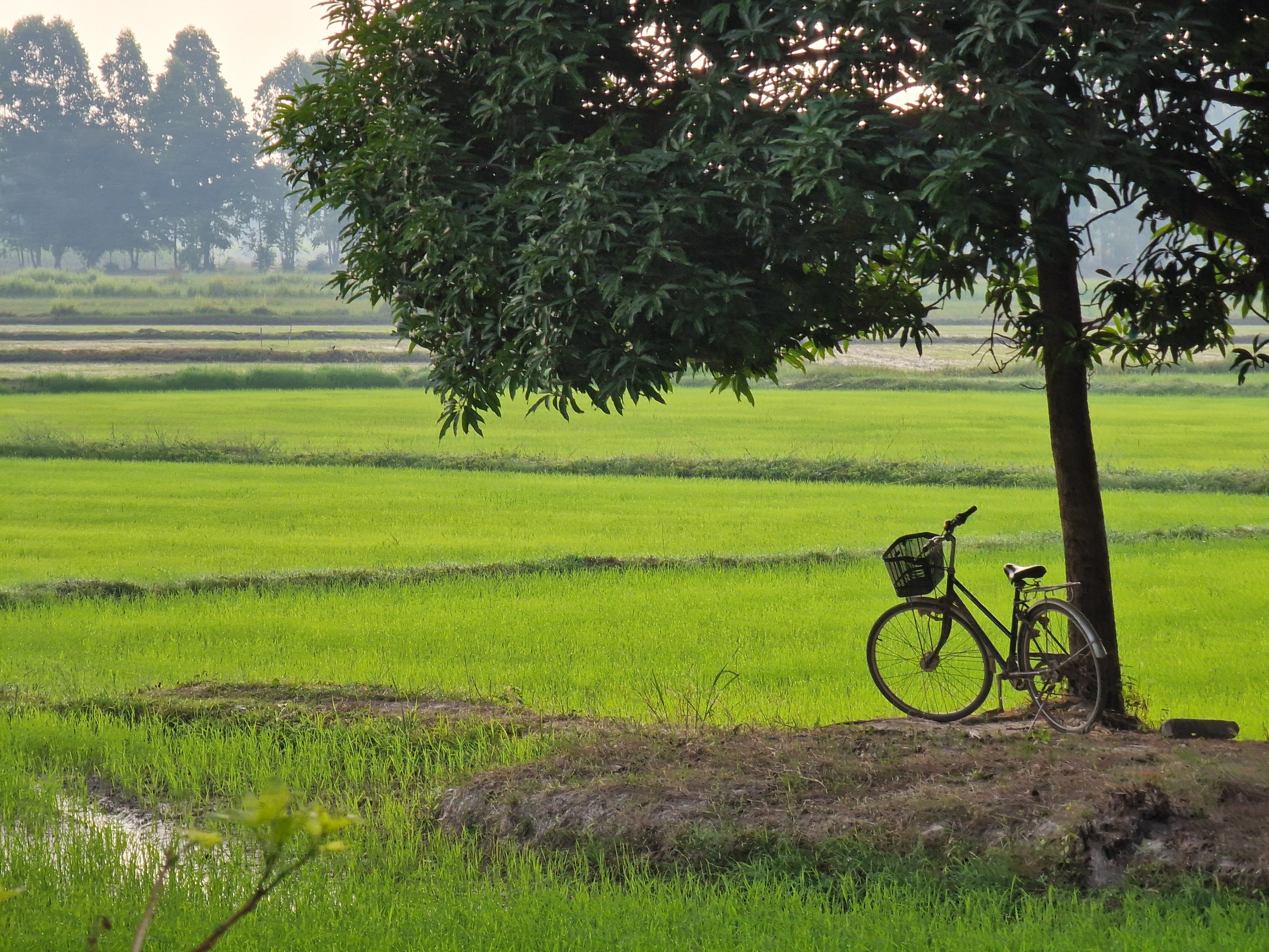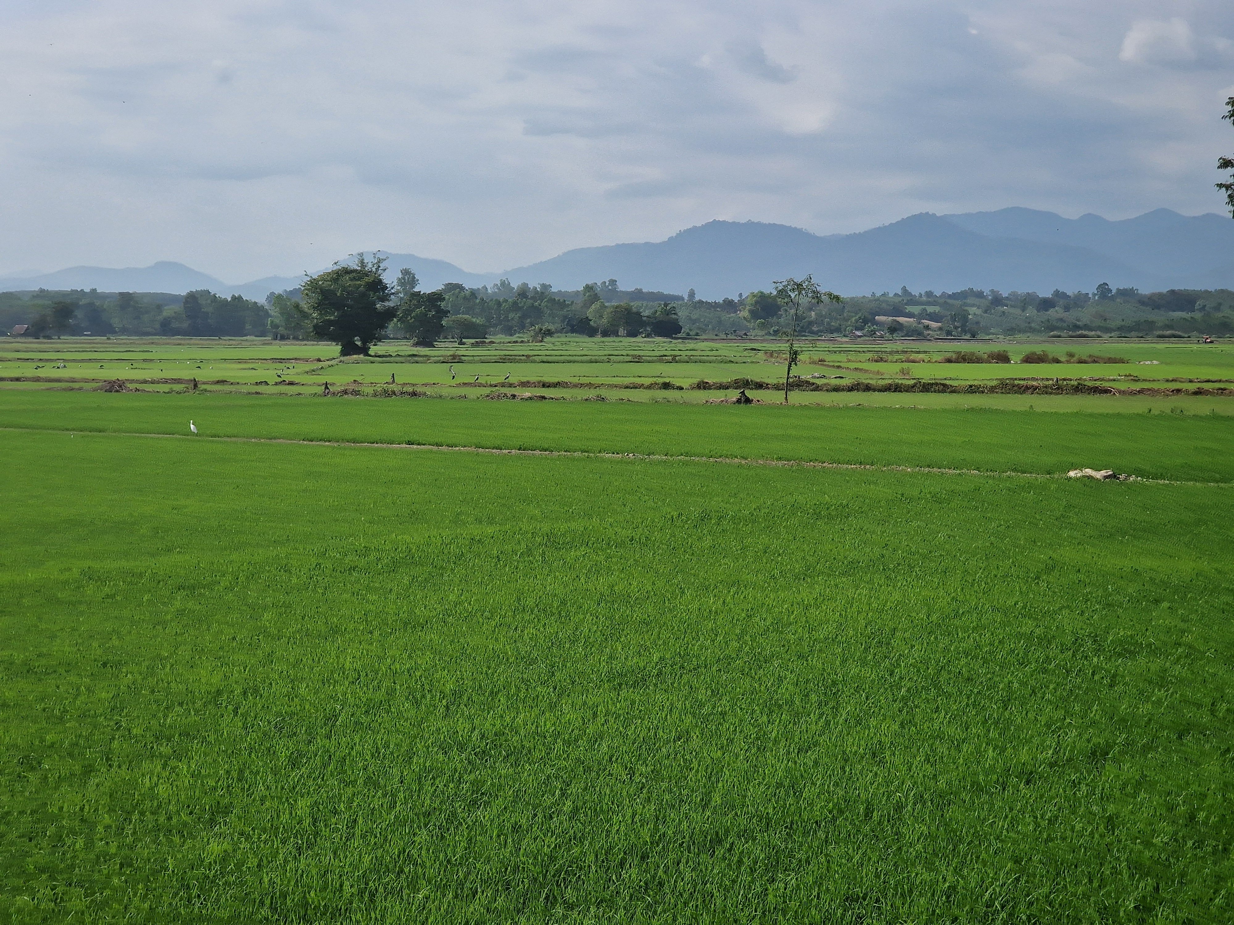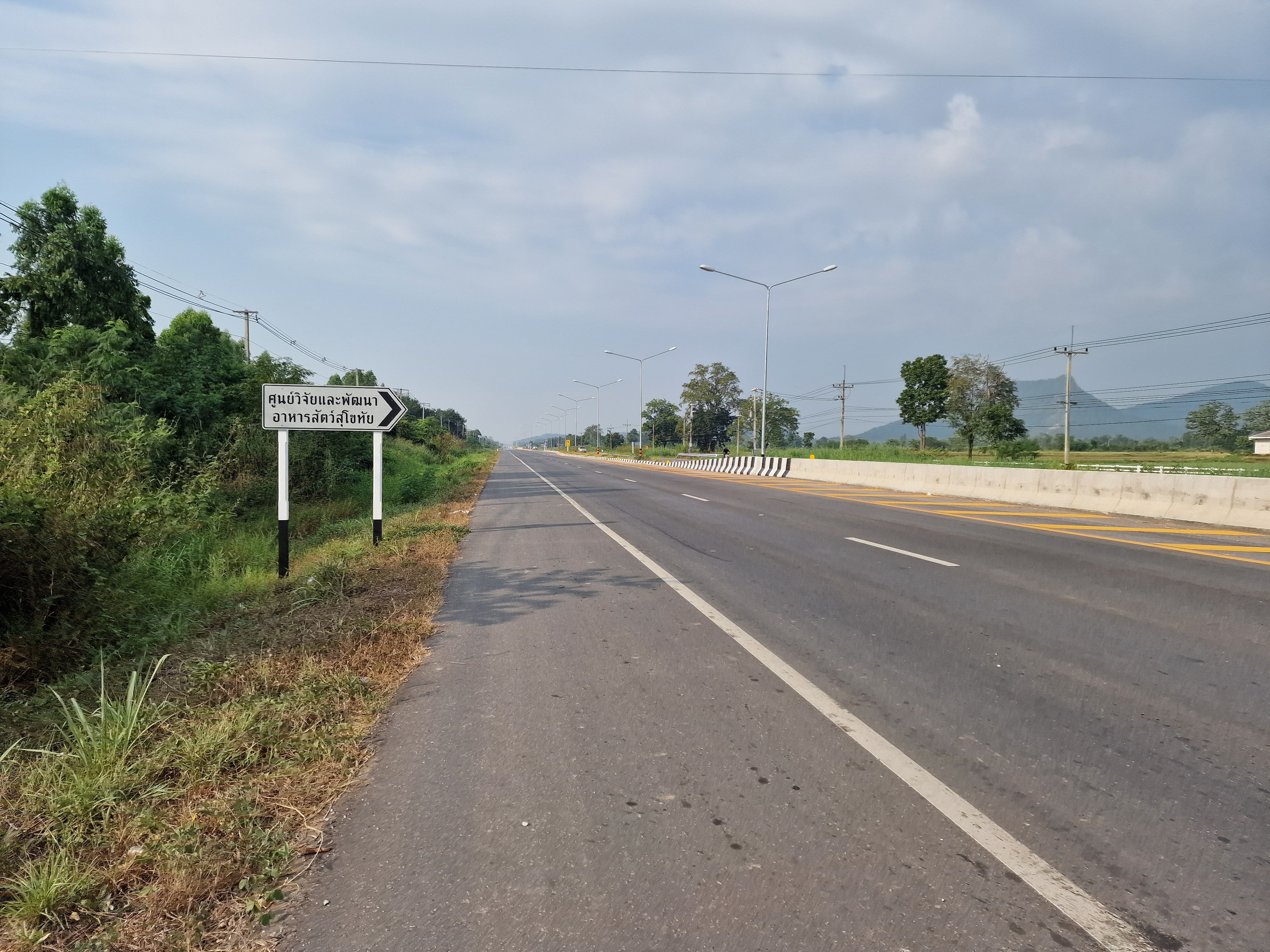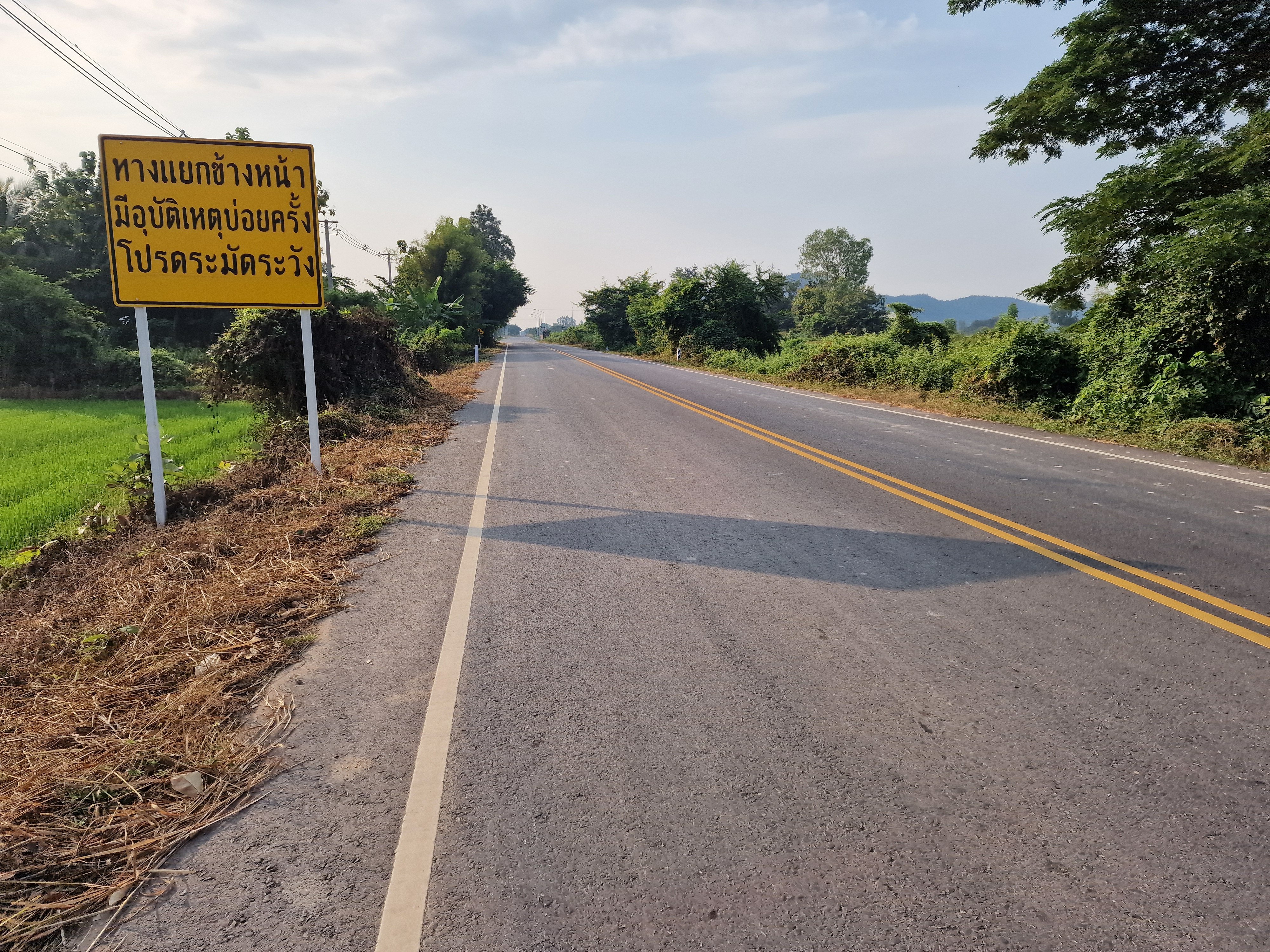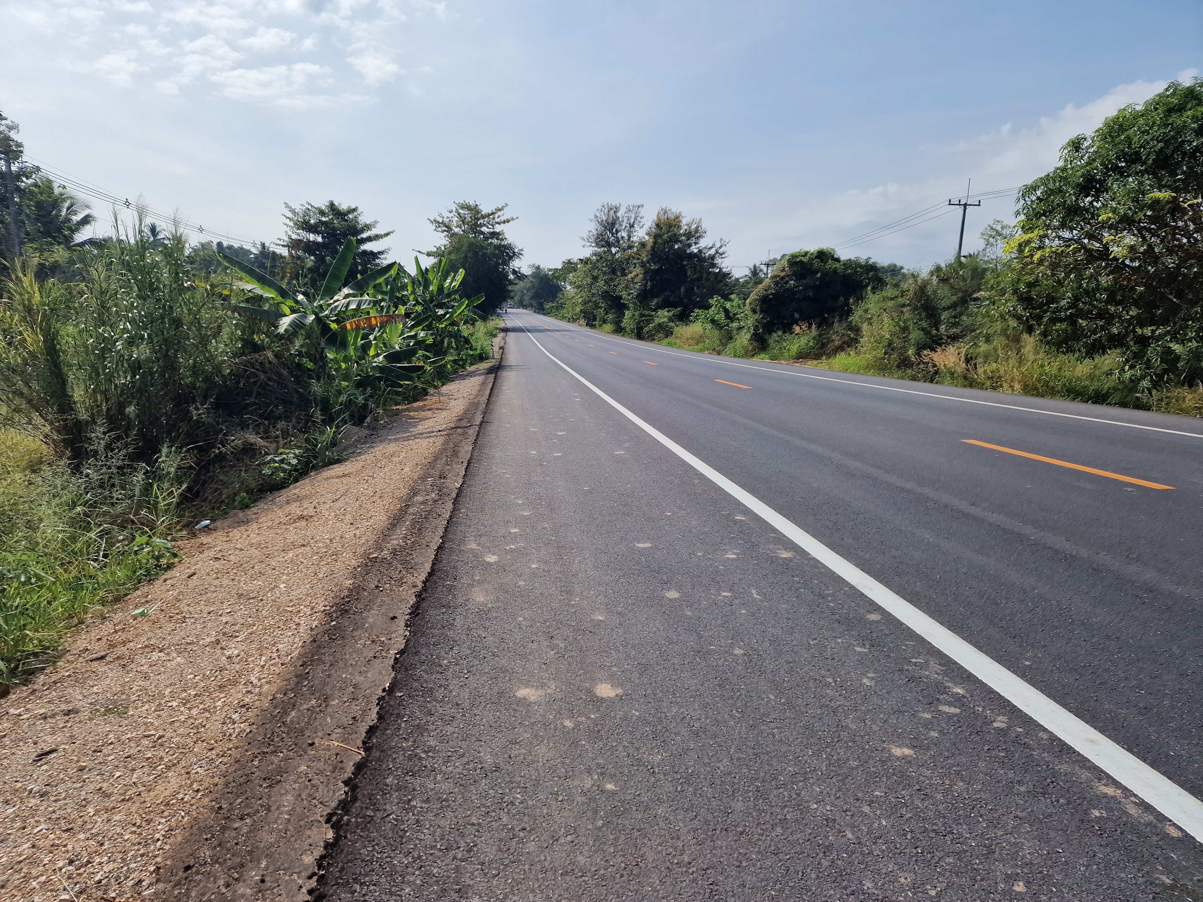 Via de strakke 3504 fiets ik zuidwaarts en laat de lange heuvelkam achter me liggen. Geen dog chases meer hier, de baan is breed genoeg, het weinige verkeer is te snel. Lekker op het ligstuurtje en draaien met de beentjes. Het landschap is vlak met rijstvelden en suikkerriet en beboste heuvels bij de horizon. Ik heb het eerder gezien, maar het verveelt niet – het is aangenaam fietsen. Zoals gewoonlijk is de kwaliteit van de weg top.