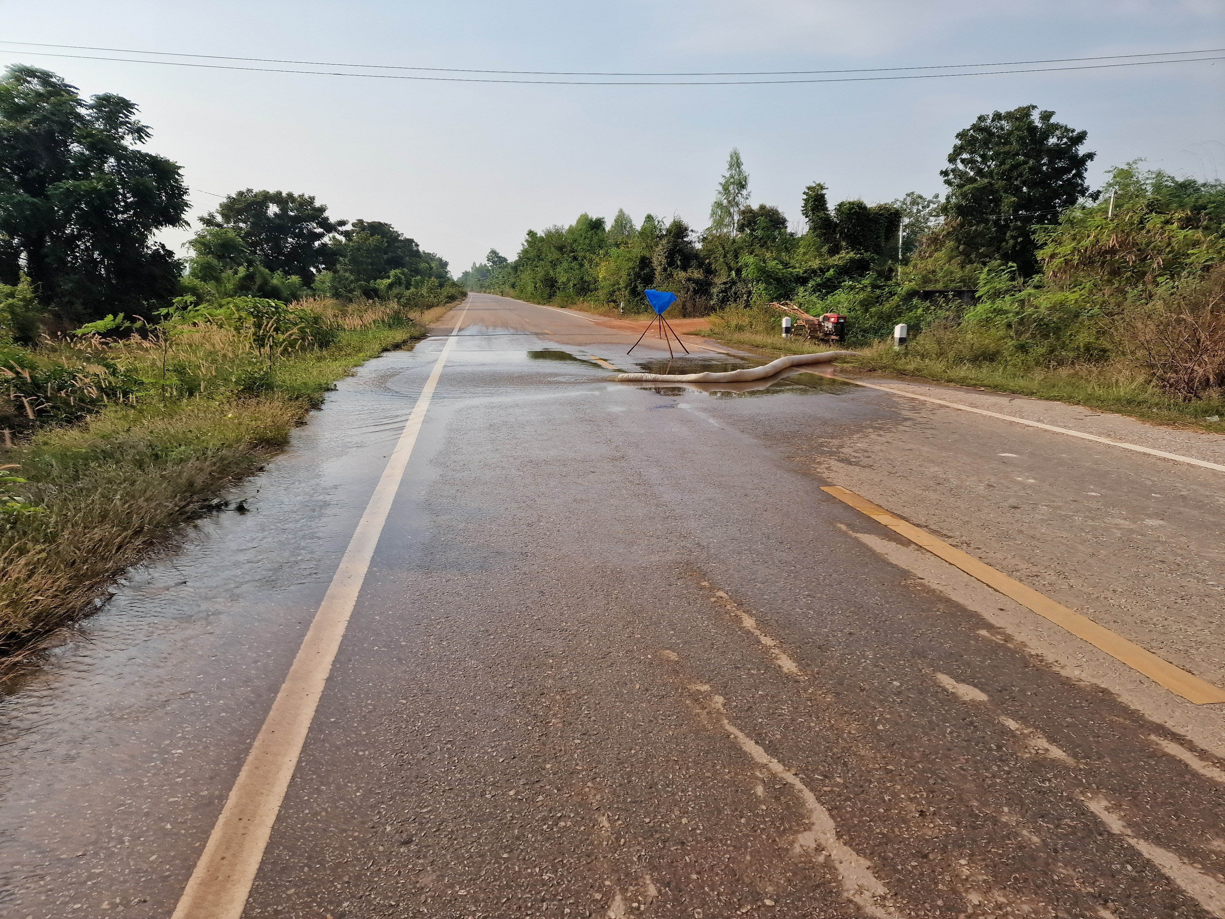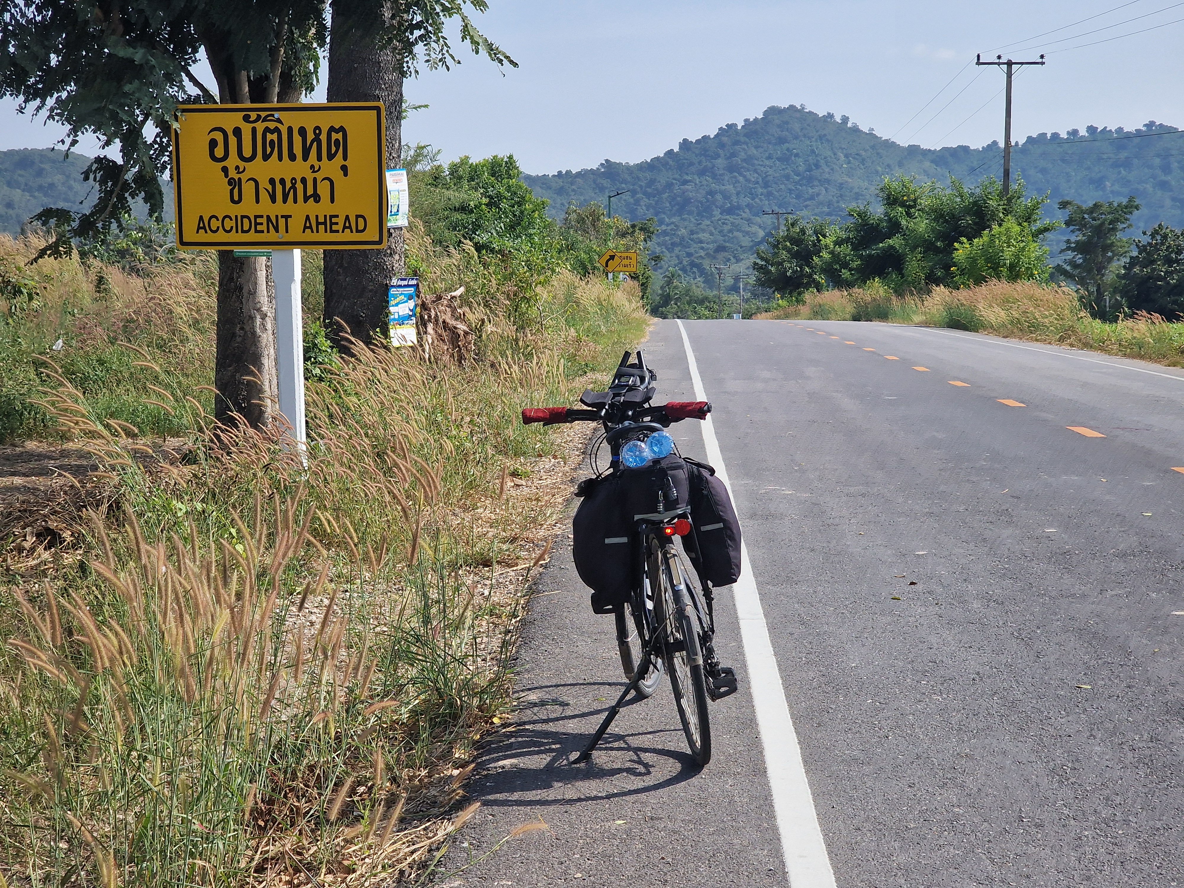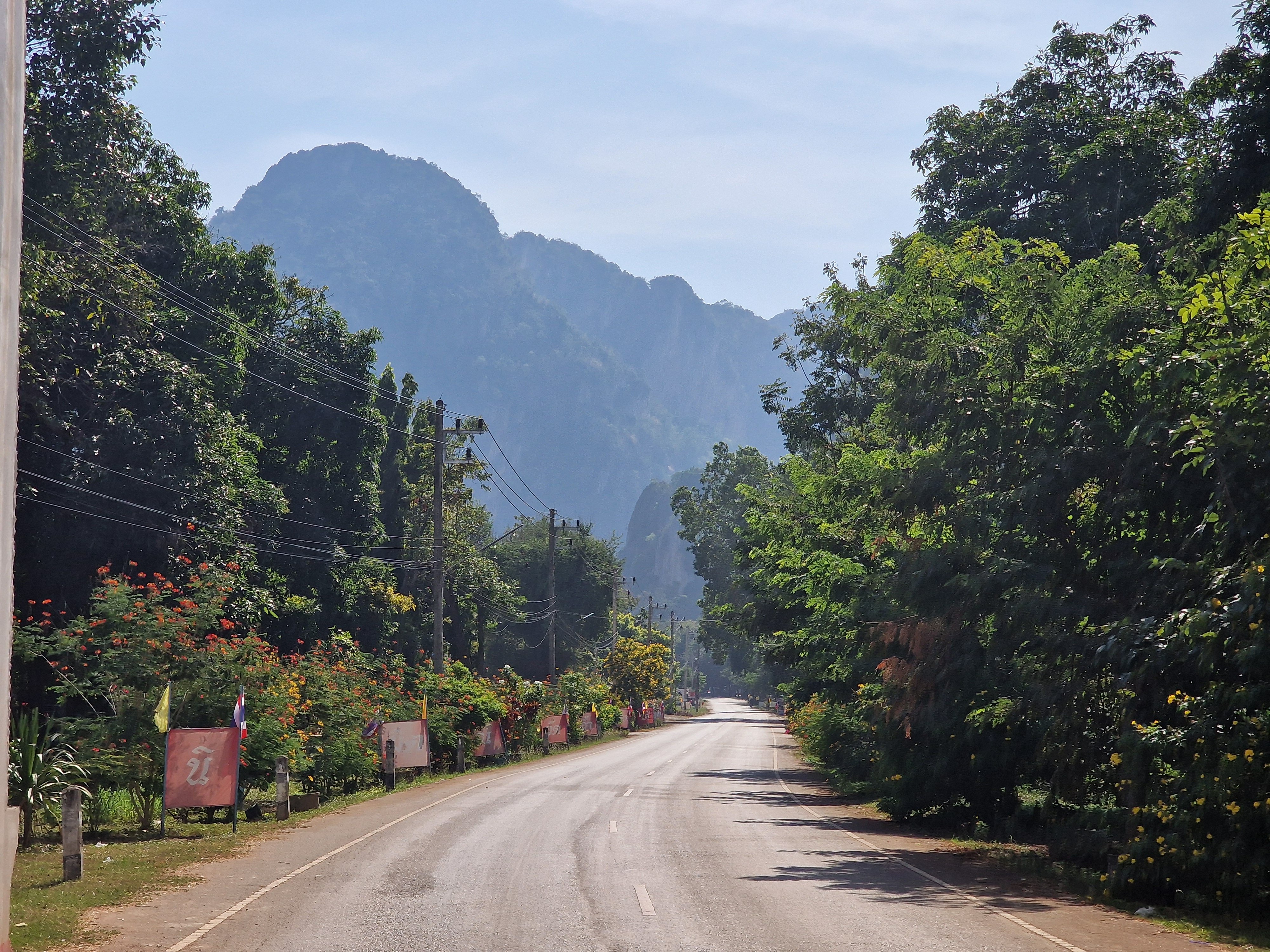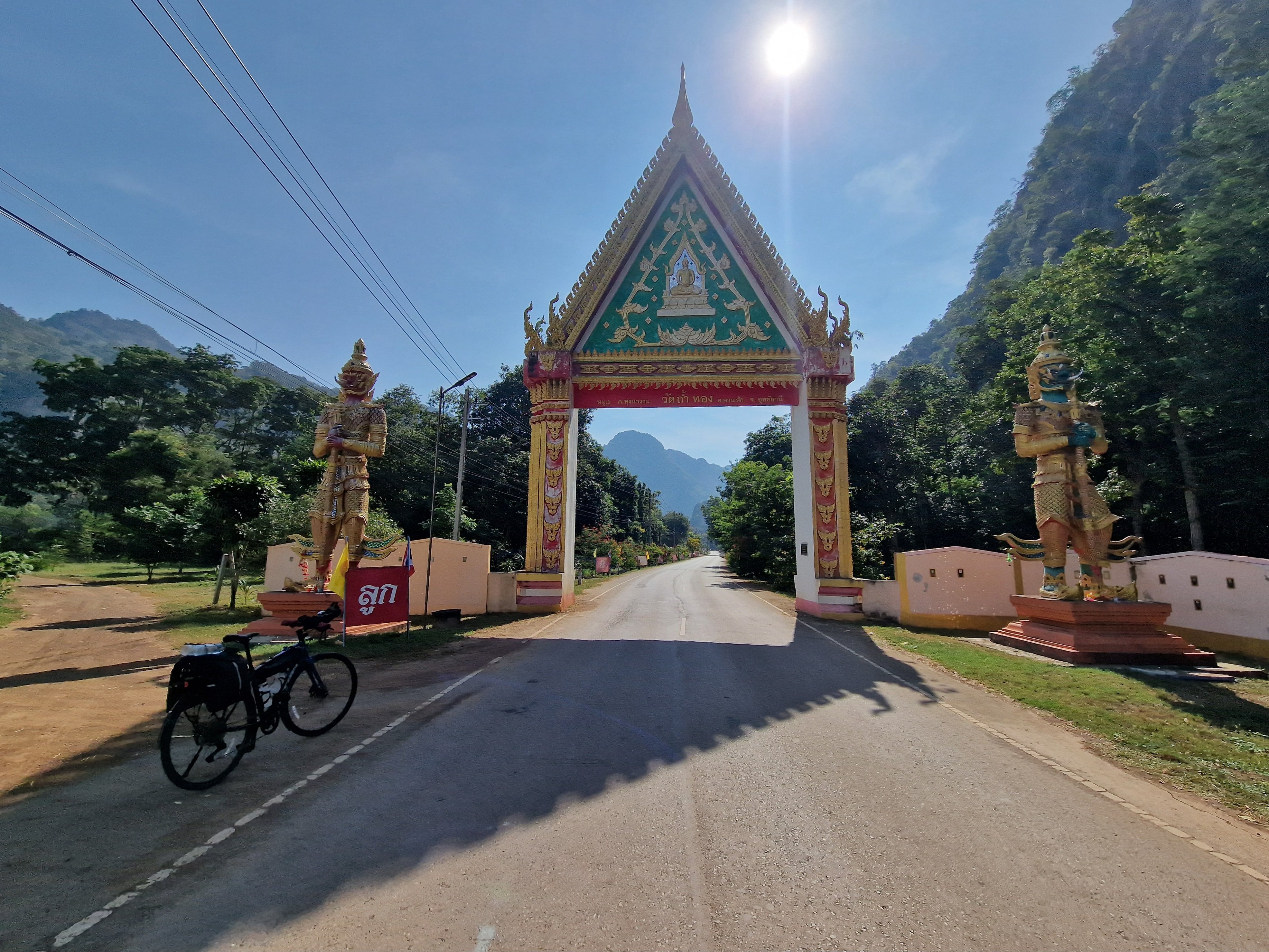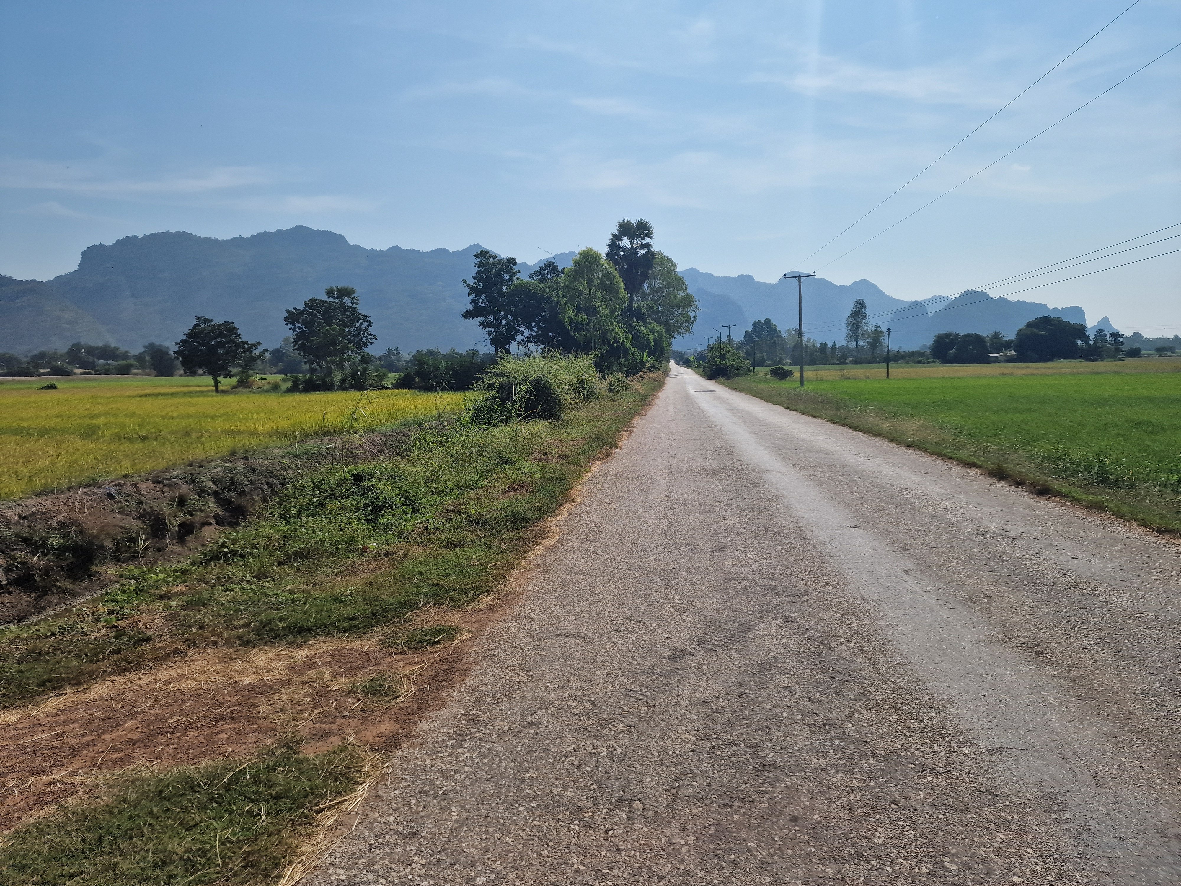Ter hoogte van Ban Khlong Koi neem ik de 3456 verder zuidwaarts tot die eindigt ter hoogte van de tweehonderd-meter-hoge steenpuist nabij het dorpje Pradu Yuen. Daar neem ik een kleine lokale weg die recht naar mijn bestemming leidt: het sterk geanticipeerde Hup Pa Tat. Lokale weg. Daar zijn ze weer. En dit maal in grote getale: ik word achterna gezeten door een achttal hysterisch blaffende honden. Ze willen niet onderdoen voor elkaar. Even de pedalen stilhouden vermindert soms hun jachtreflex. Niet vandaag. Een plots kort sissend SSSJJJJ maakt ook niet veel indruk. Dan maar zachtjes verder fietsen en een kalmerend tssjjj-tssjjjj-tsssjjjj proberen. Ze blijven me nog een tijdje volgen maar haken uiteindelijk af. Geen enkele had blijkbaar zin in mensenvlees. Dat komt goed uit. In de verte zie ik de rotspartijen van Hup Pa Tat verschijnen.