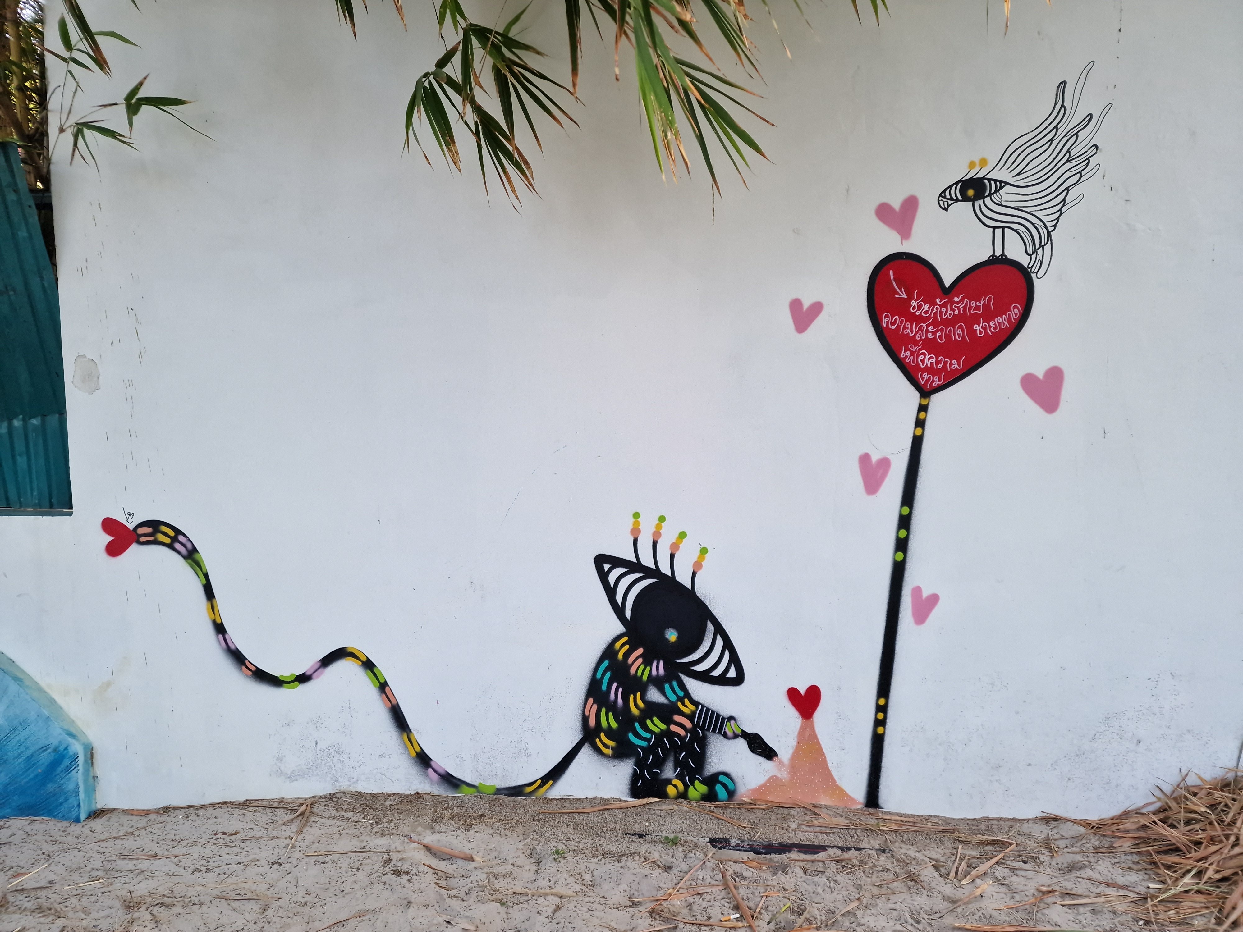 Deze graffitiartiest is actief in heel Huahin en daarbuiten. Overzal zie ik de mens- en vogelfiguurtjes met 'oogkop' opduiken.