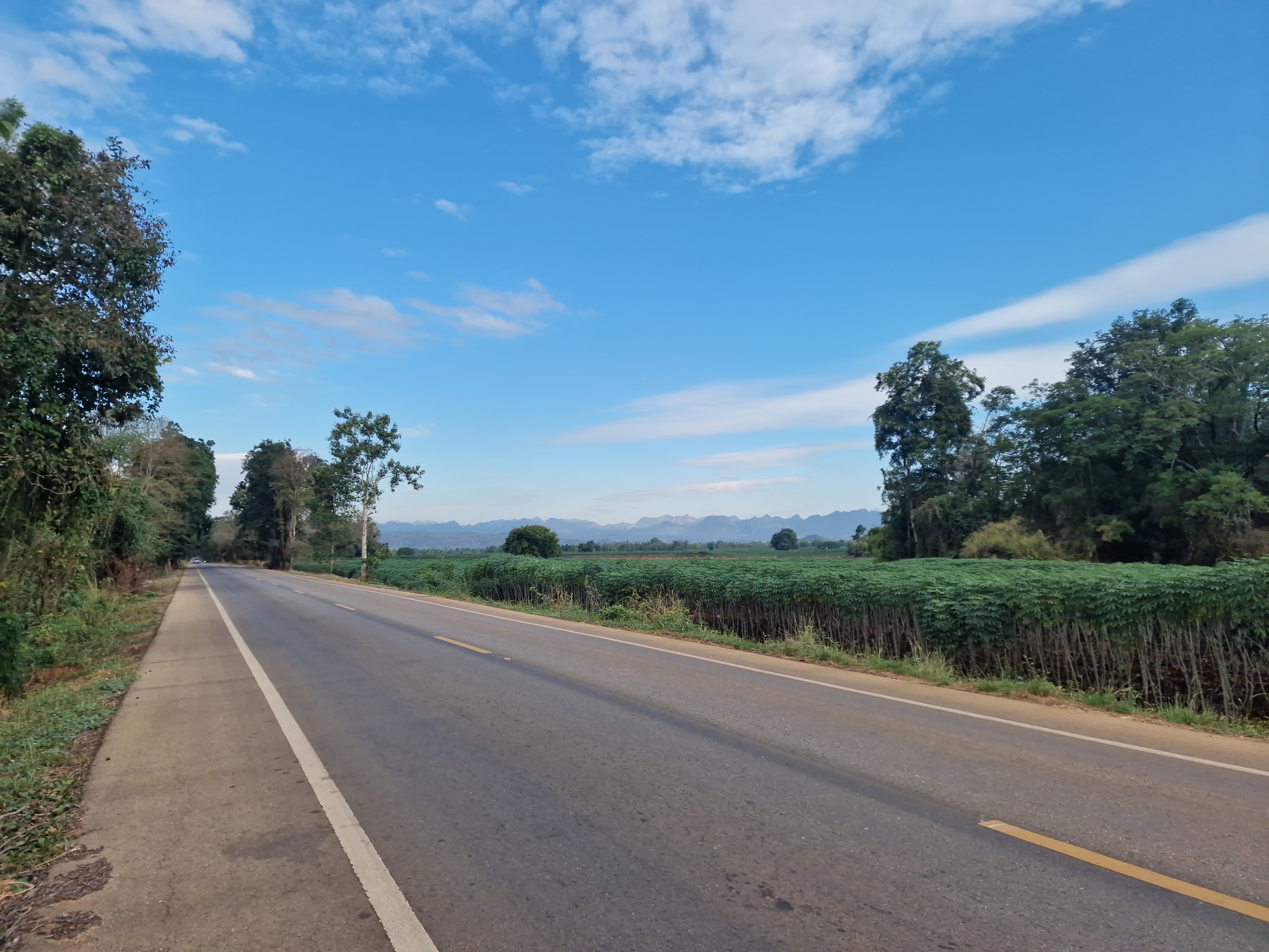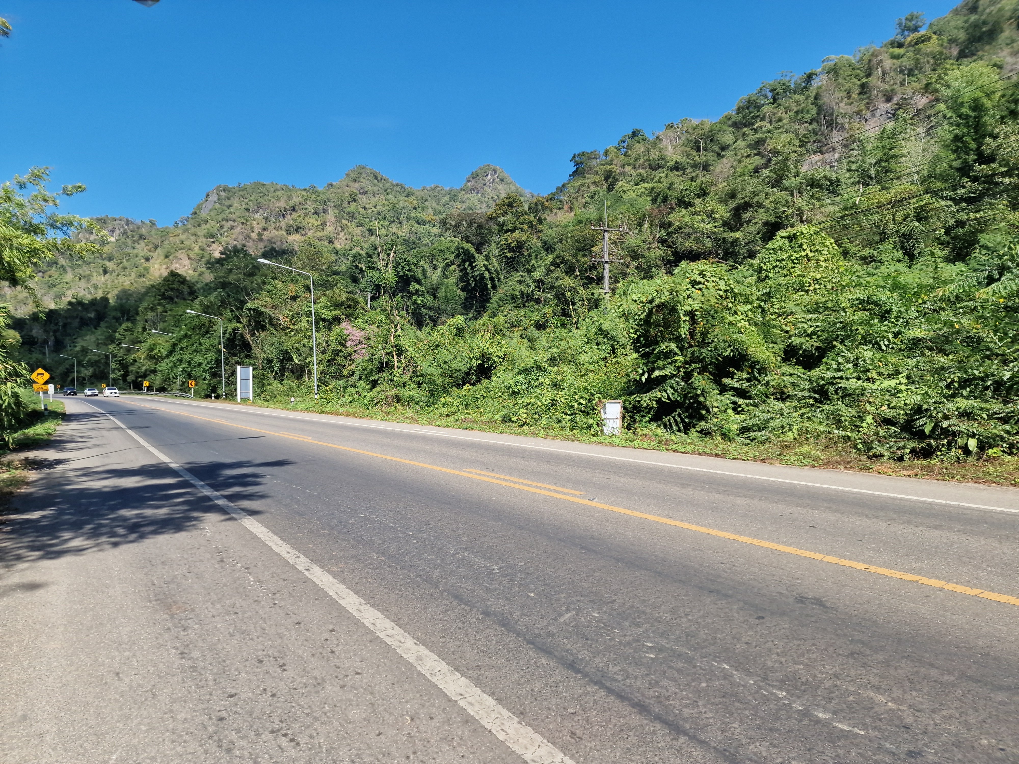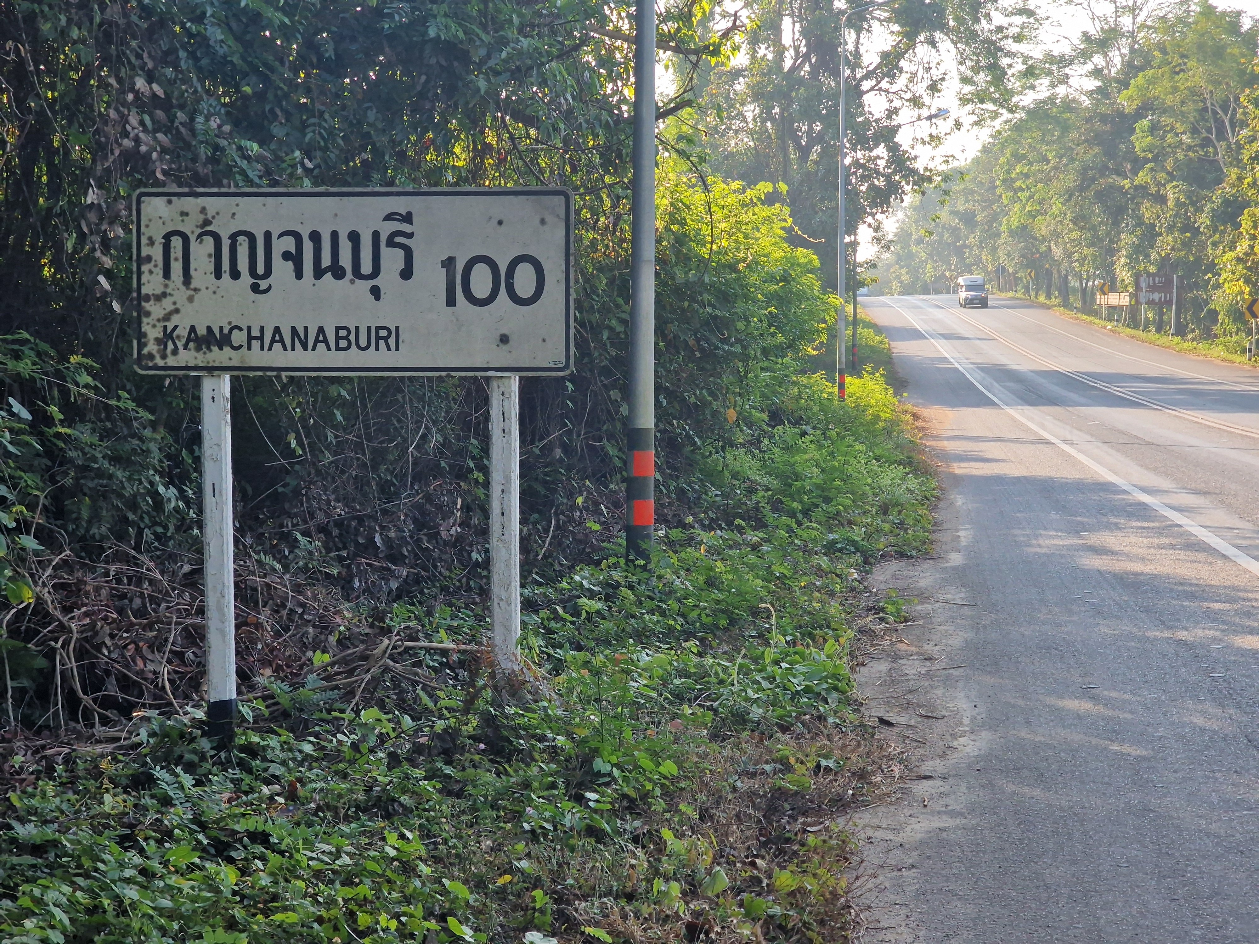 Ik ben nog maar net op de hoofdweg beland en ik zie de dagafstand verschijnen op een bord: ‘Kanchanaburi 100’. Dat zie ik wel zitten. De eerste 38 km fiets ik langs de 323, in de tegengestelde richting als twee dagen terug. De zachte klim naar de 330-m hoge heuvelrug zit er ook weer bij. Het groene heuvellandschap brengt me in een ‘good mood’; ik zit met de glimlach op de fiets. Even voorbij Sai Yok Noi verlaat ik de 323 en kies voor de kleinere, rustige 3457. Die leidt me doorheen een dal tussen 600-m hoge heuvels, badend in de ochtendzon. Ik geniet, maar vergeet te stoppen voor een foto. Je moet me dus maar op mijn woord geloven.