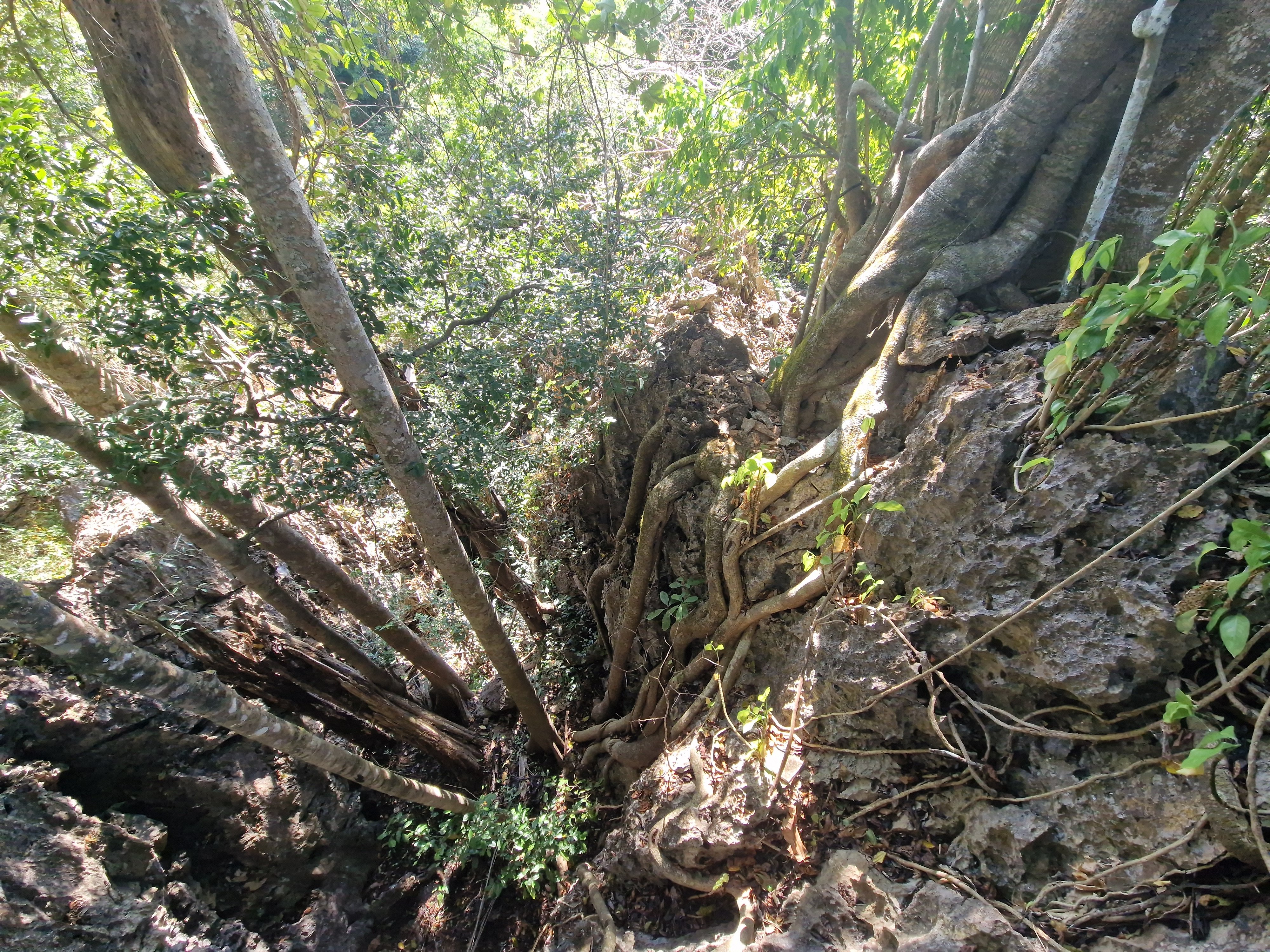 Op weg naar de bat cave - een feest van groen, wortels en rotsen.