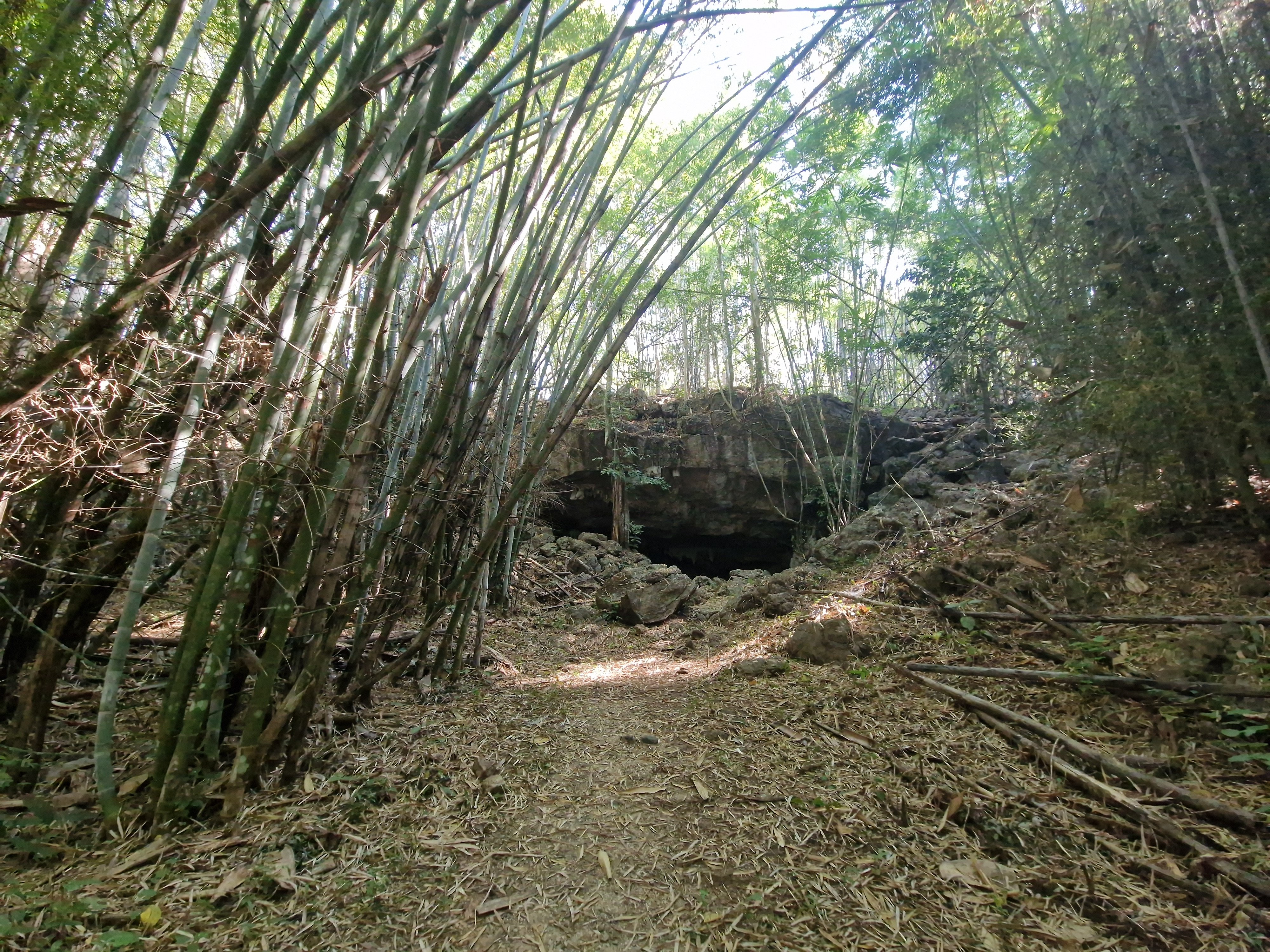 Eindelijk bereik ik het gapende gat van de bat cave in het bamboewoud.