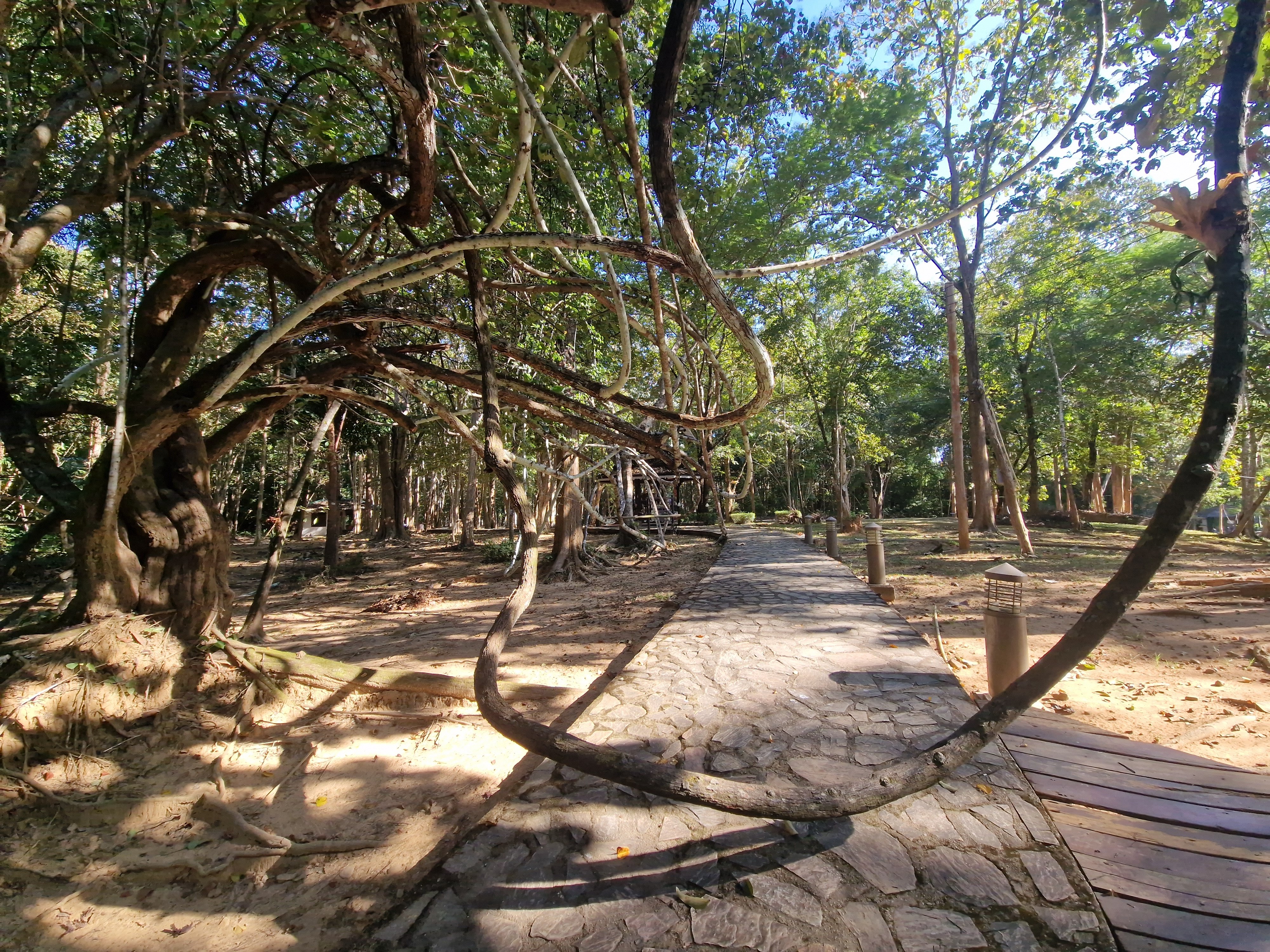 Met Jugendstiliaanse elegantie slingert deze boom/liaan zich over het pad.