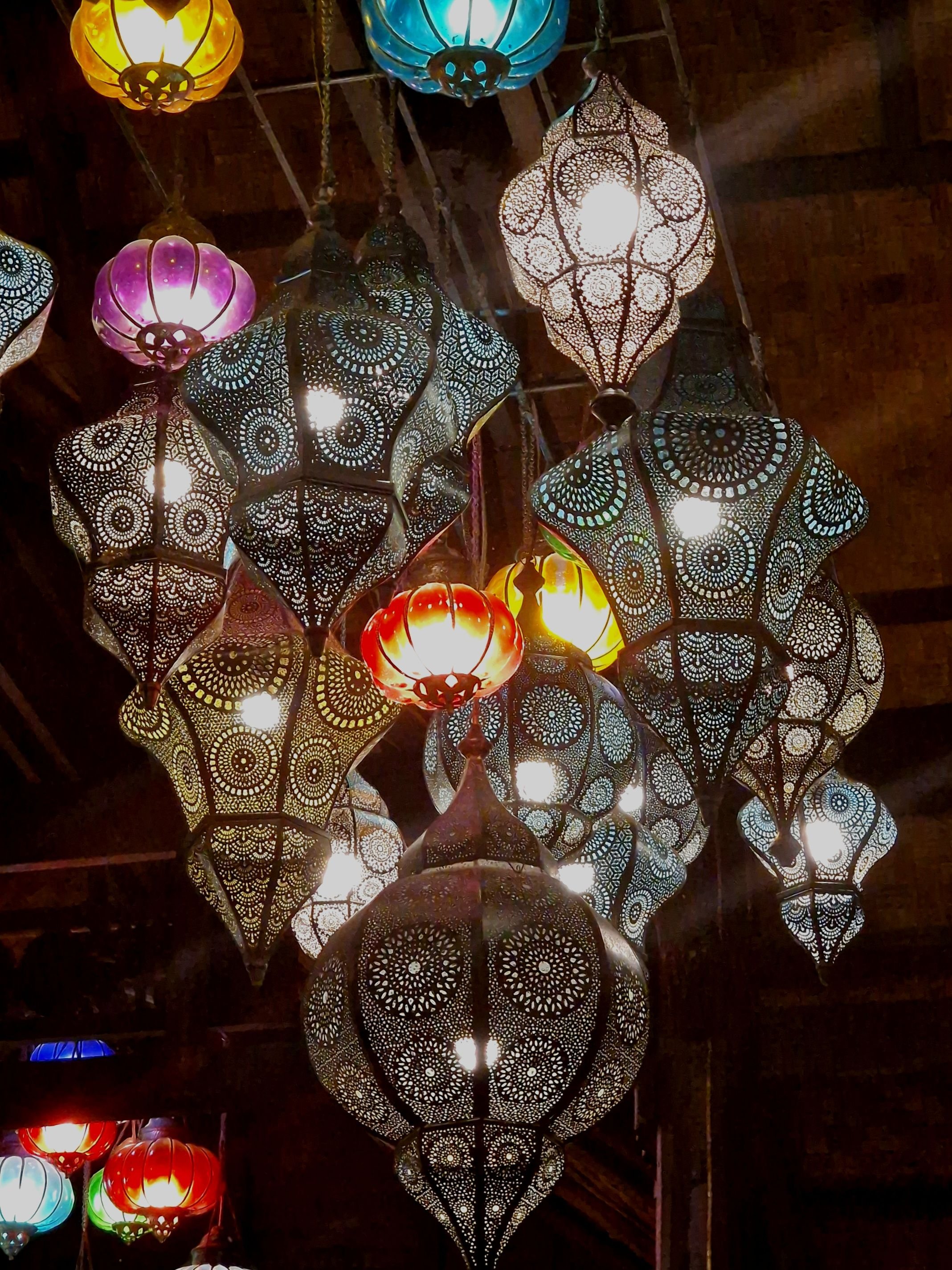 Opvallende verlichting in het restaurant.