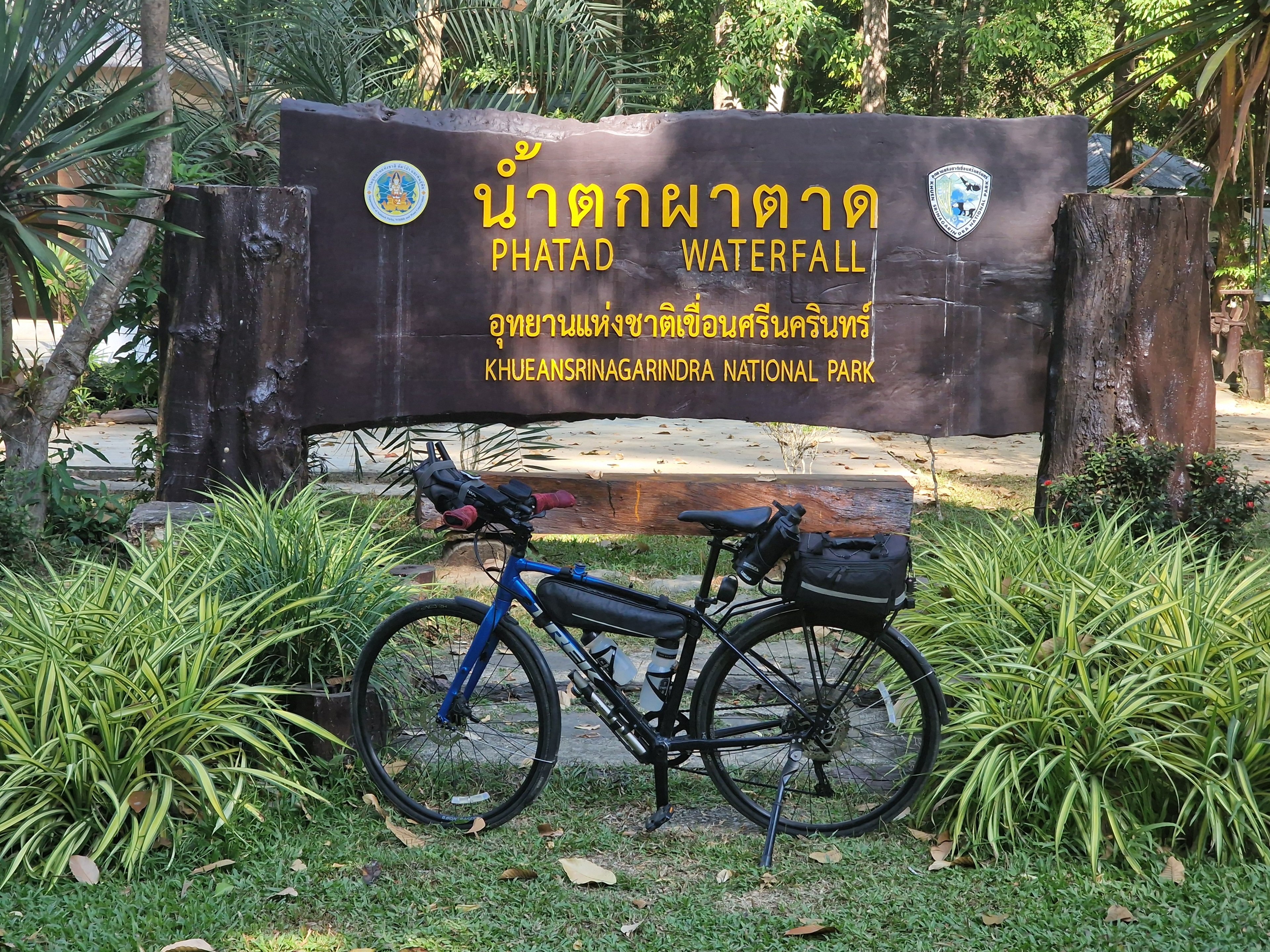 Ik gooi me terug op de hoofdweg richting Sangkhla Buri en die is wat saaier dan gedacht. Na een dertigtal kilometer kies ik een zijweg die me naar de Phatad waterval zal leiden. Google had me reeds getoond dat dit wel een aardig stukje natuurschoon is, maar eerlijkheid gebied me te zeggen dat ik hier ook mijn ‘Patat’-collectie mee wil vervolledigen. Vorig jaar bezocht ik Hup Patat en Pha Tat cave (op DEET3). Nu komt Phatad Waterfall aan de beurt. Het zijwegje golft doorheen een mooi landschap en de huizen worden schaarser. Wanneer ik het Khueansrinagarindra nationaal park binnenfiets wordt het relief heel stevig, met hellingen tot 14%. In de lichtste versnelling duw ik mezelf naar boven. Staand op de pedalen, met ritmische halve pedaalslagen. Bij elk dood punt van de pedalen sta ik bijna stil. Mijn snelheid daalt tot 3 a 4 km per uur – net genoeg om mijn evenwicht te behouden. Maar het blijft leuk, want dat gezapige tempo put me niet uit. En er zijn geen honden.