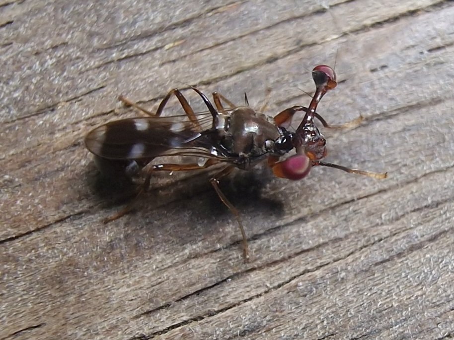 Na een steile afdaling bereik ik de officiële ingang van het park. Een verschrikte parkwachtster stopt met bladeren vegen, kruipt in haar loket en verkoopt me haar eerste ticket van de dag. Het moet wellicht niet gezegd, maar het is hier rustig, meer nog, vredig. Ik heb tijd zat vandaag, dus ik slenter rustig naar de watervallen. Ik geniet van de rust en het eeuwige geruis van de vele cascades. Ik tracht nog wat insecten te spotten, maar dat is niet zo’n groot succes. Ik vind wel een merkwaardig steeloogvliegje. Omdat er geen alternatieven zijn fiets ik via exact dezelfde weg terug naar River Kwai Paradise hotel, waar ik de rest van de dag wat luier.