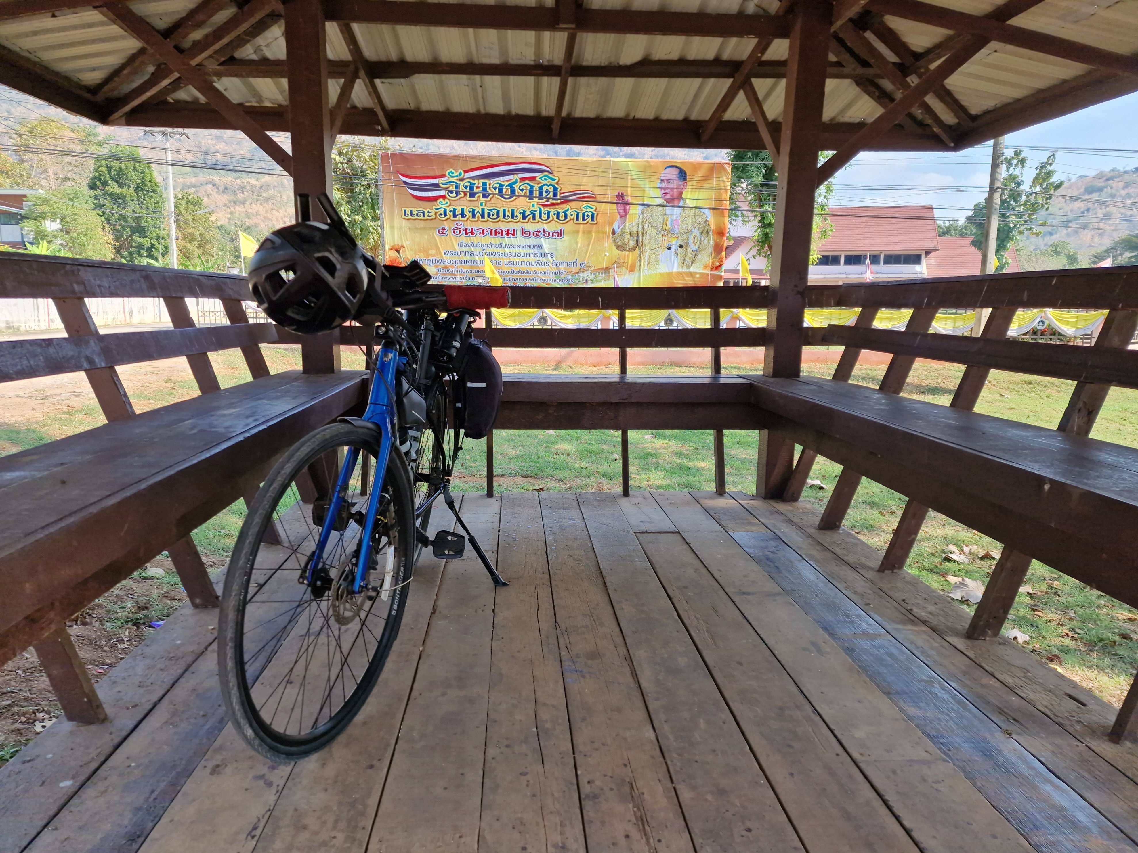 Altijd handig, die busprieeltjes. Onder het goedkeurend ook van wijlen koning Bhumibol eet ik een energy bar.